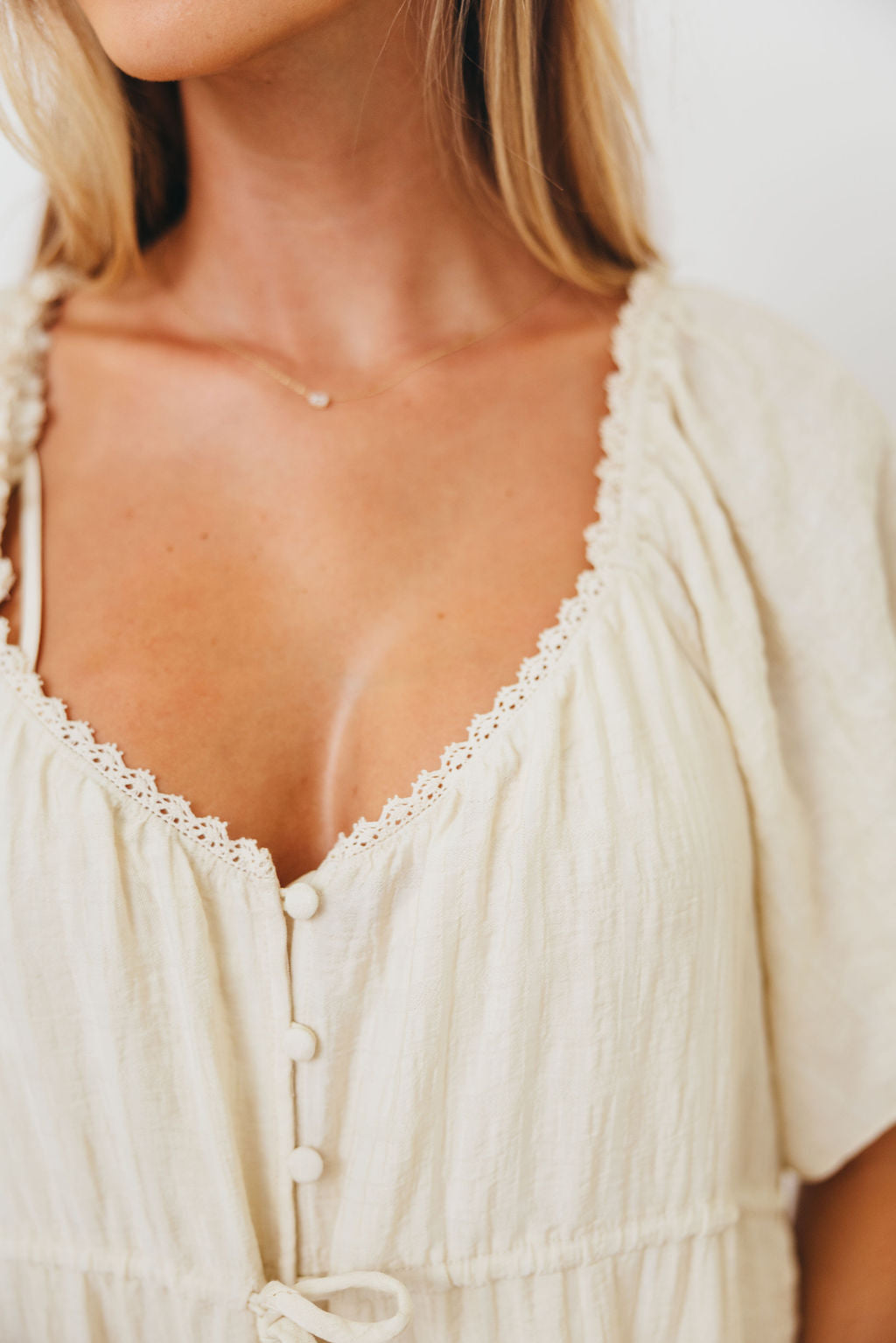 GARMENT DETAILS: Lightweight woven maxi dress with sweetheart neckline, flowy short sleeves, and eyelet trim. Finished with a self-tie waist detail and tiered skirt.