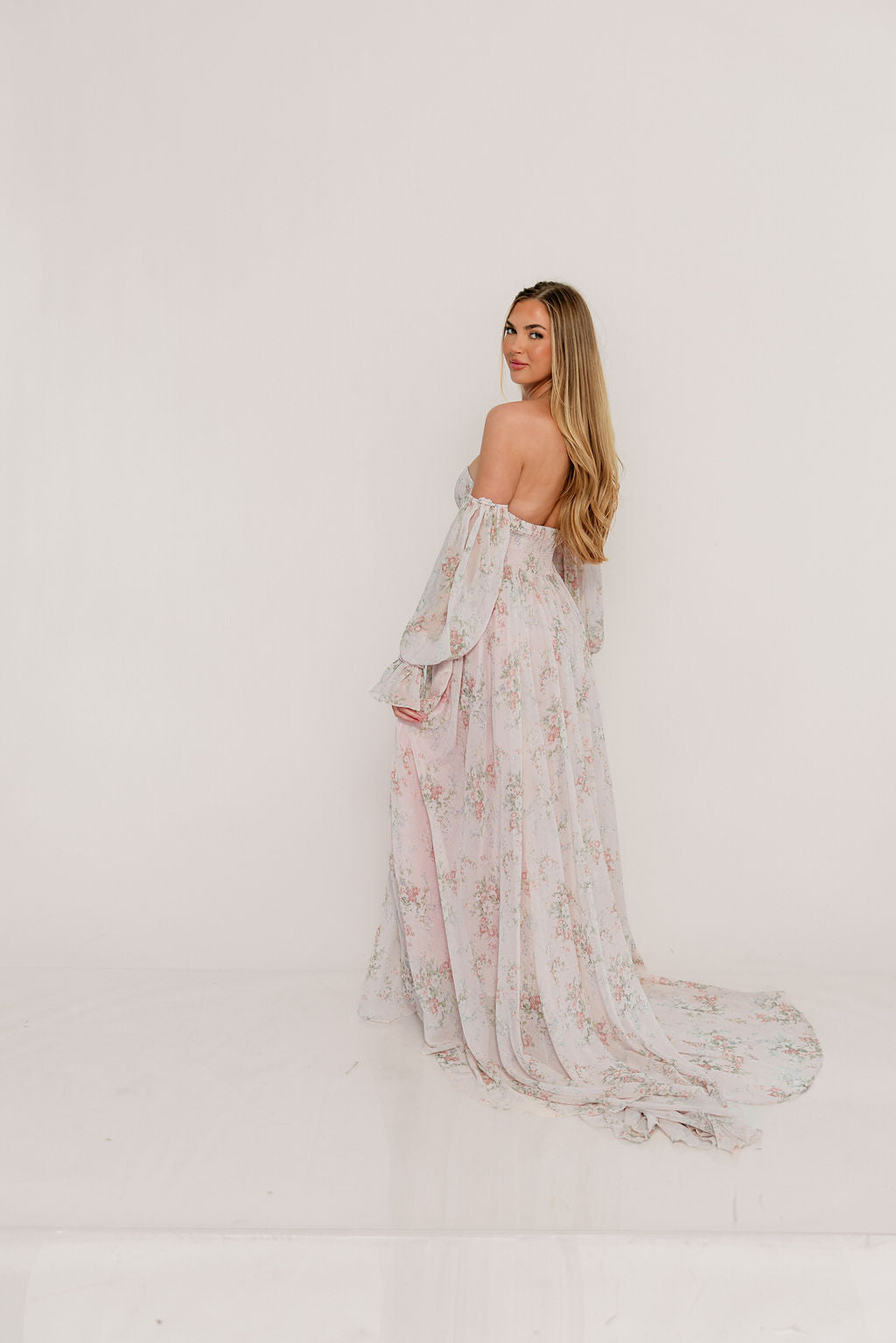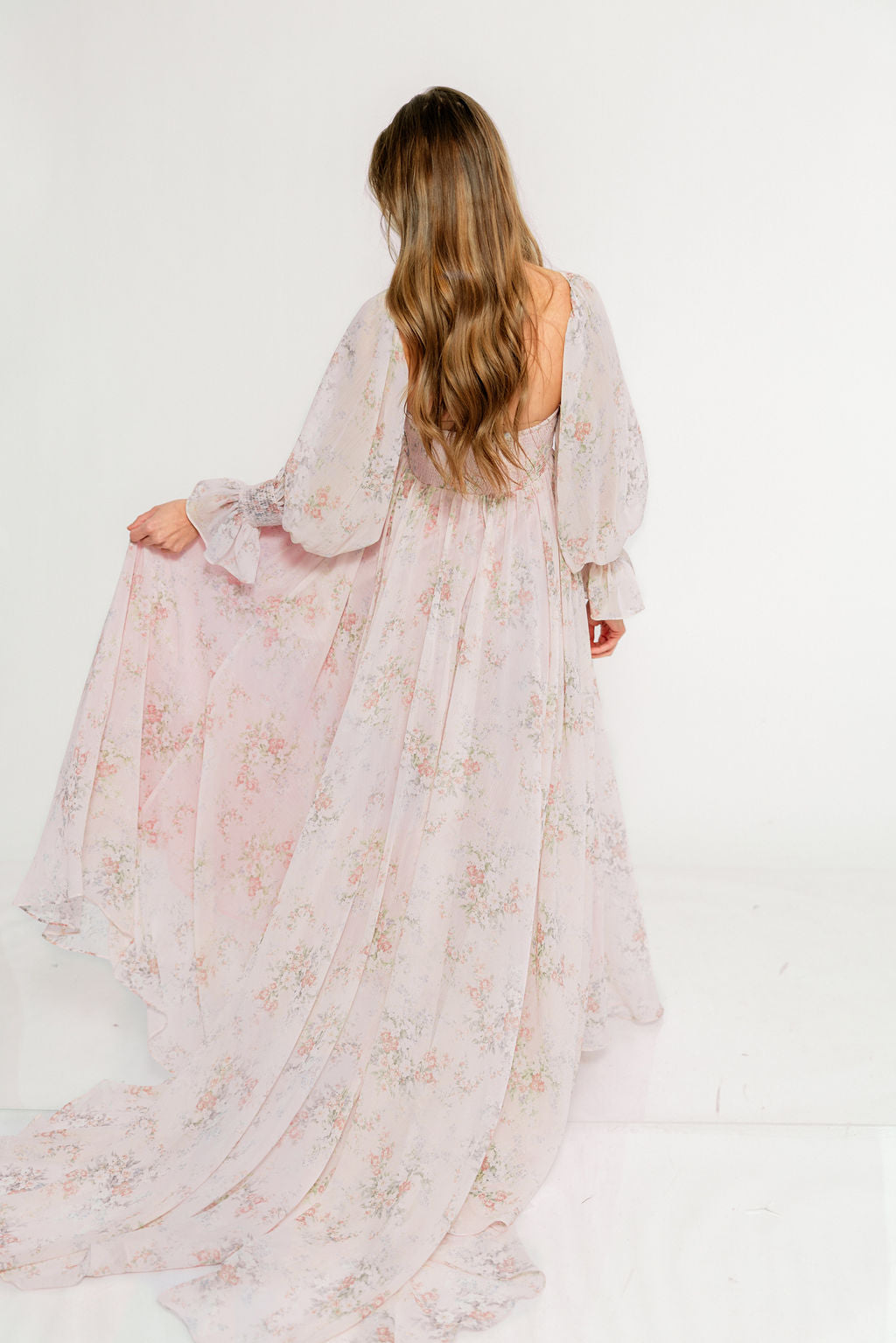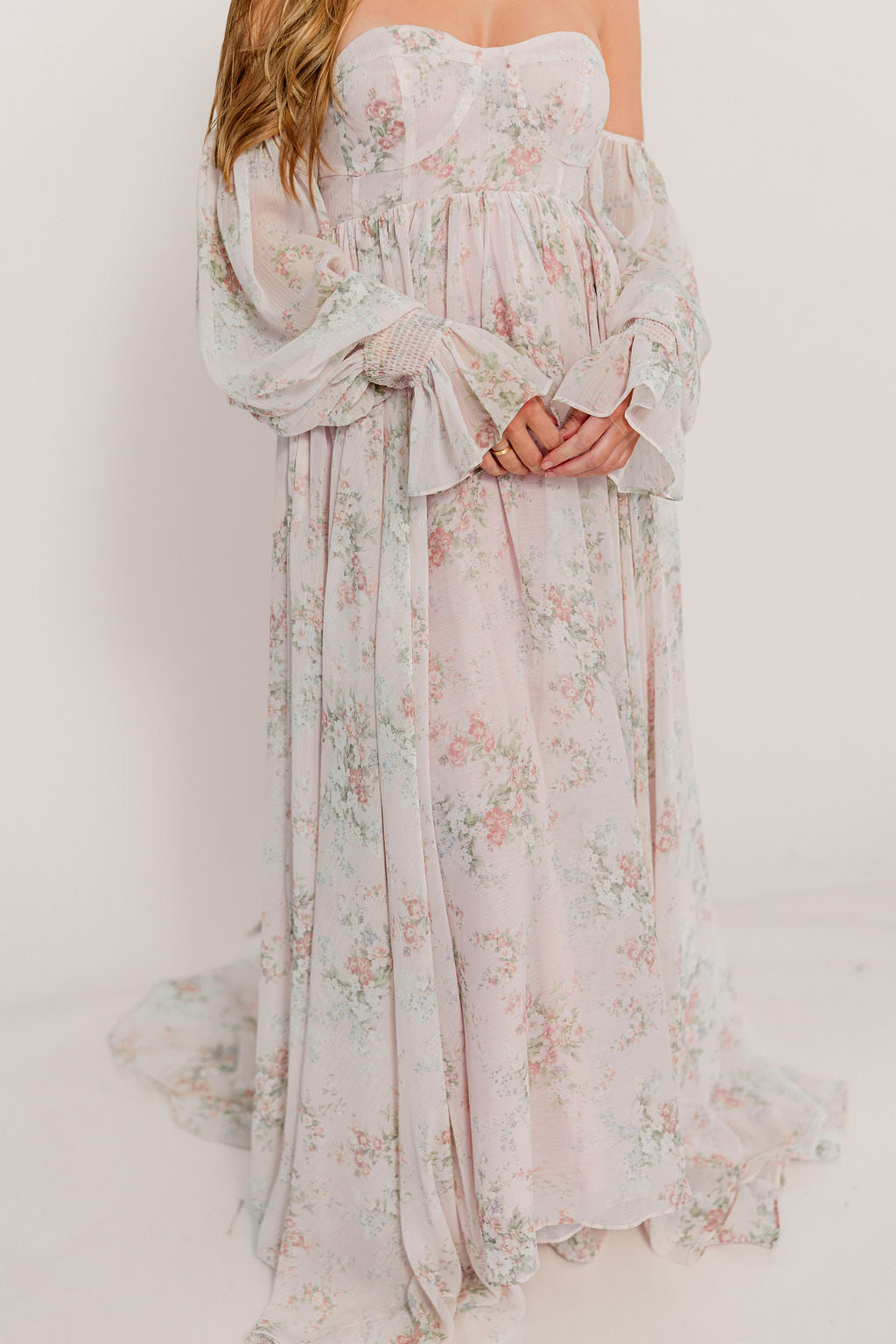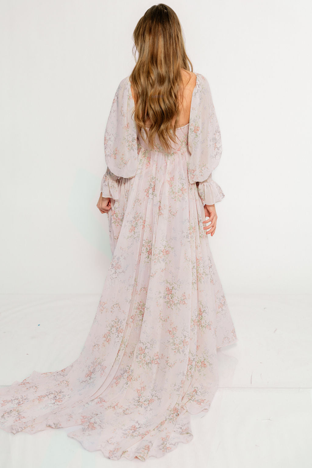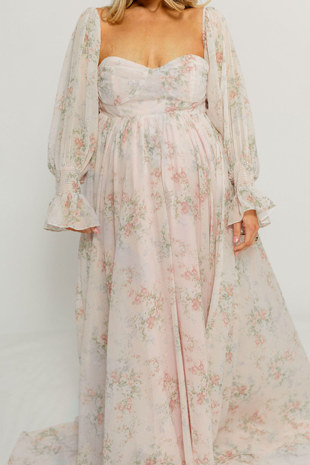 GARMENT DETAILS: Premium floral maxi dress in a lightweight, shirred chiffon. Features a soft bustier-style bodice (no boning), sweetheart neckline, smocked back panel, and sheer long sleeves with elastic cuffs and ruffles. Sleeves can be worn on or off the shoulder. Finished with a sweeping maxi-length skirt and dramatic train. Lined.