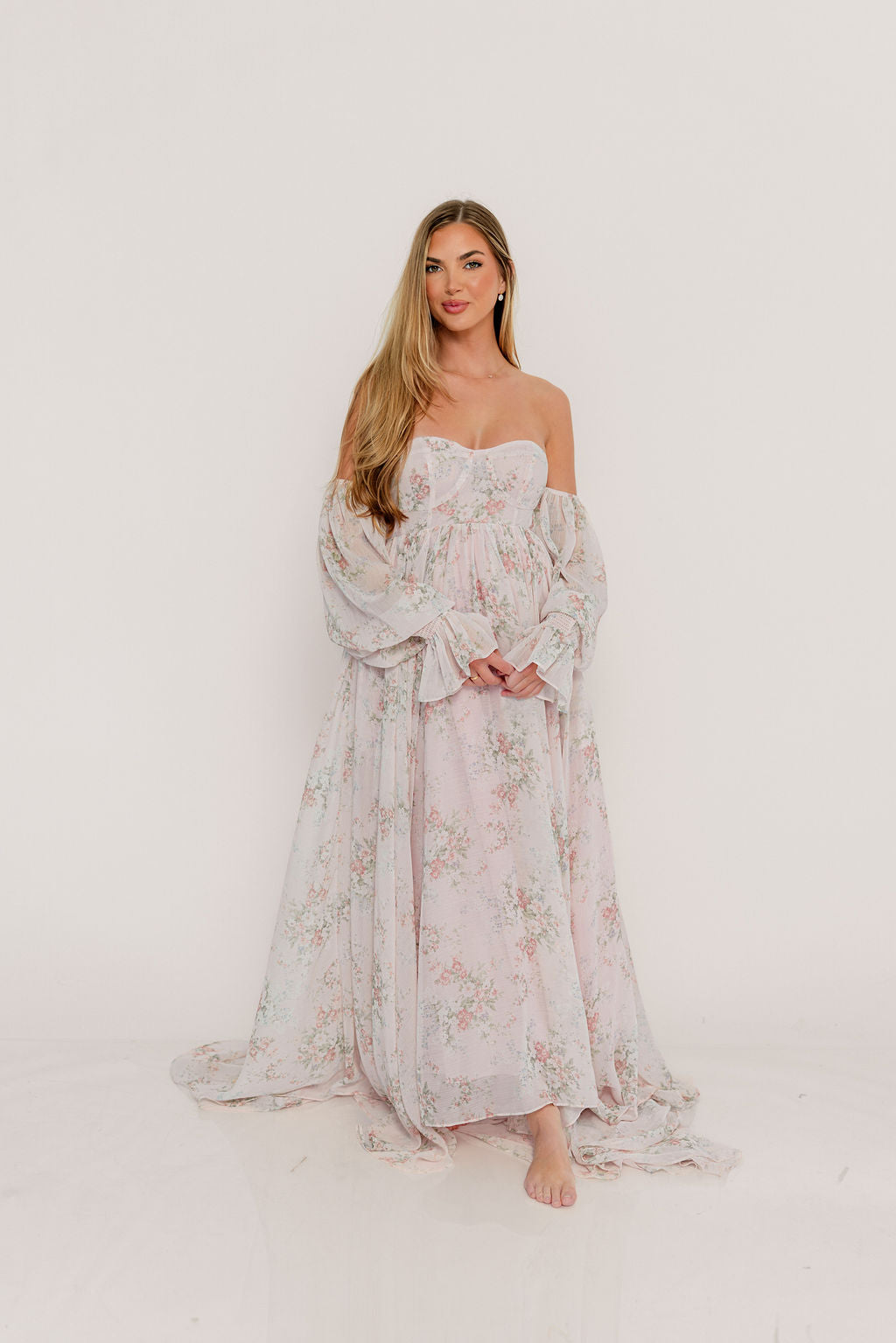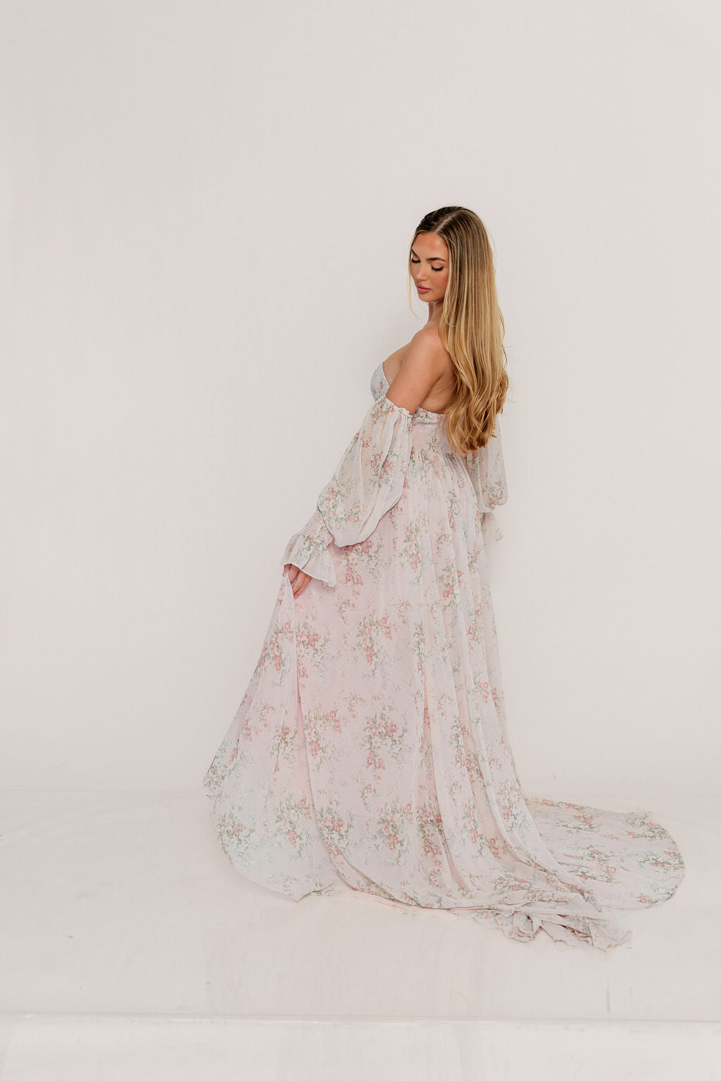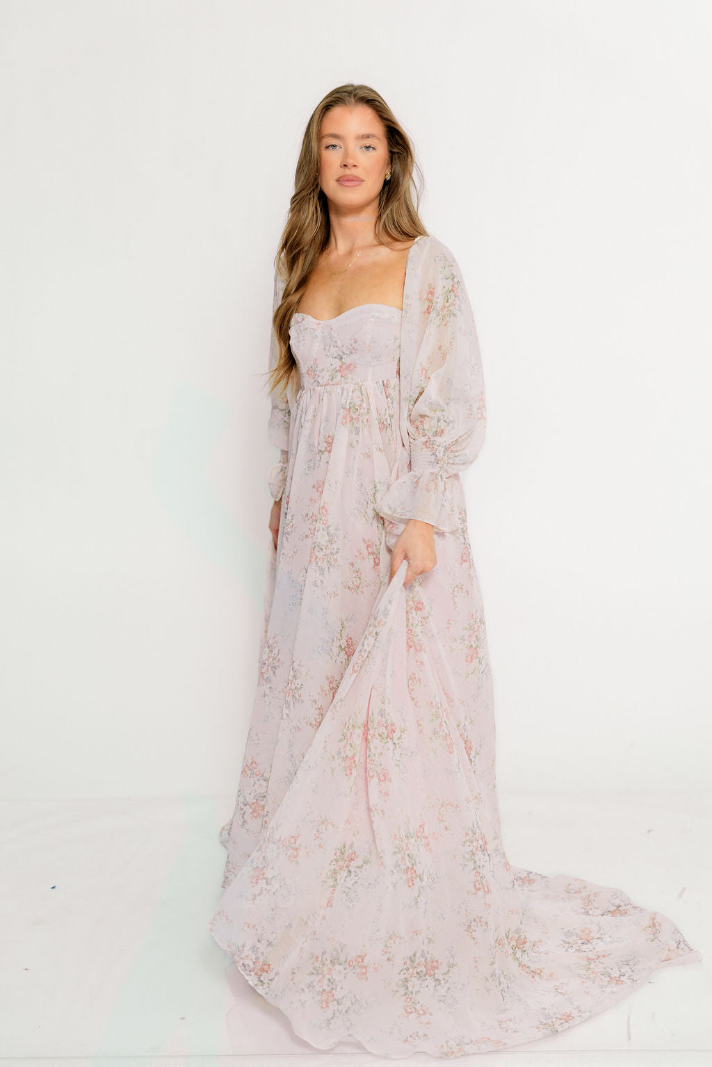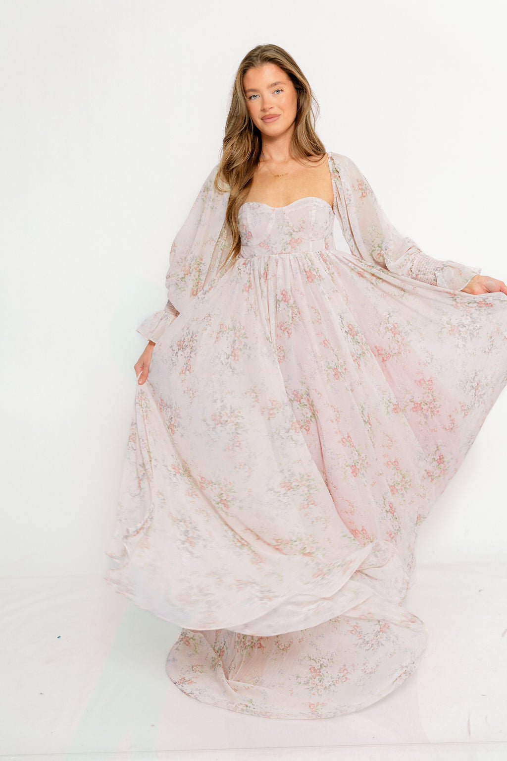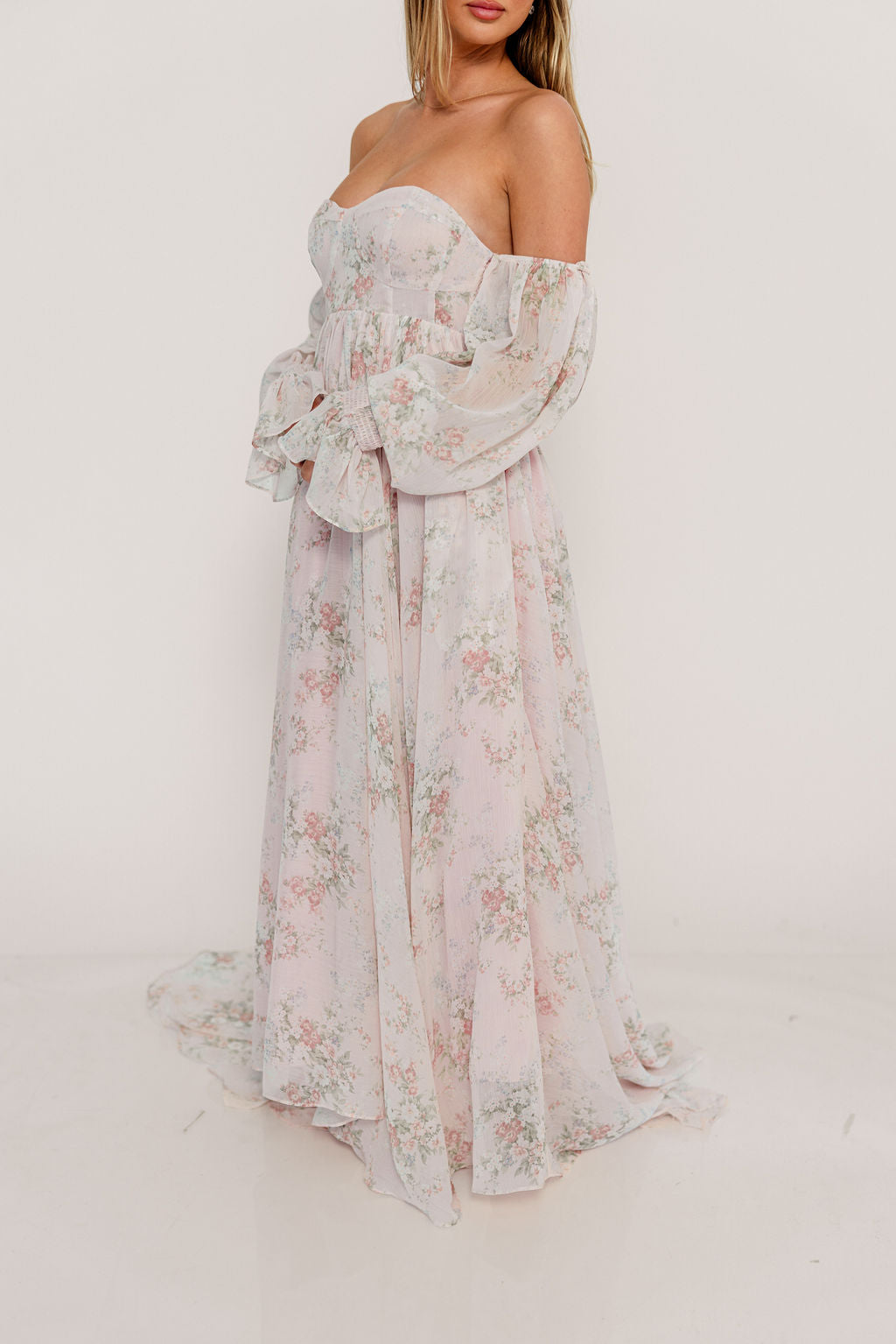 GARMENT DETAILS: Premium floral maxi dress in a lightweight, shirred chiffon. Features a soft bustier-style bodice (no boning), sweetheart neckline, smocked back panel, and sheer long sleeves with elastic cuffs and ruffles. Sleeves can be worn on or off the shoulder. Finished with a sweeping maxi-length skirt and dramatic train. Lined.