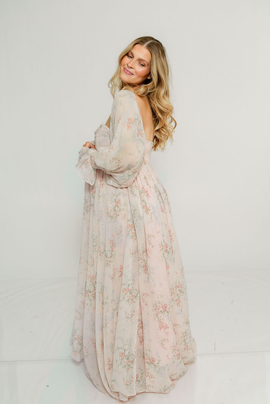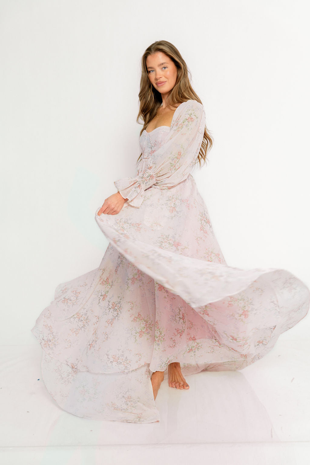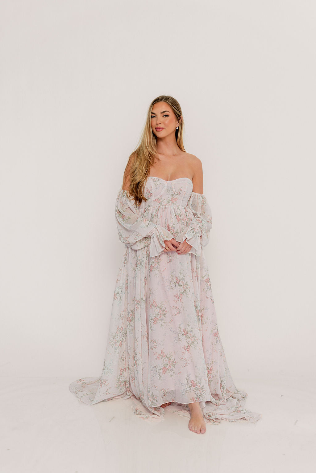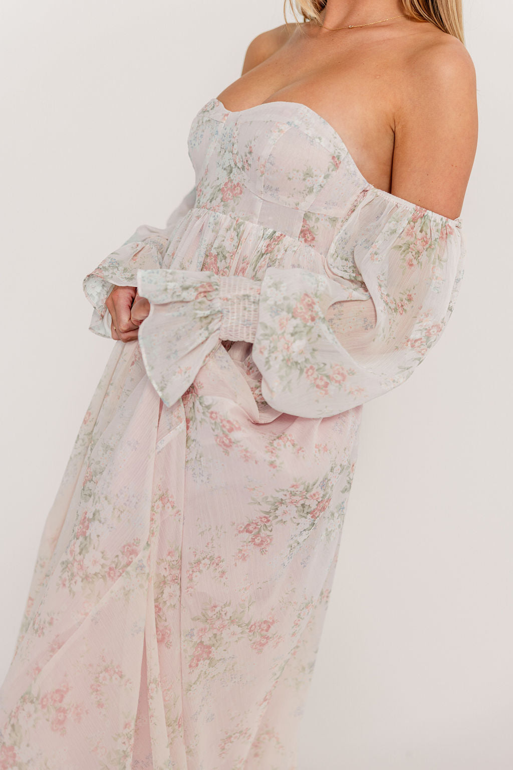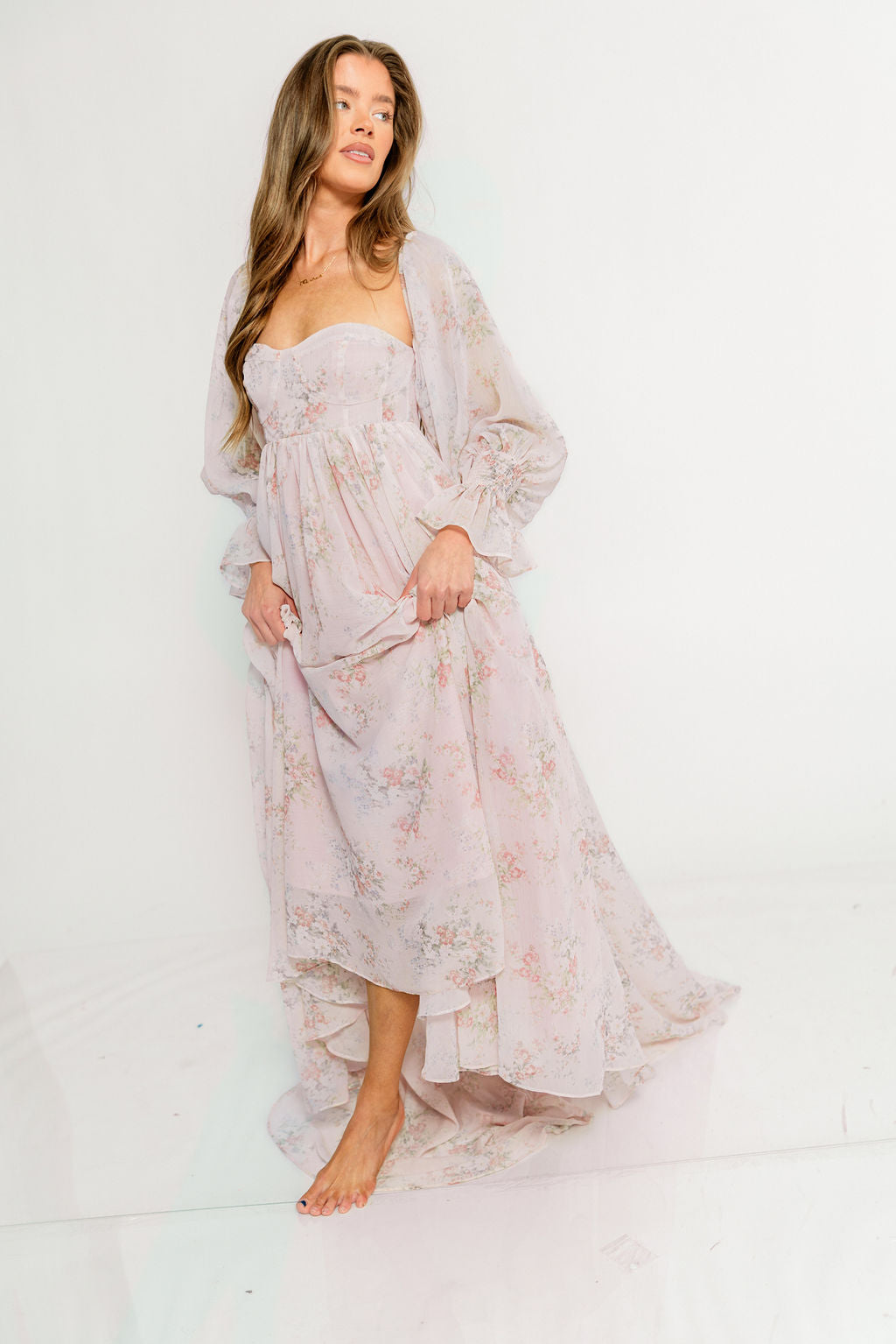 GARMENT DETAILS: Premium floral maxi dress in a lightweight, shirred chiffon. Features a soft bustier-style bodice (no boning), sweetheart neckline, smocked back panel, and sheer long sleeves with elastic cuffs and ruffles. Sleeves can be worn on or off the shoulder. Finished with a sweeping maxi-length skirt and dramatic train. Lined.