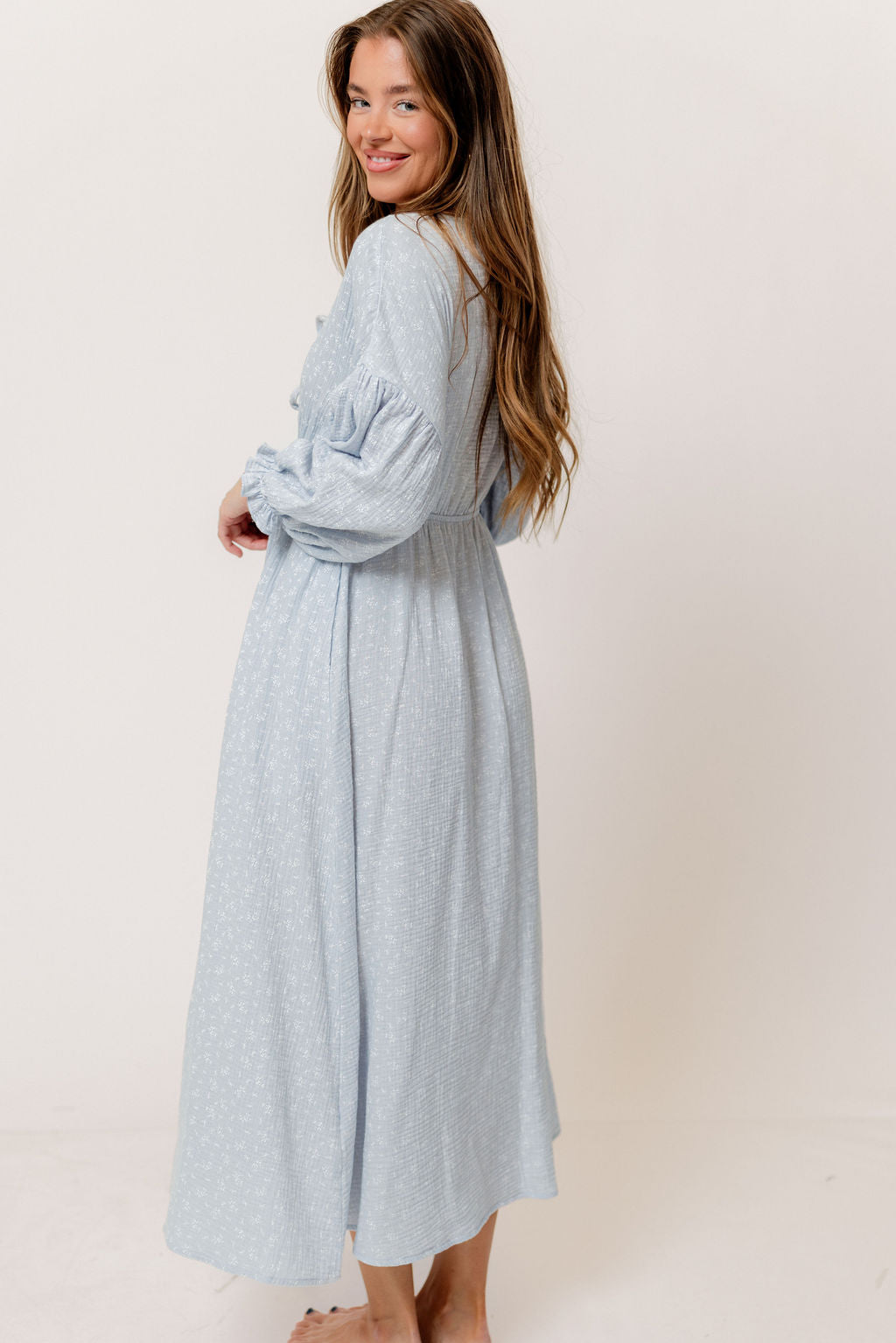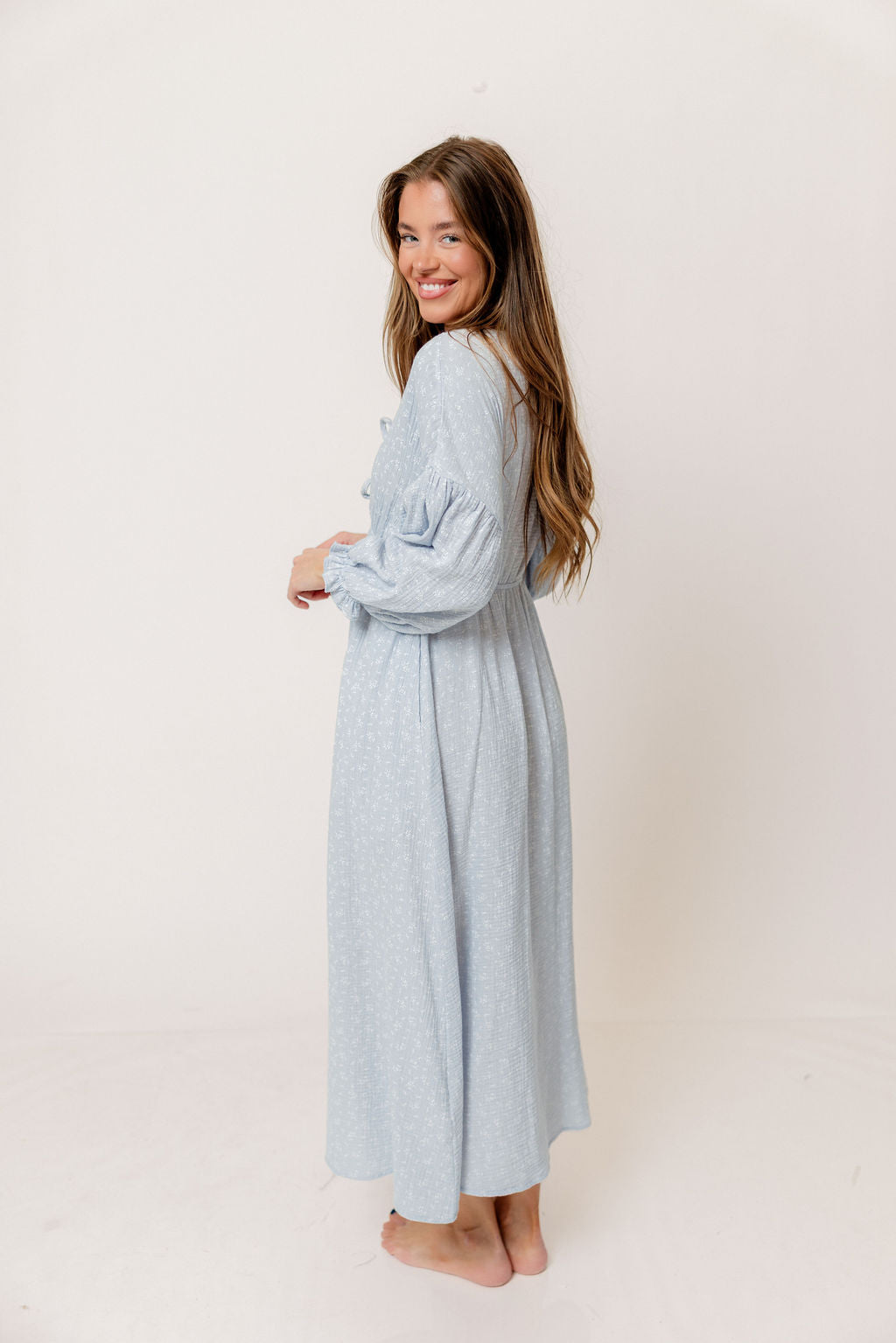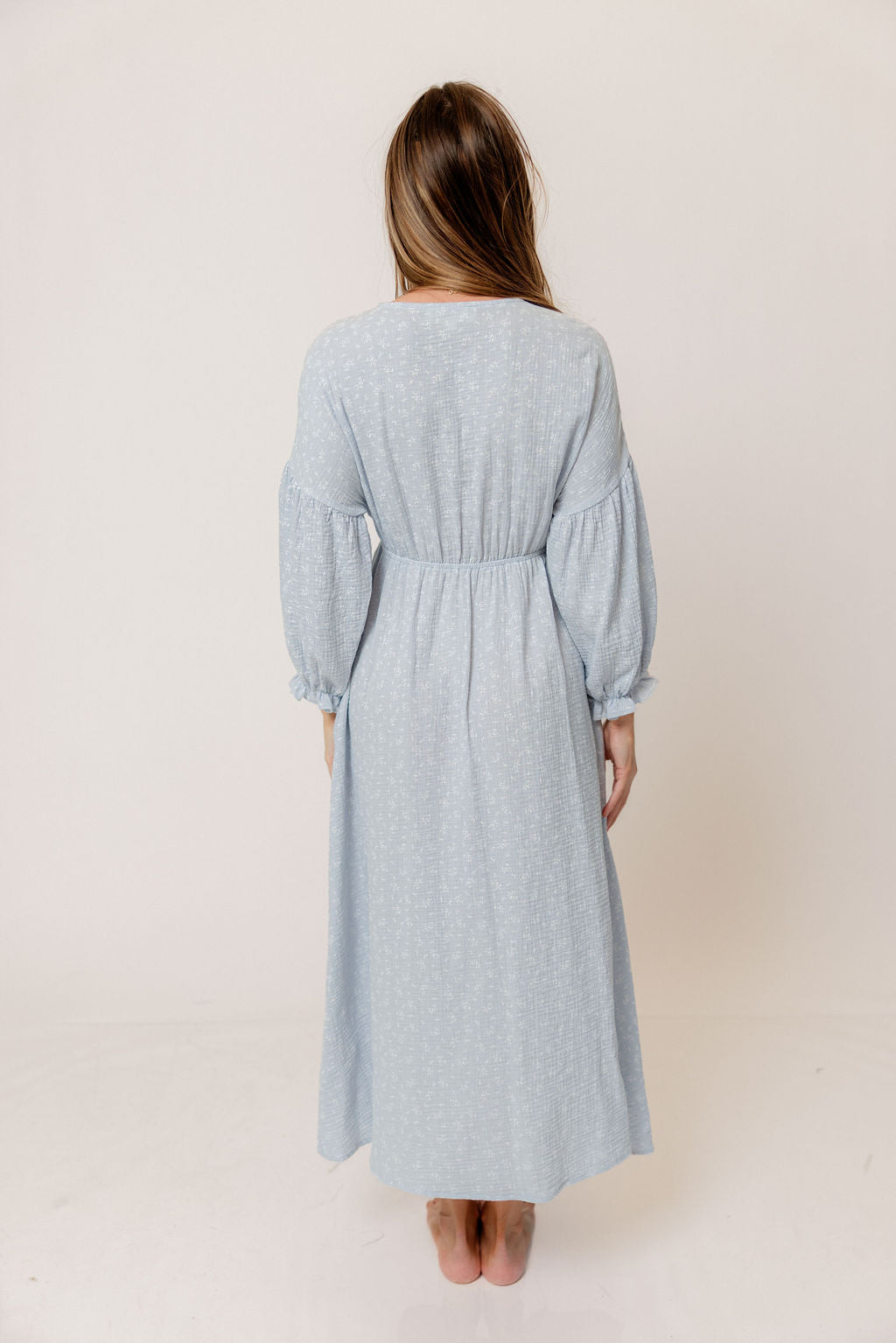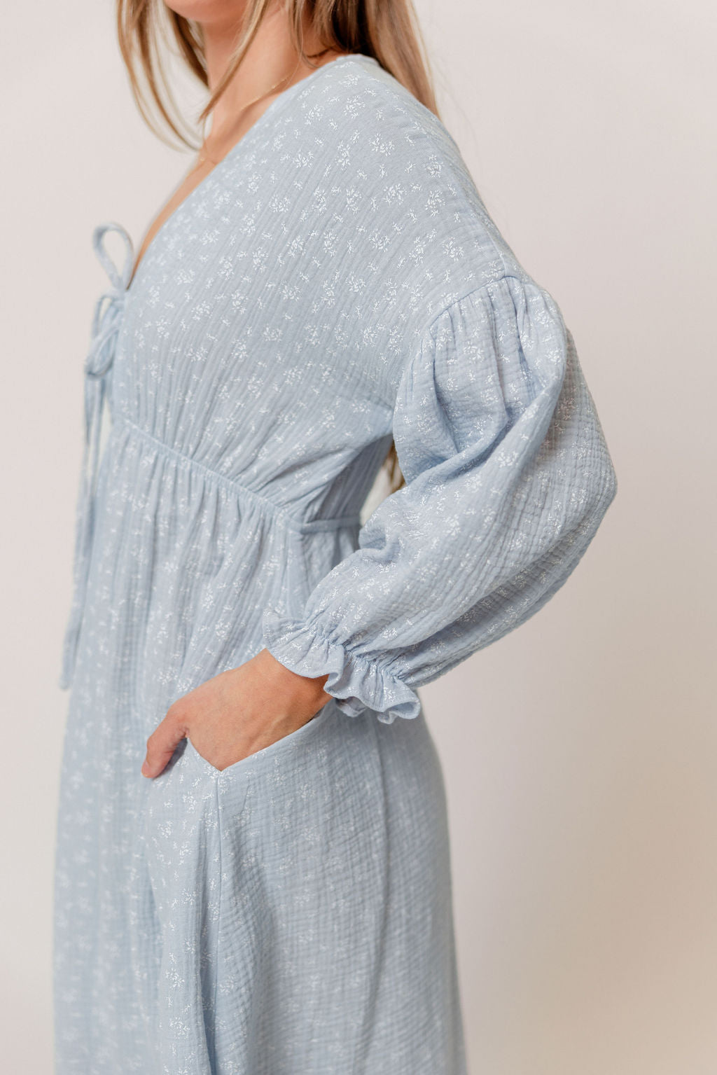 GARMENT DETAILS: Lightweight cotton gauze midi dress. Features V-neckline with self-tie detail, inverted empire waist, and full skirt with in-seam pockets. Finished with long balloon sleeves. This colorway is not lined.