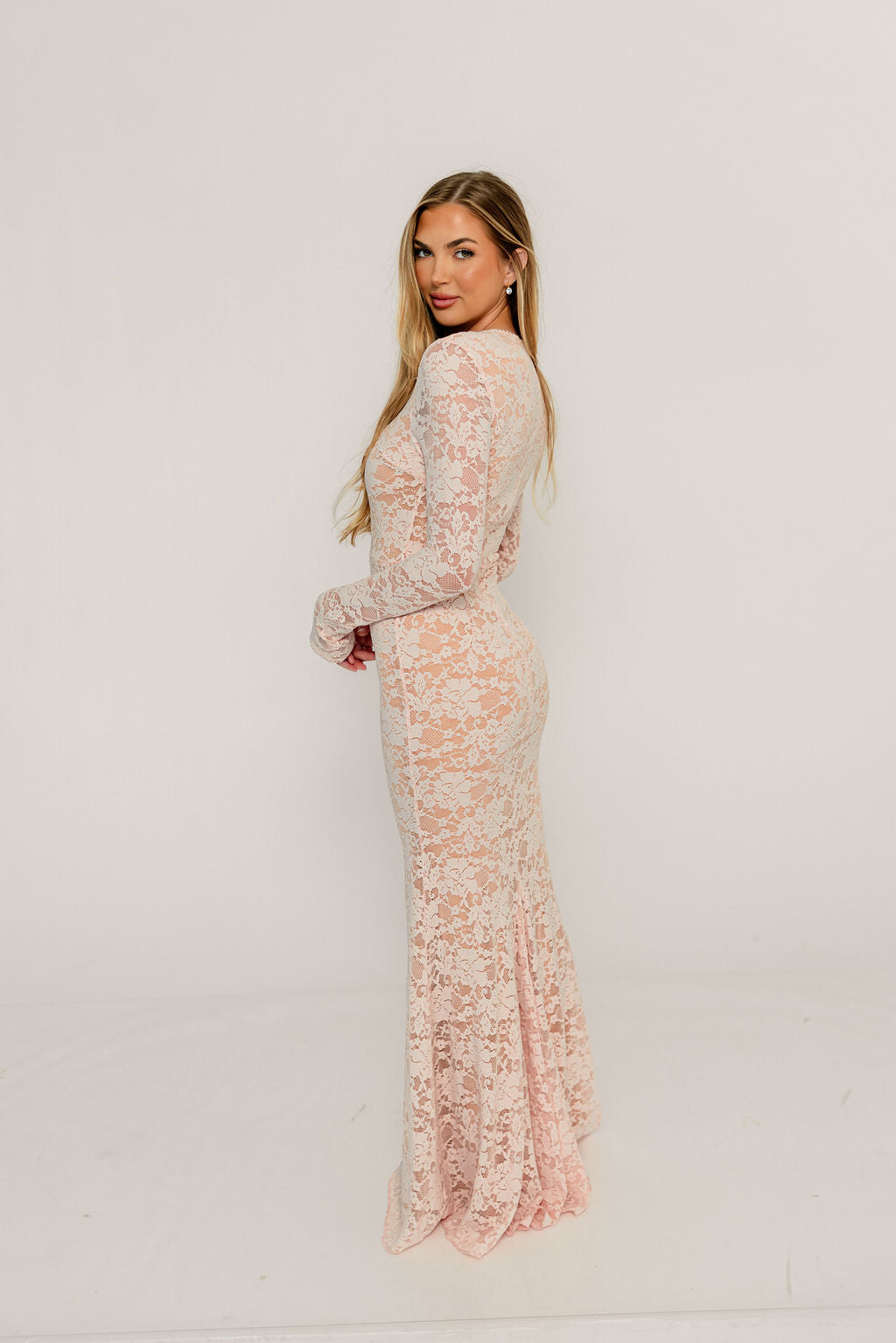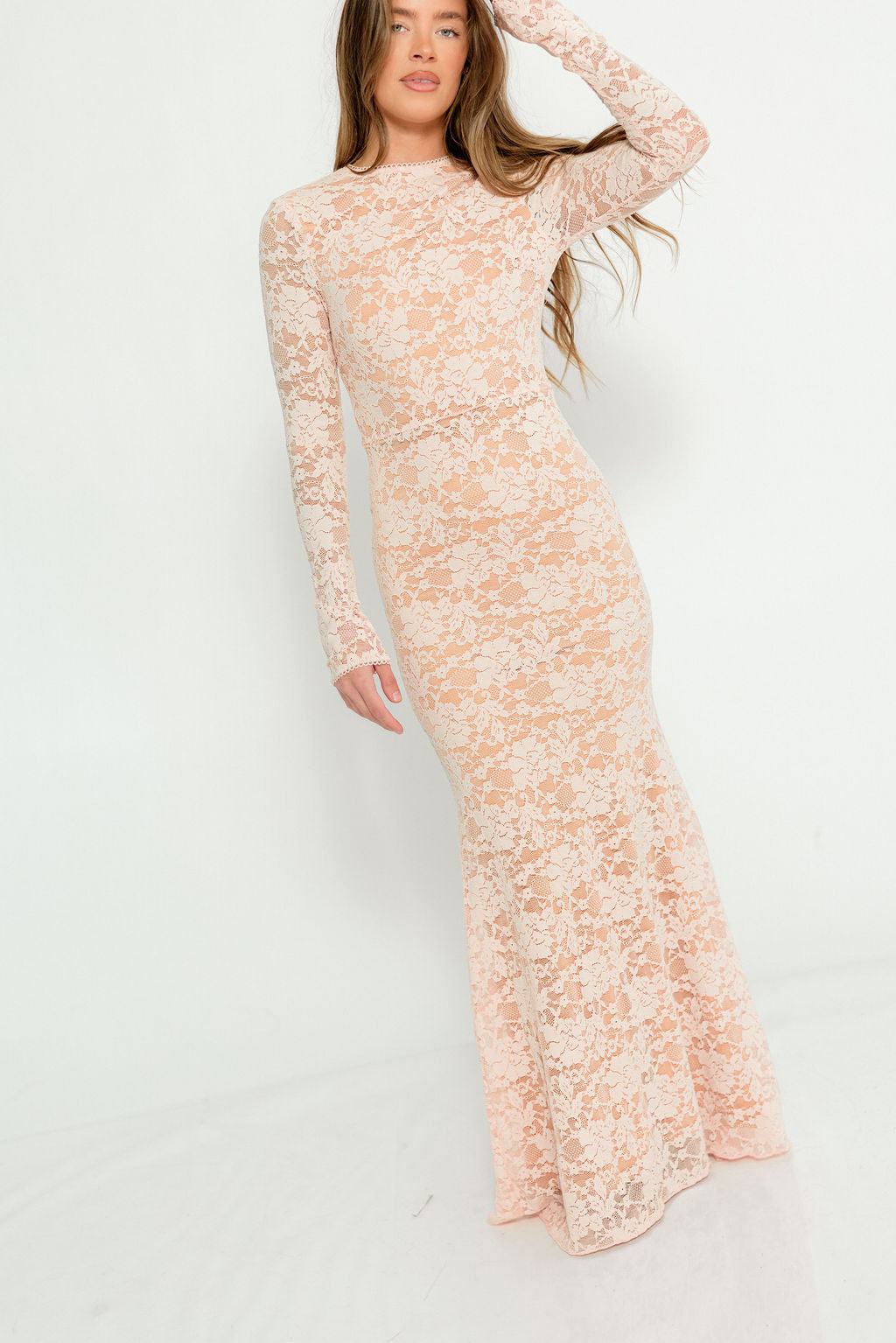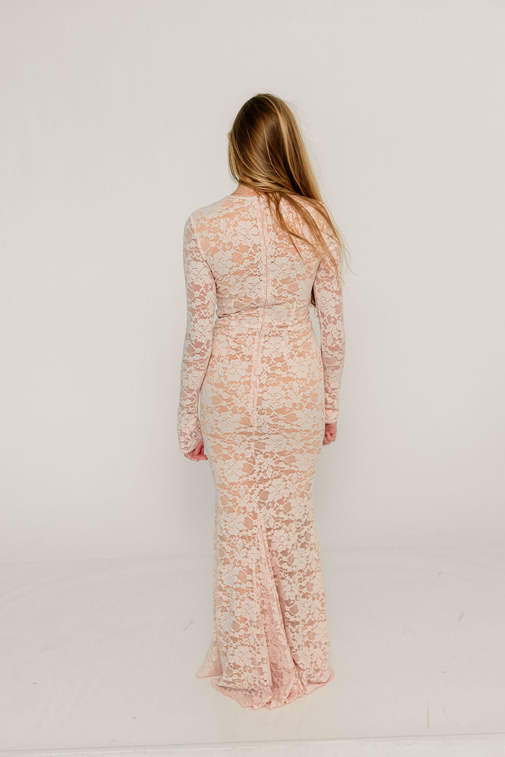 GARMENT DETAILS: Feminine pale pink maxi dress with high rounded neckline, long sleeves, and fit-and-flare silhouette with paneled, flared skirt. Features a delicate floral lace overlay, eyelet trim, and back zip with full neutral lining.