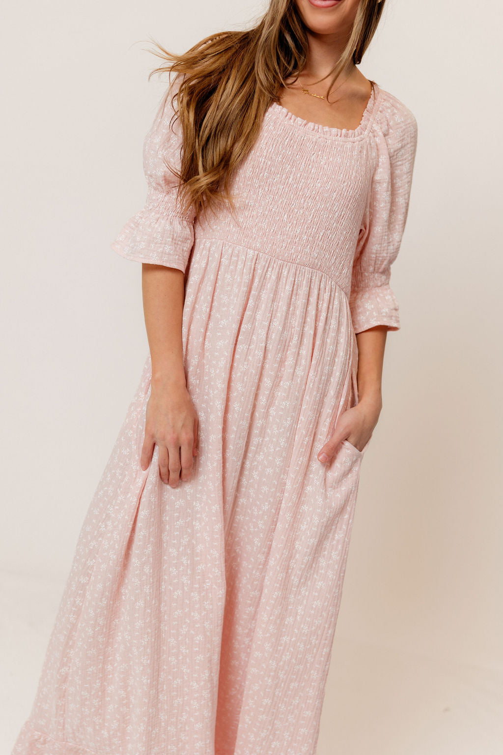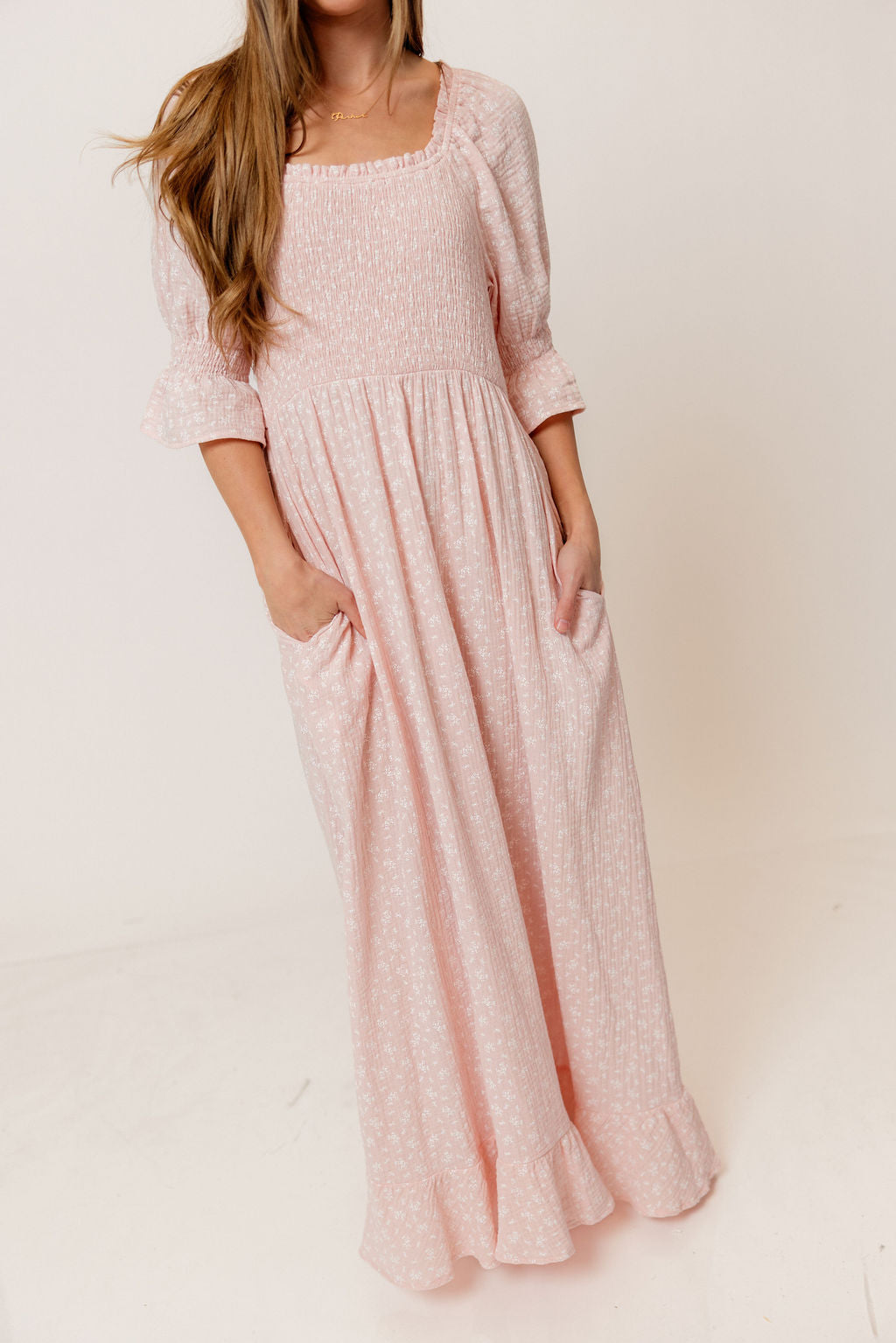GARMENT DETAILS: Elegant, lightweight maxi dress in a darling floral print, with stretchy neckline that can be worn on or off the shoulder. Features 3/4 length puffed sleeves with ruffle, and a stretchy, smocked bodice.