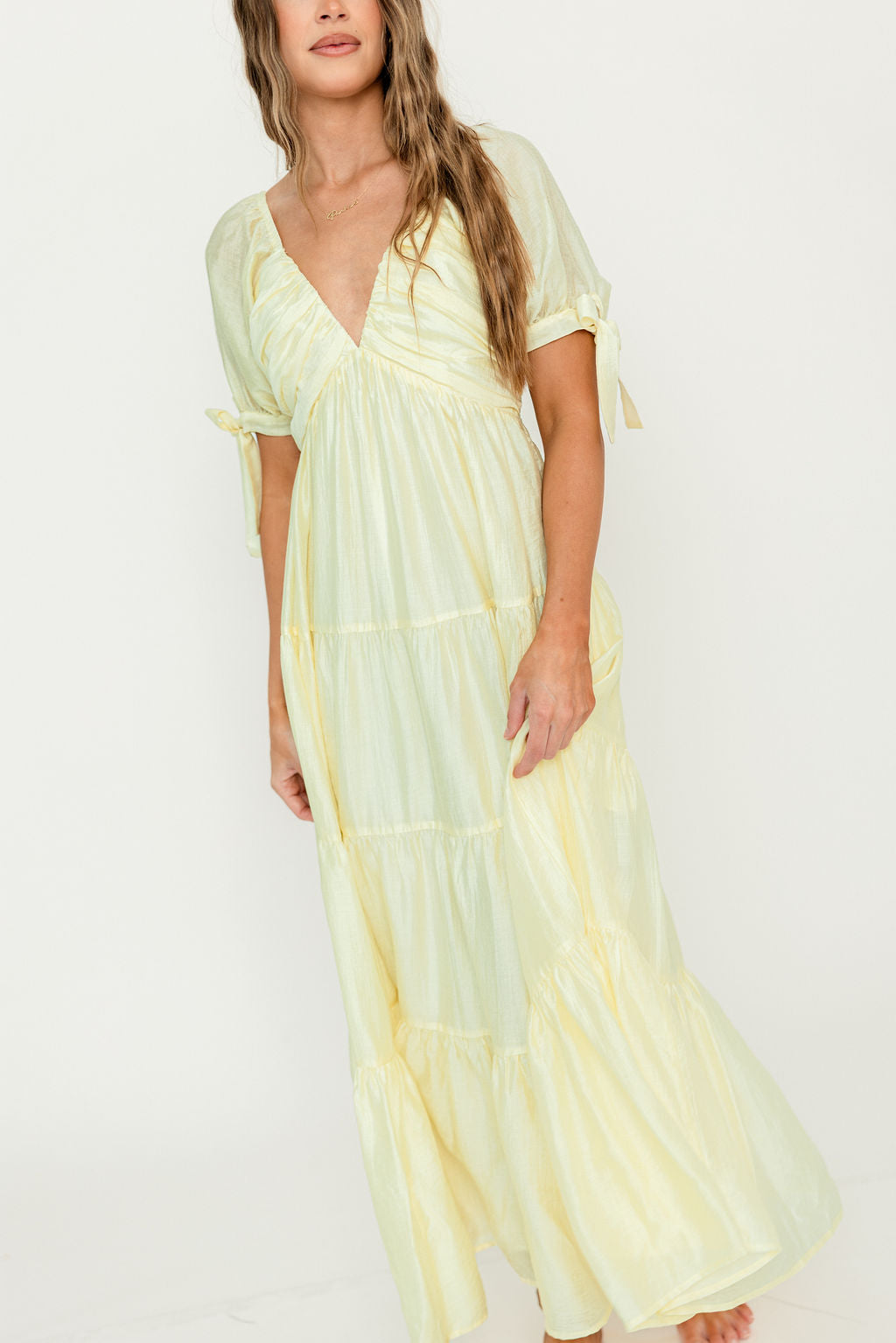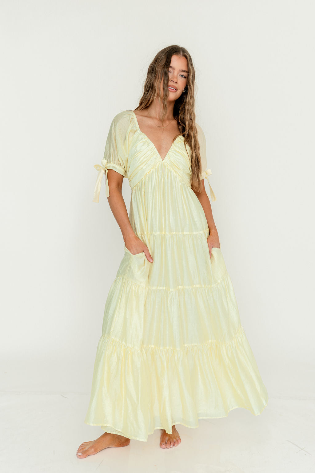 GARMENT DETAILS: Elegant crinkle-texture maxi dress with a plunging statement neckline, defined bodice with inverted waist, and smocked back panel. Features short puffed sleeves with bow details and a multi-tiered skirt.