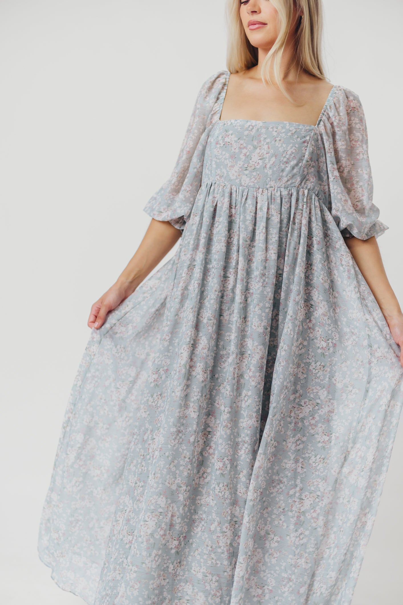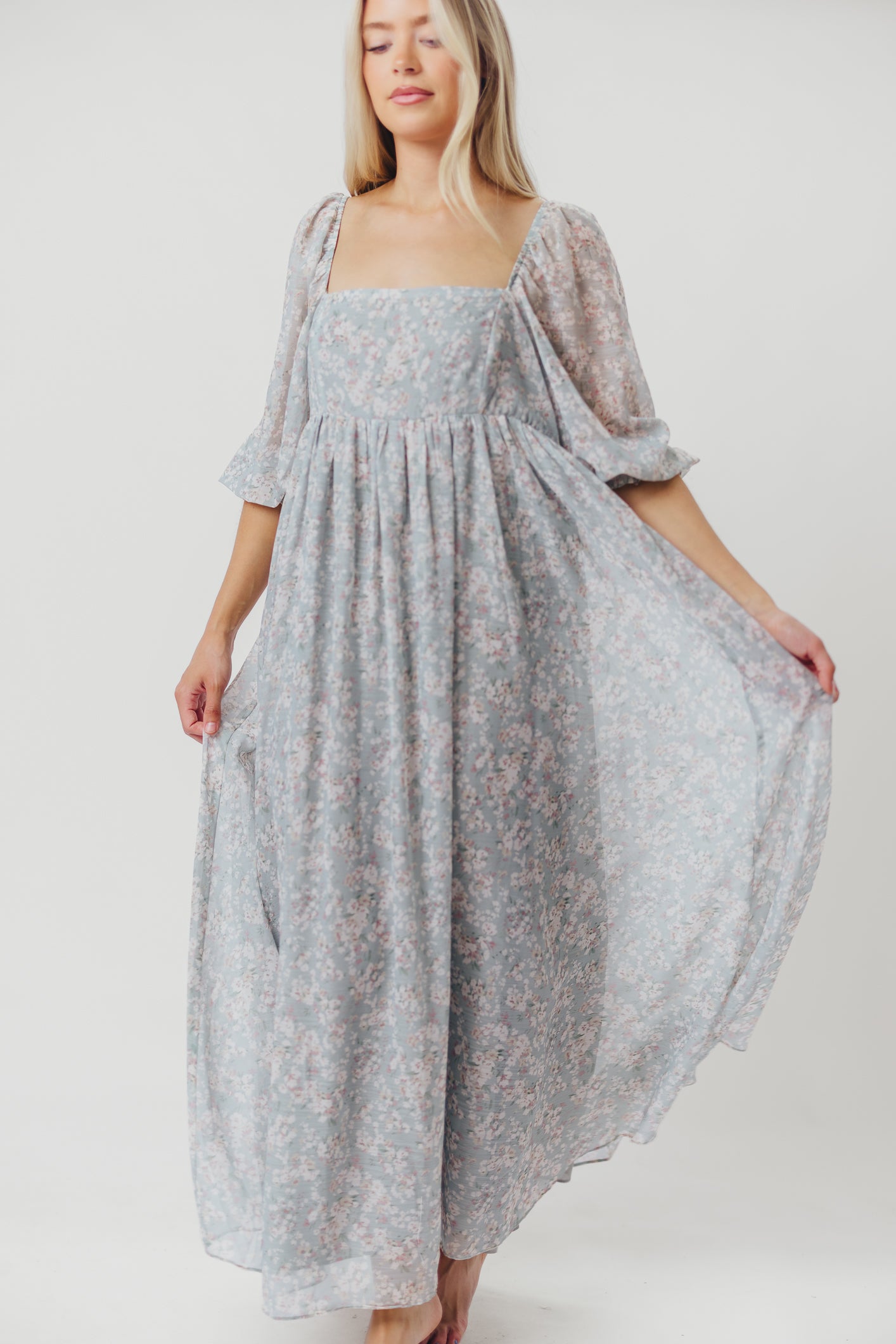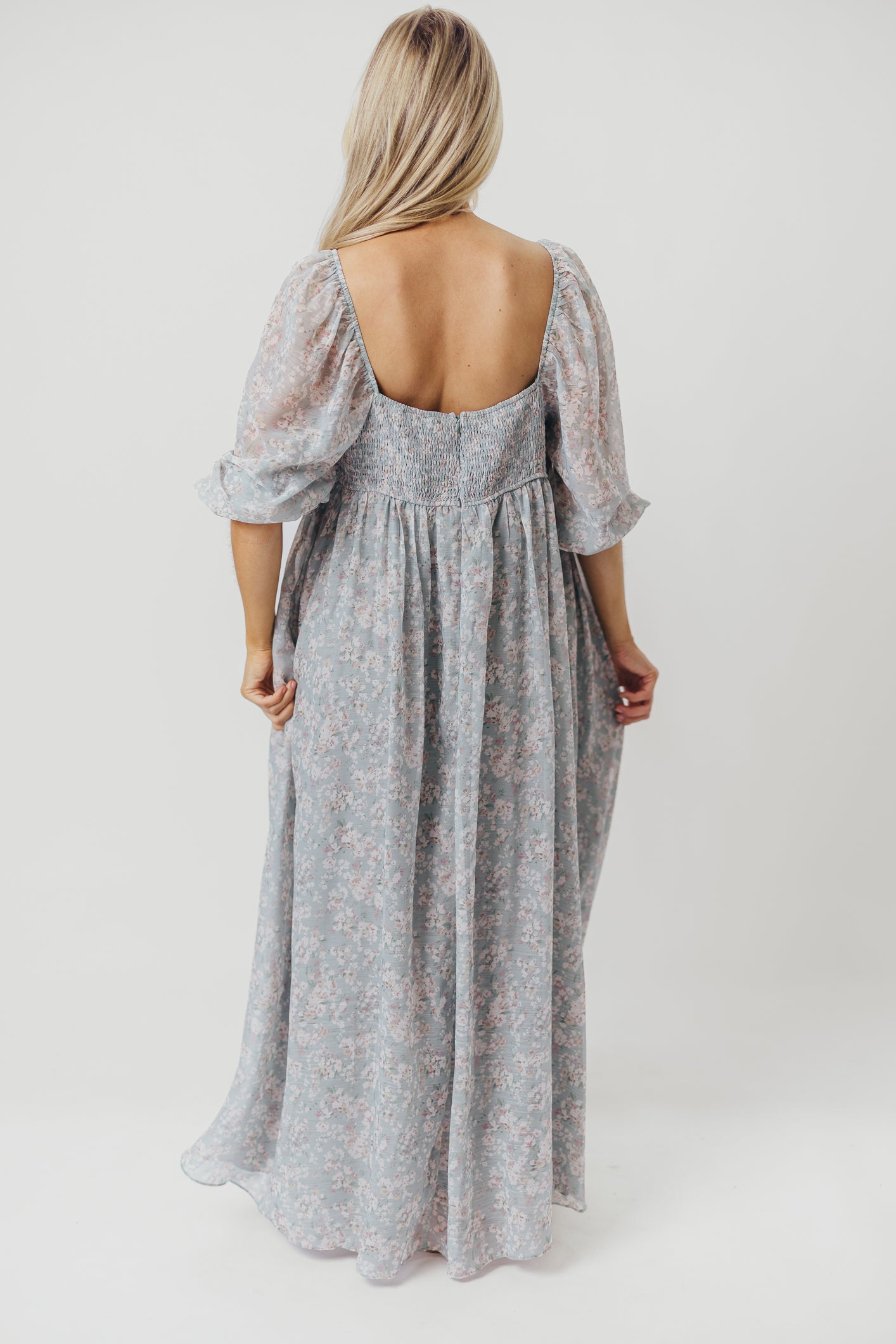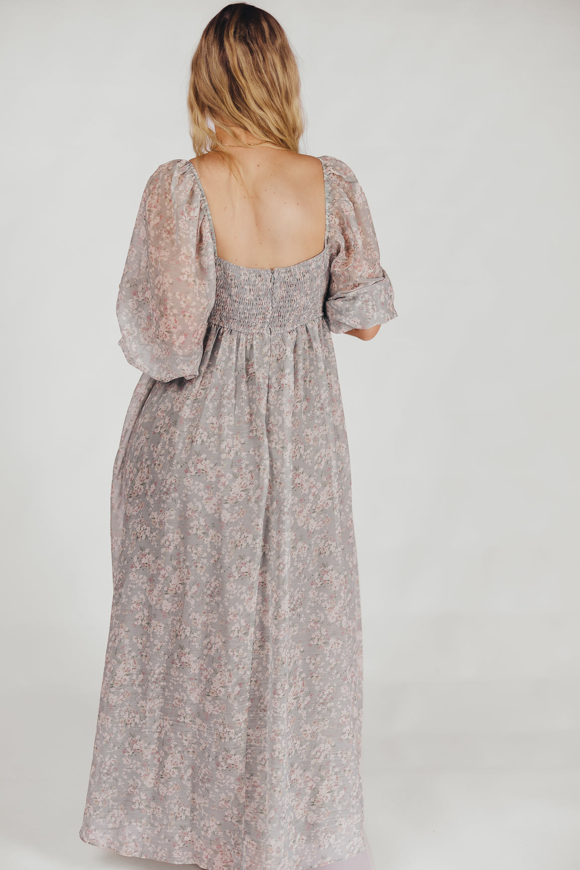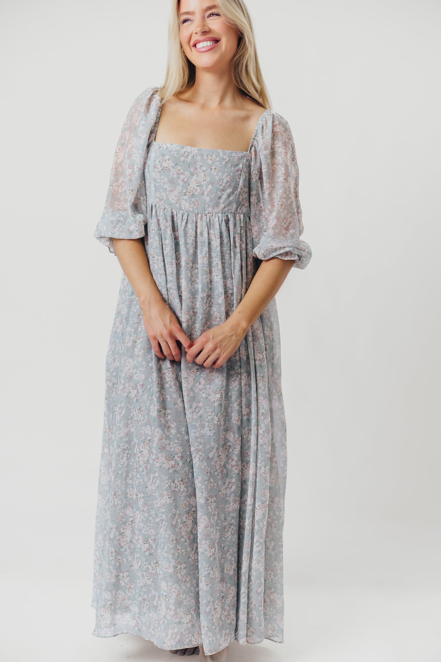 GARMENT DETAILS: Empire-waisted maxi dress in a pastel floral pattern. Features square neckline, sheer 3/4 length puffed sleeves, and bust darts, with a stretchy, smocked back panel. Lined.