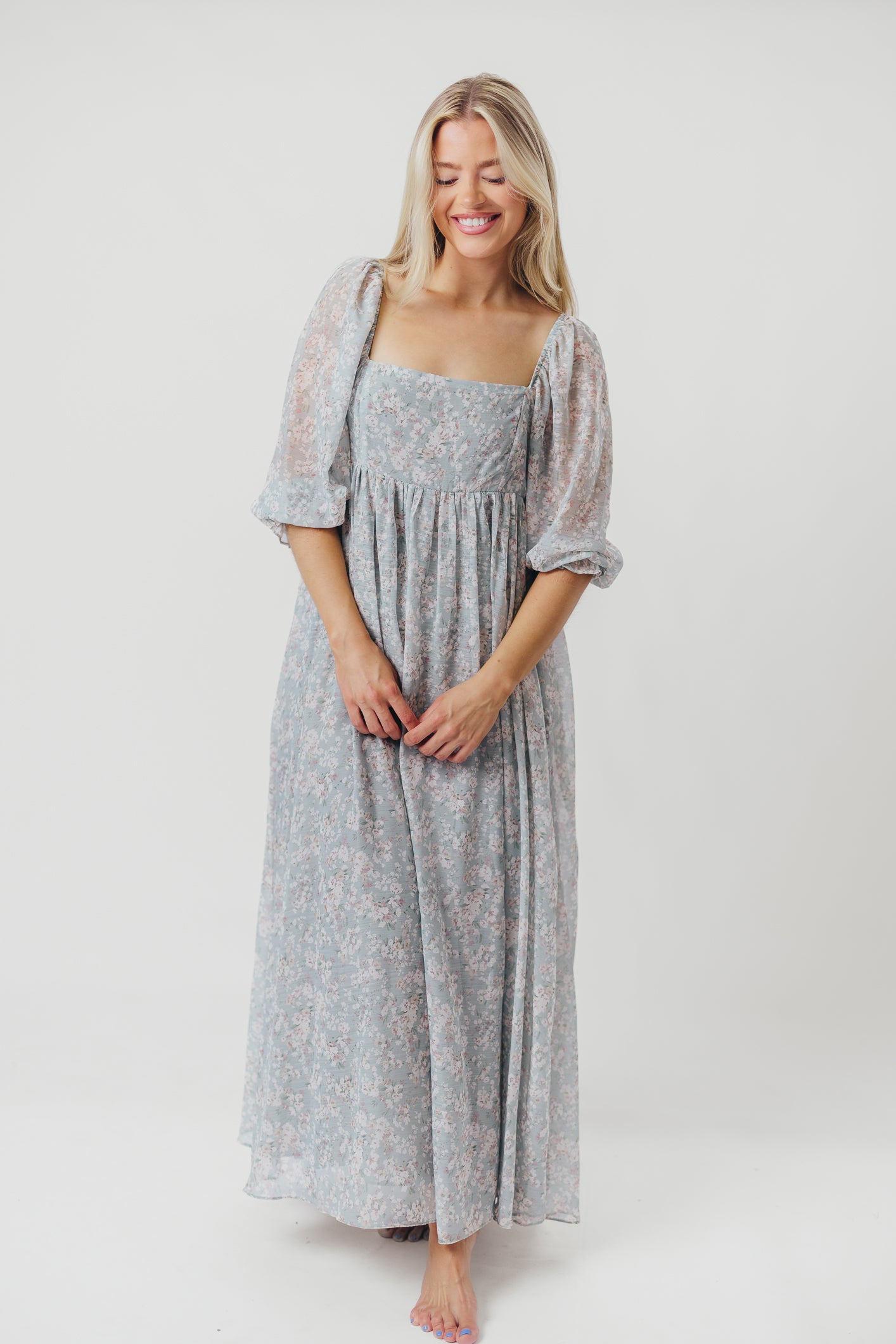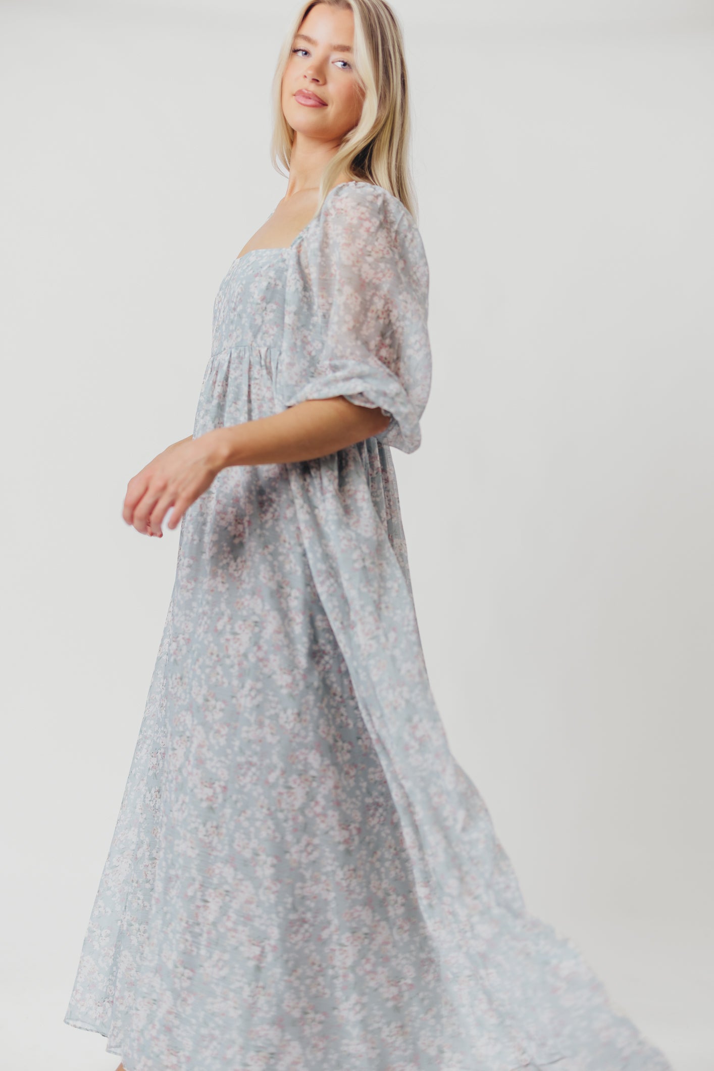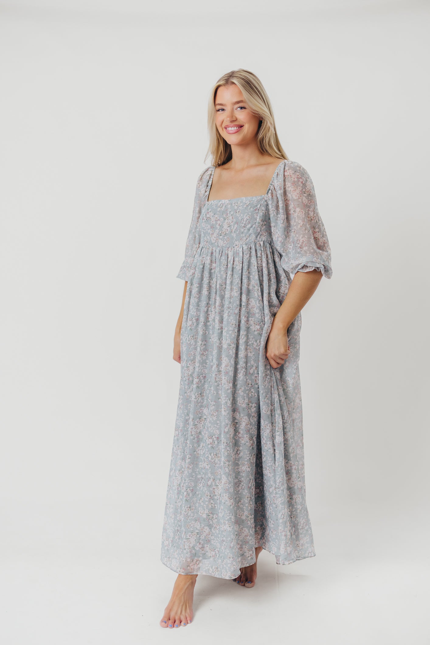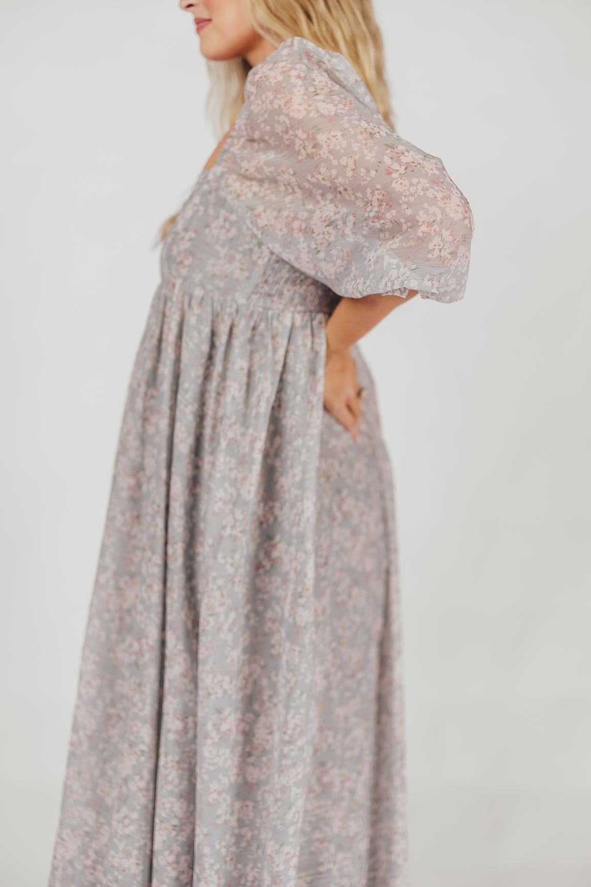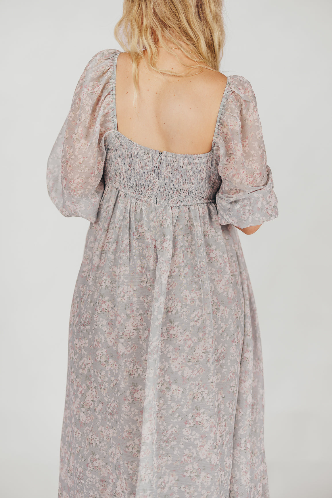 GARMENT DETAILS: Empire-waisted maxi dress in a pastel floral pattern. Features square neckline, sheer 3/4 length puffed sleeves, and bust darts, with a stretchy, smocked back panel. Lined.