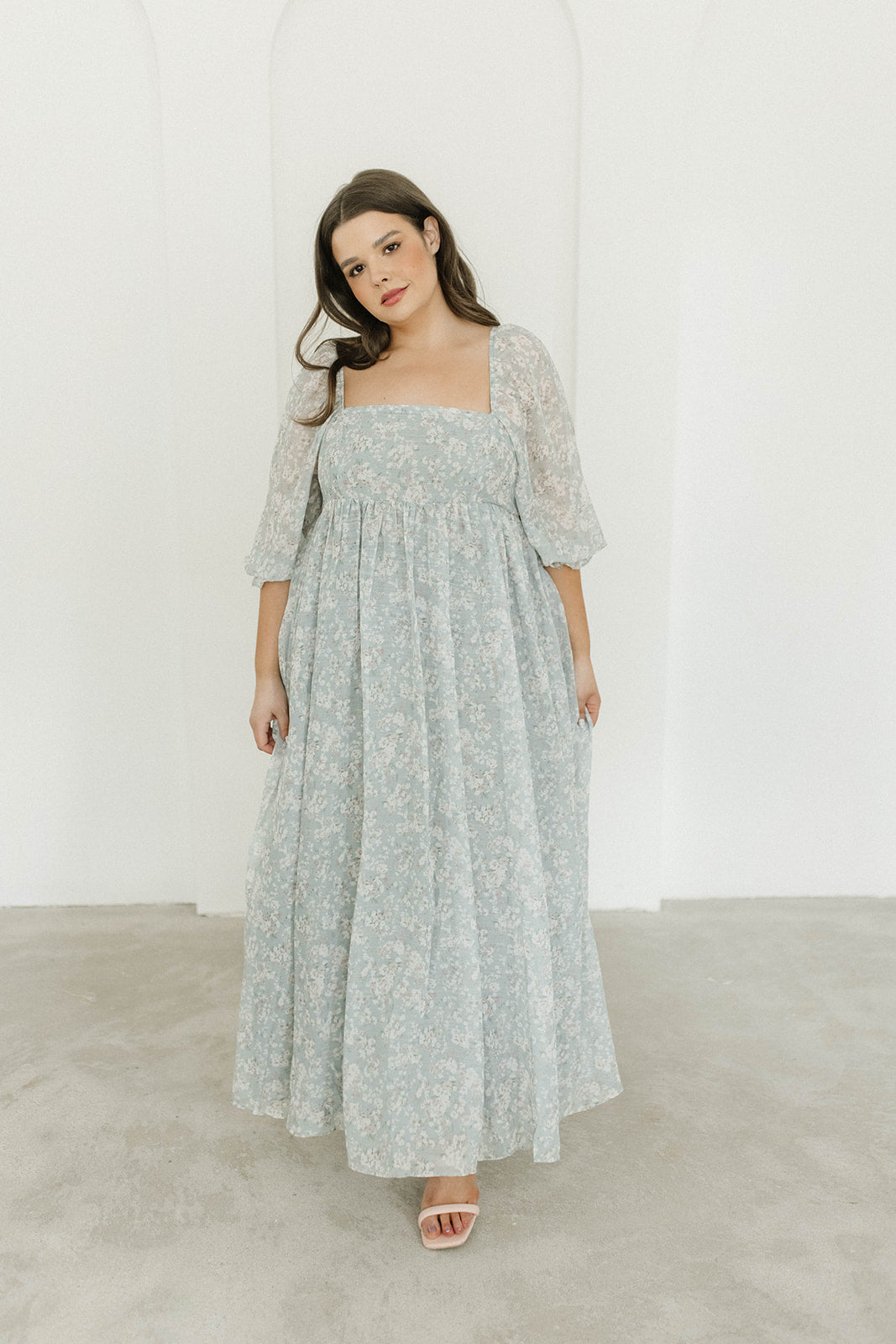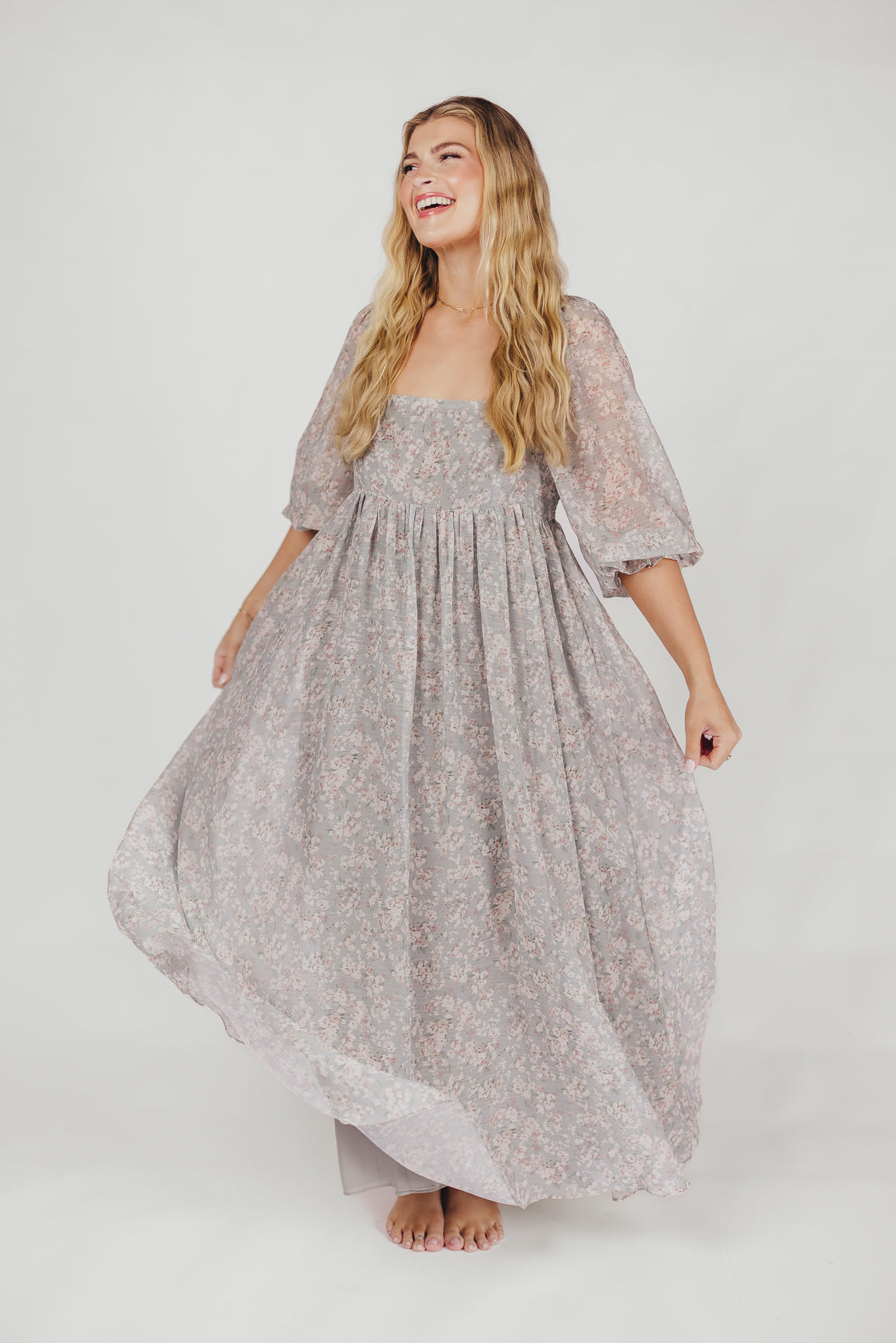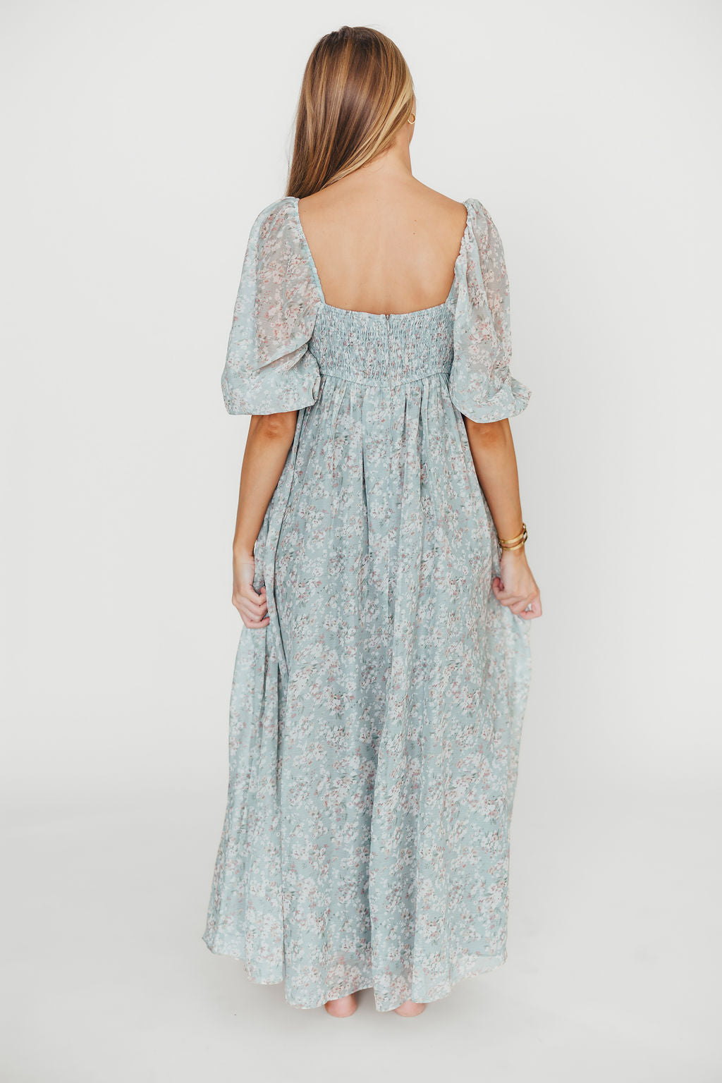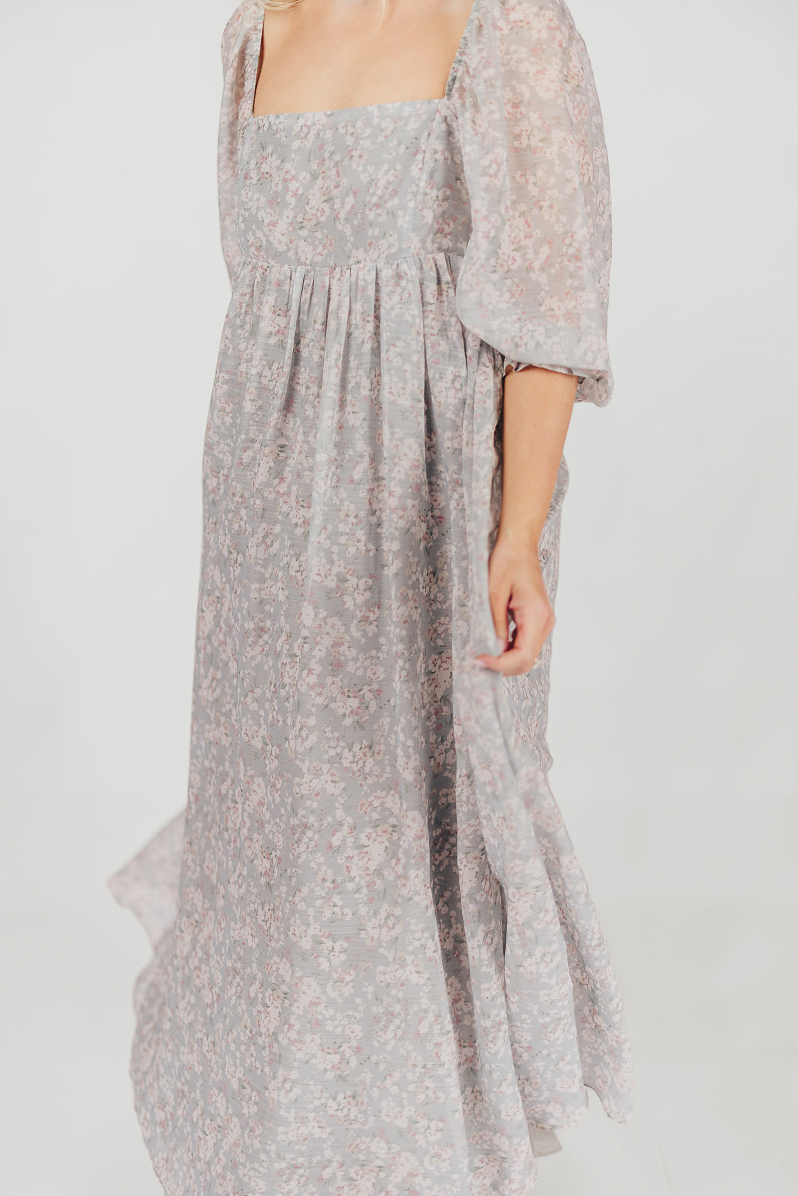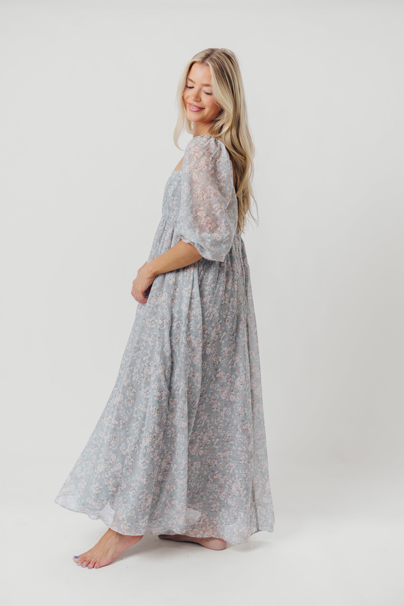 GARMENT DETAILS: Empire-waisted maxi dress in a pastel floral pattern. Features square neckline, sheer 3/4 length puffed sleeves, and bust darts, with a stretchy, smocked back panel. Lined.