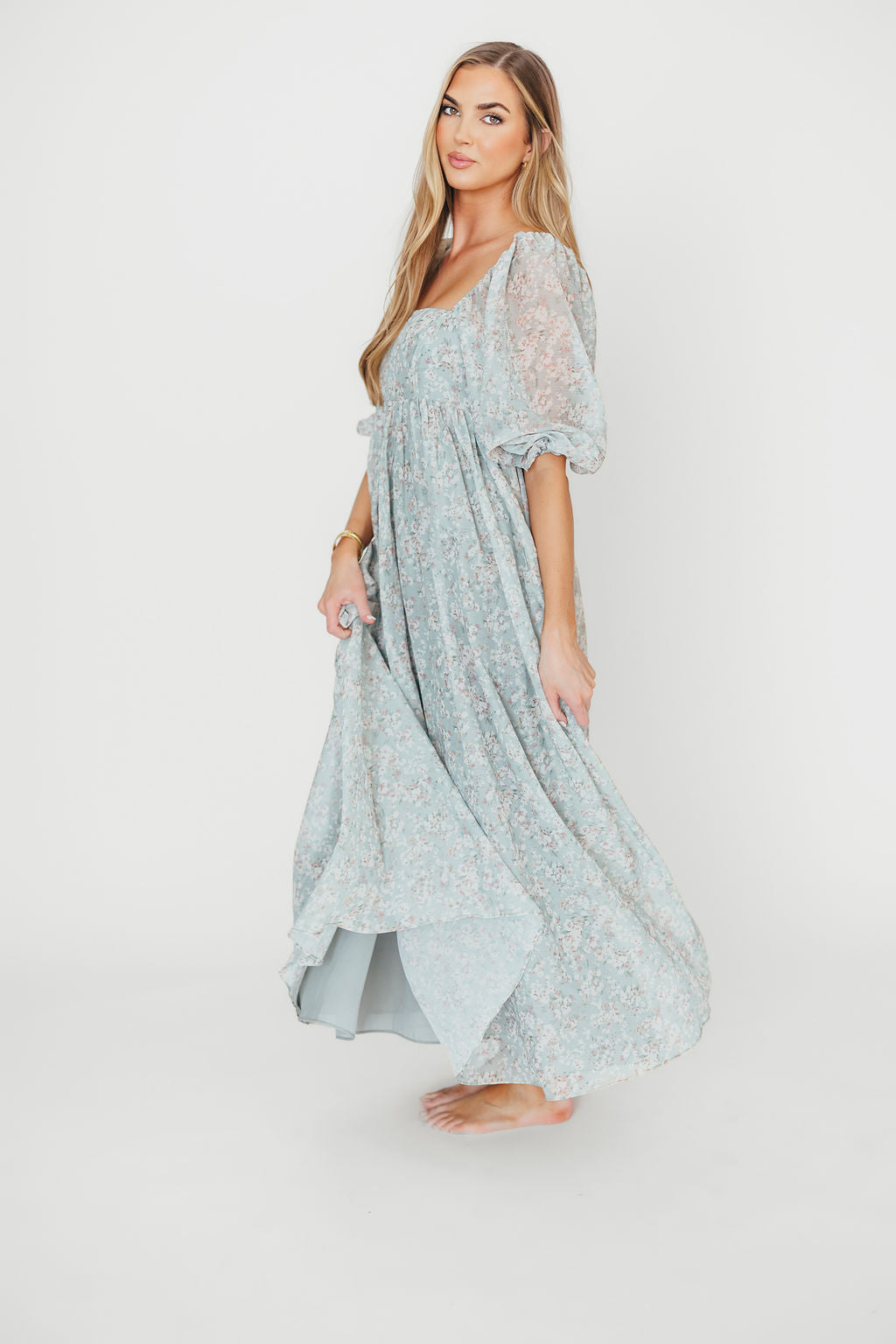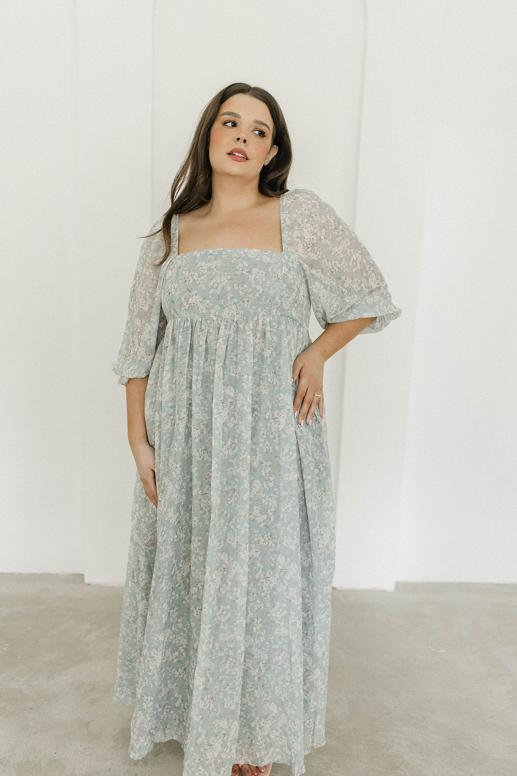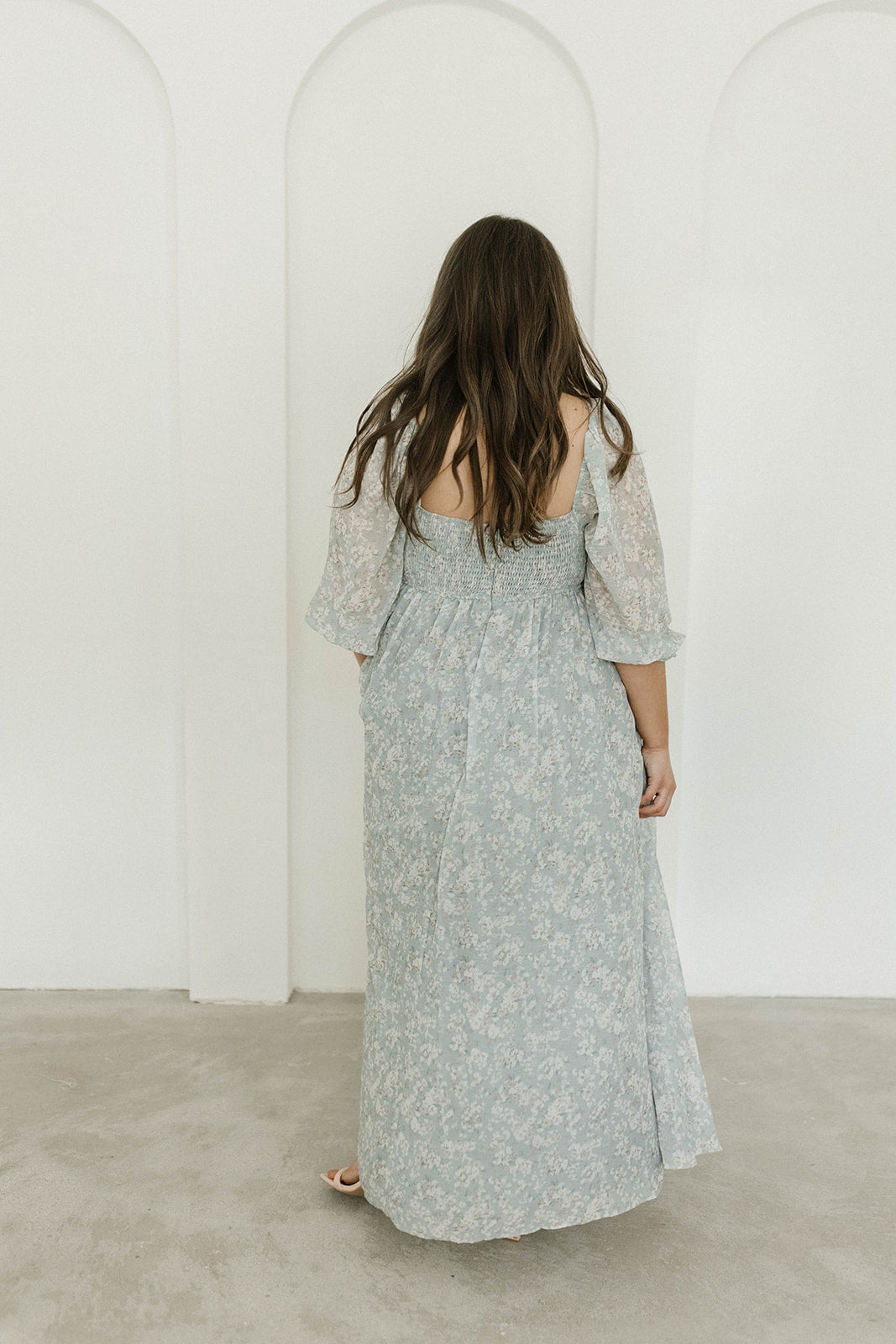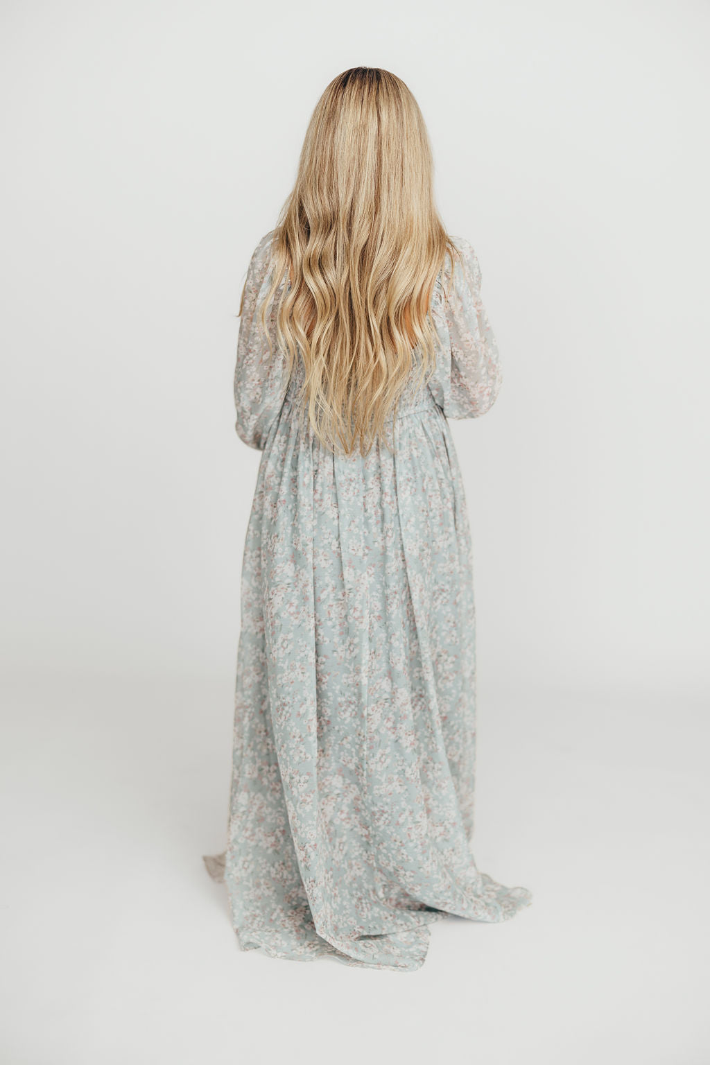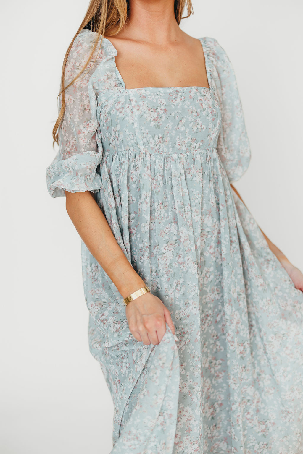 GARMENT DETAILS: Empire-waisted maxi dress in a pastel floral pattern. Features square neckline, sheer 3/4 length puffed sleeves, and bust darts, with a stretchy, smocked back panel. Lined.