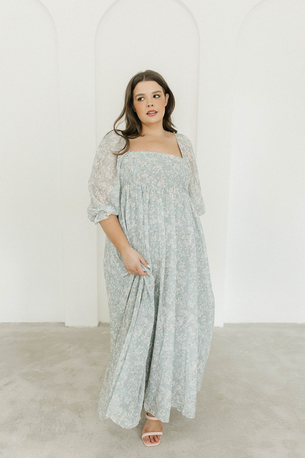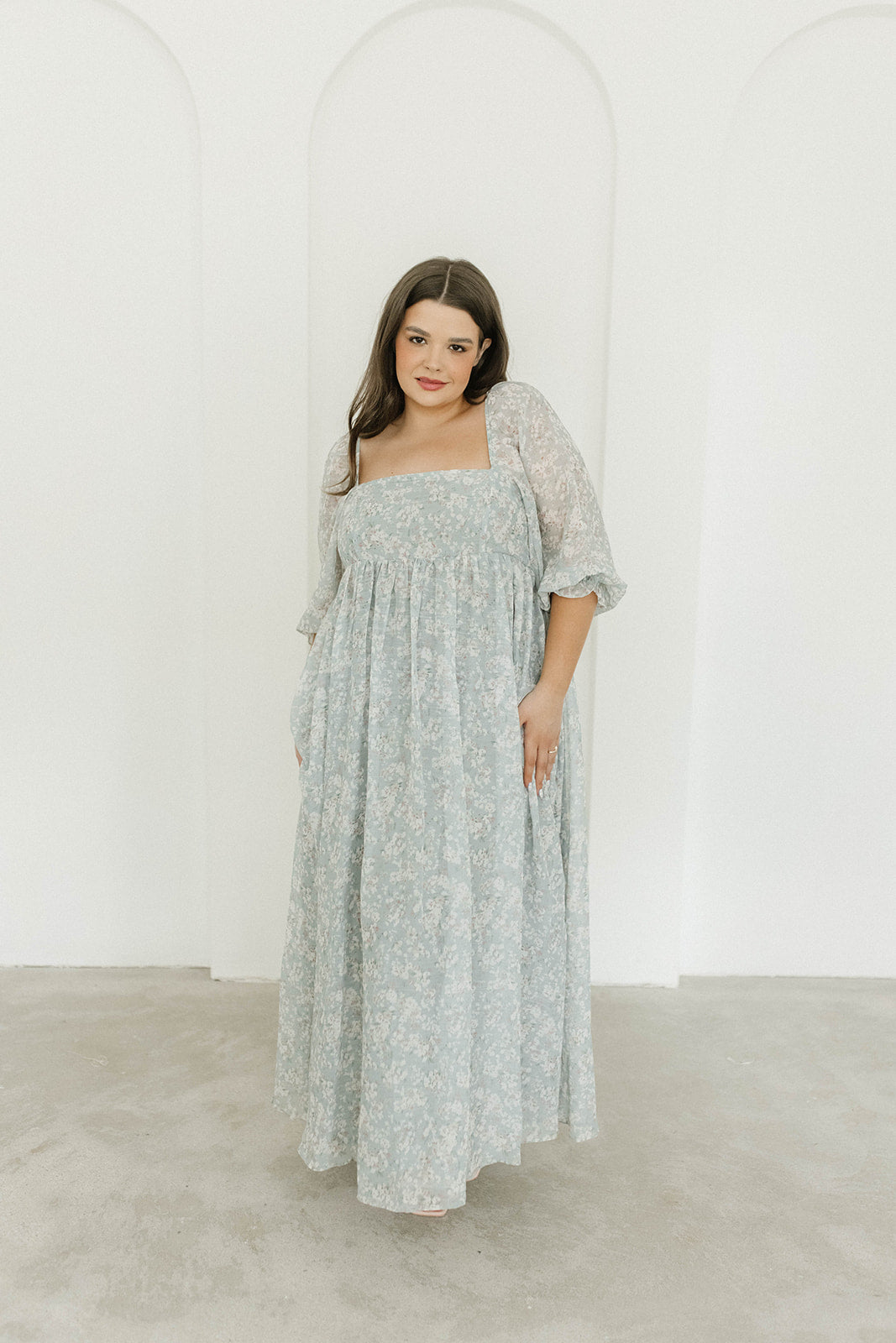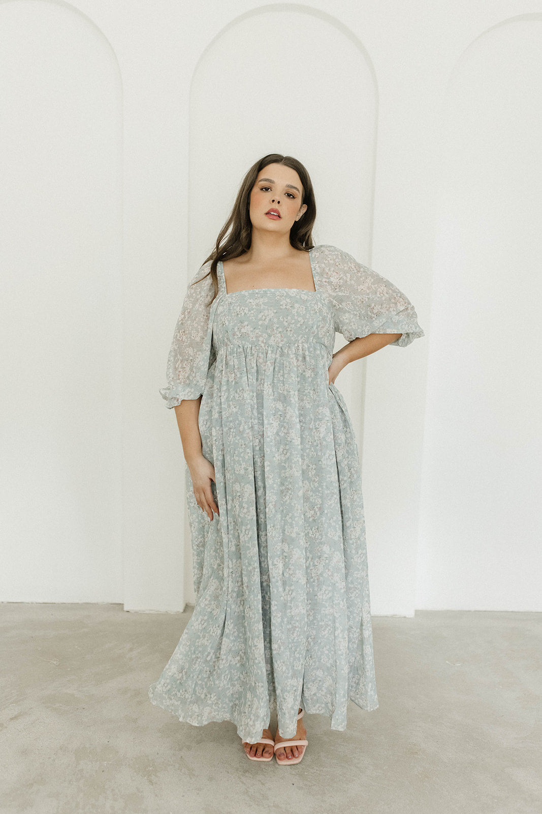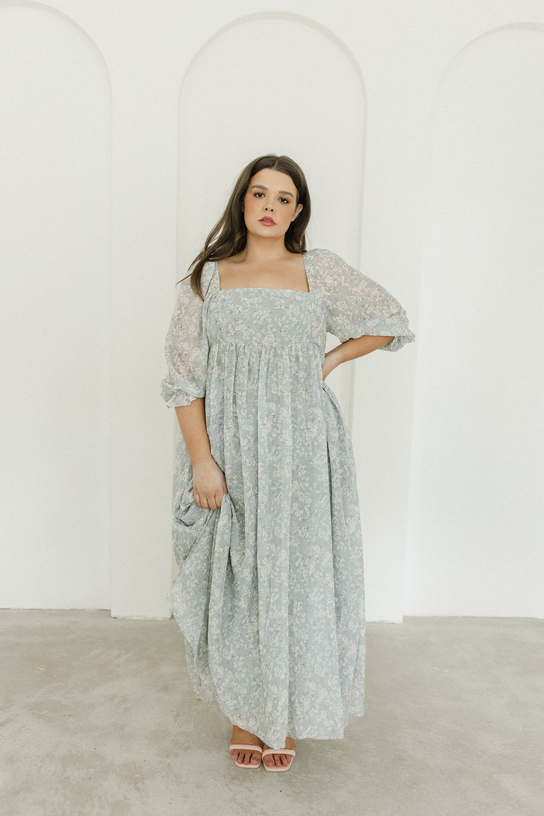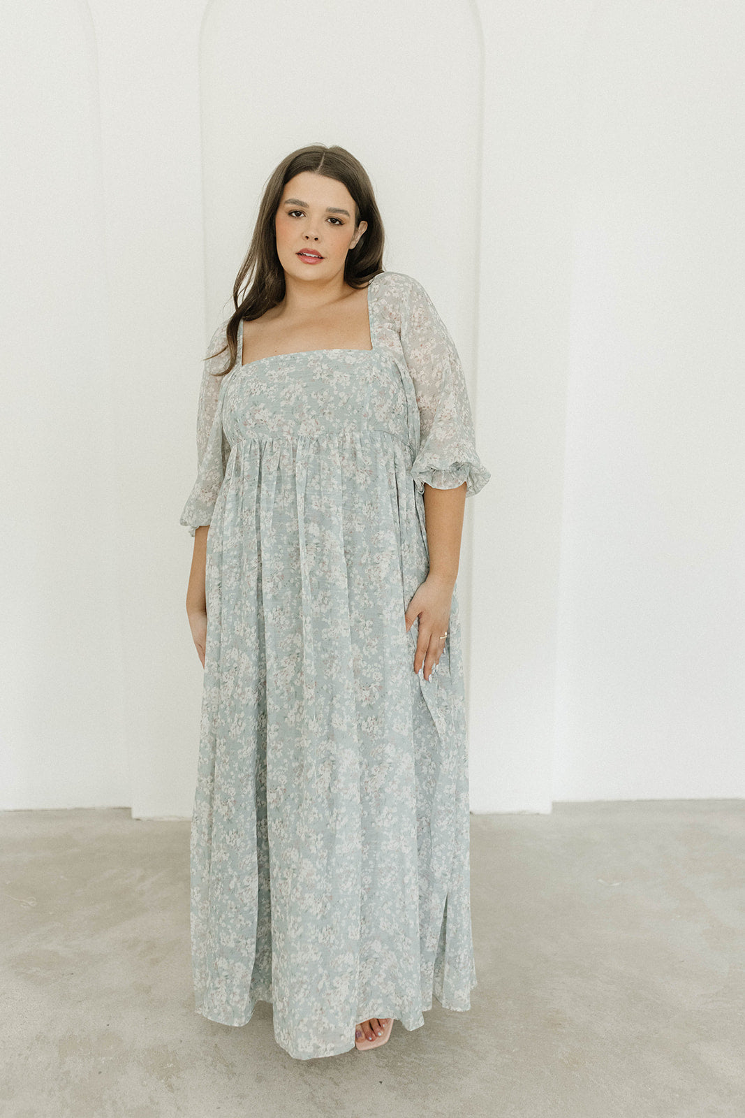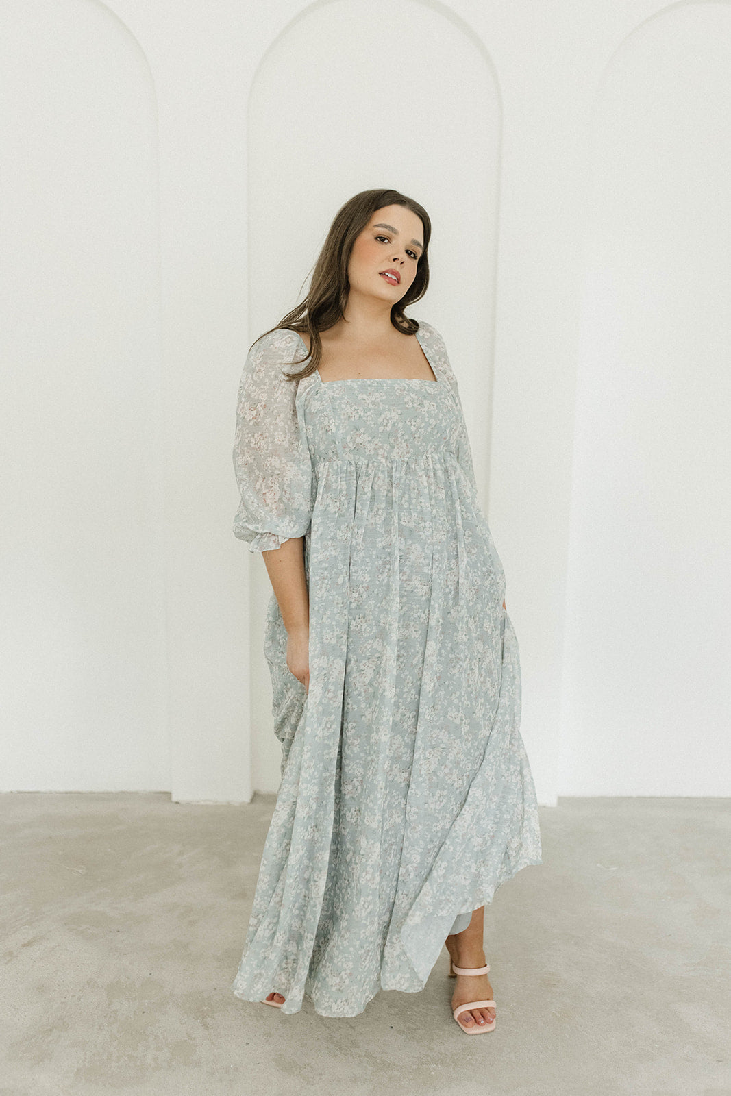 GARMENT DETAILS: Empire-waisted maxi dress in a pastel floral pattern. Features square neckline, sheer 3/4 length puffed sleeves, and bust darts, with a stretchy, smocked back panel. Lined.
