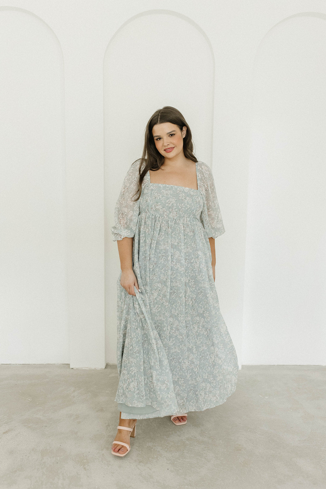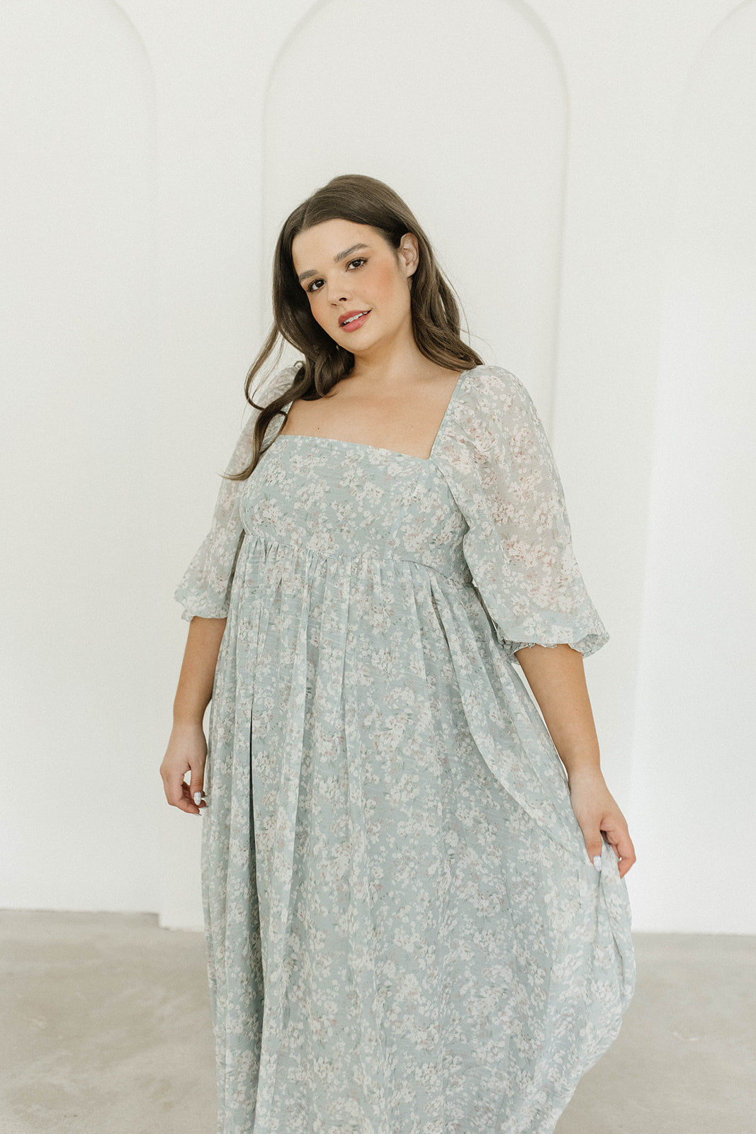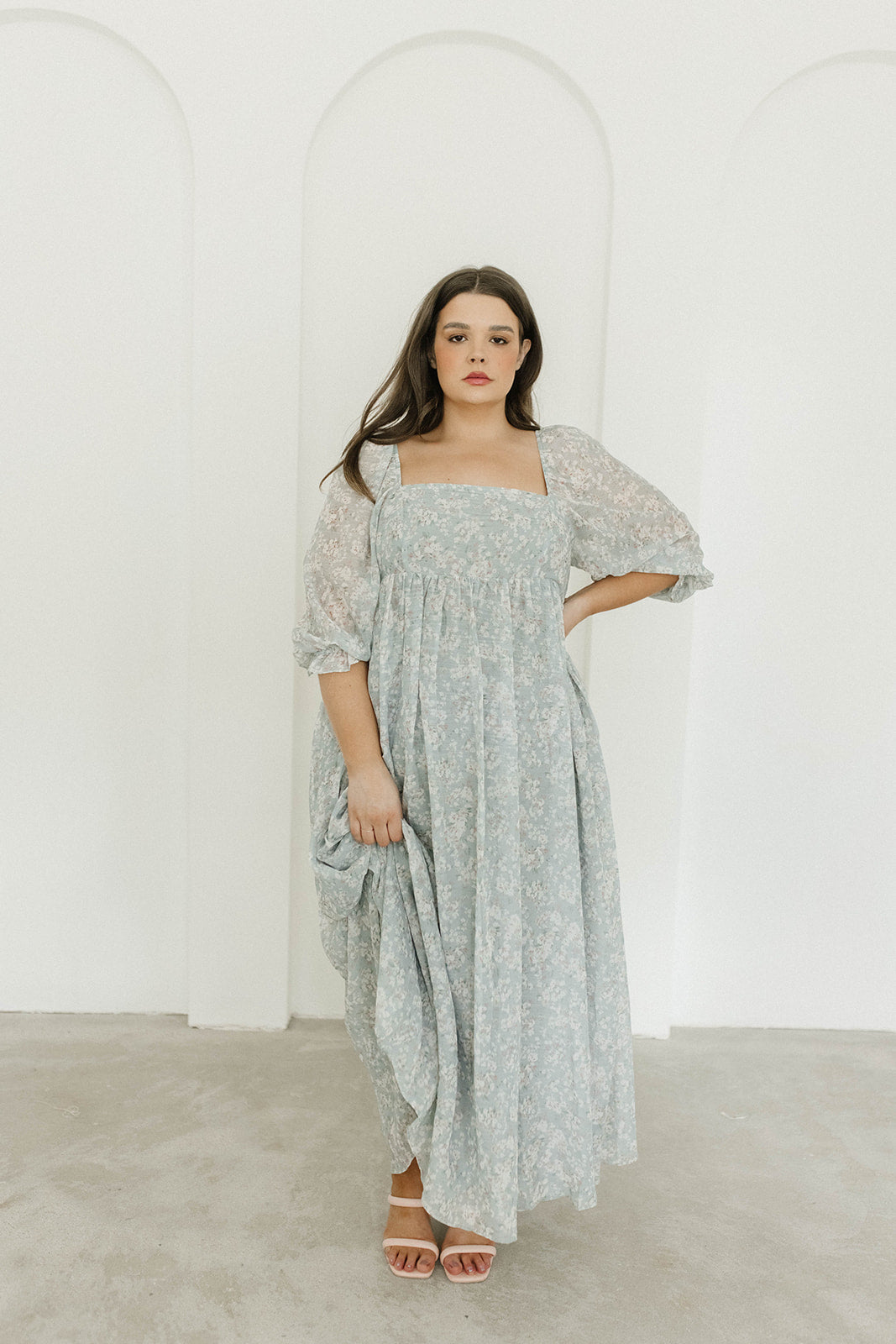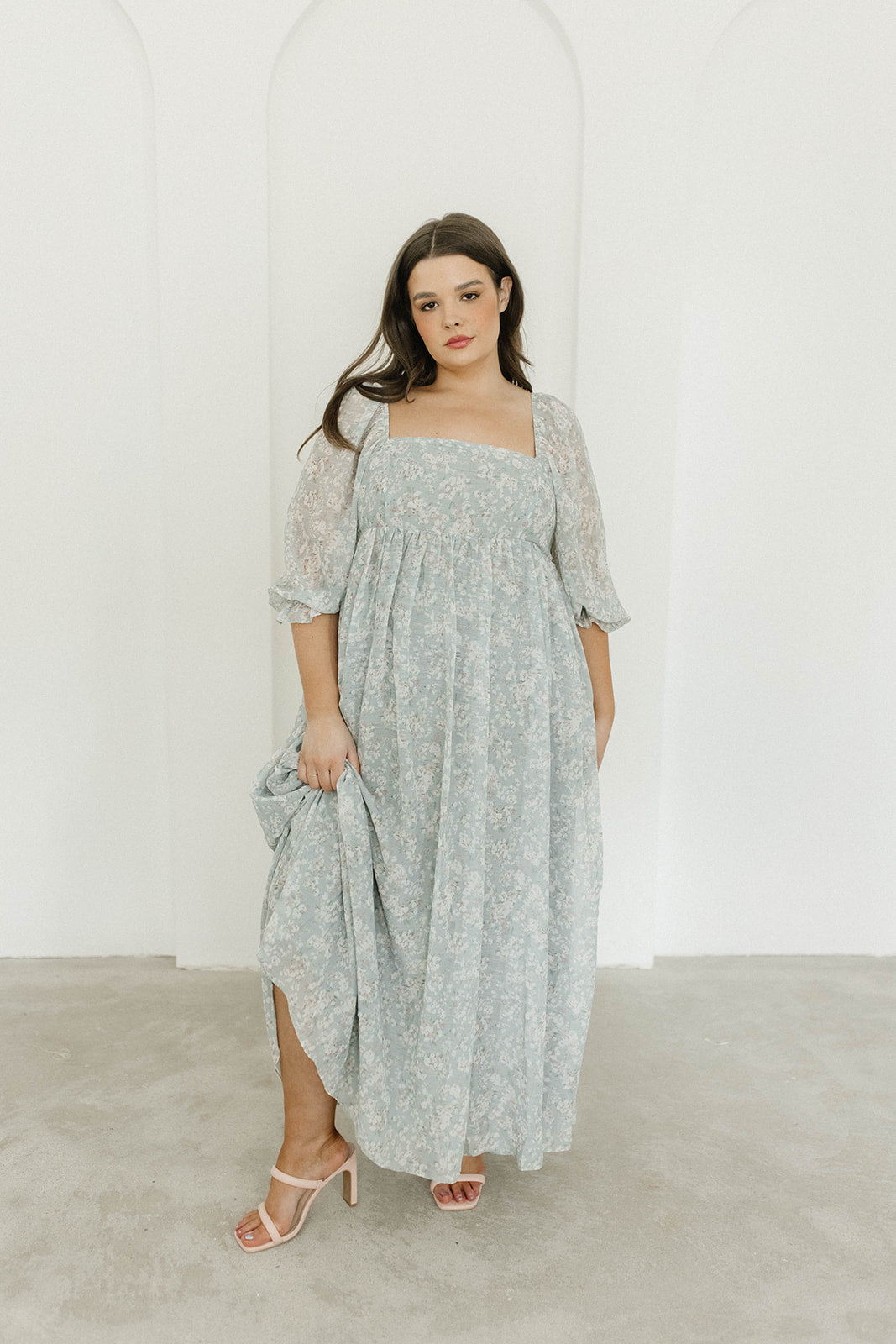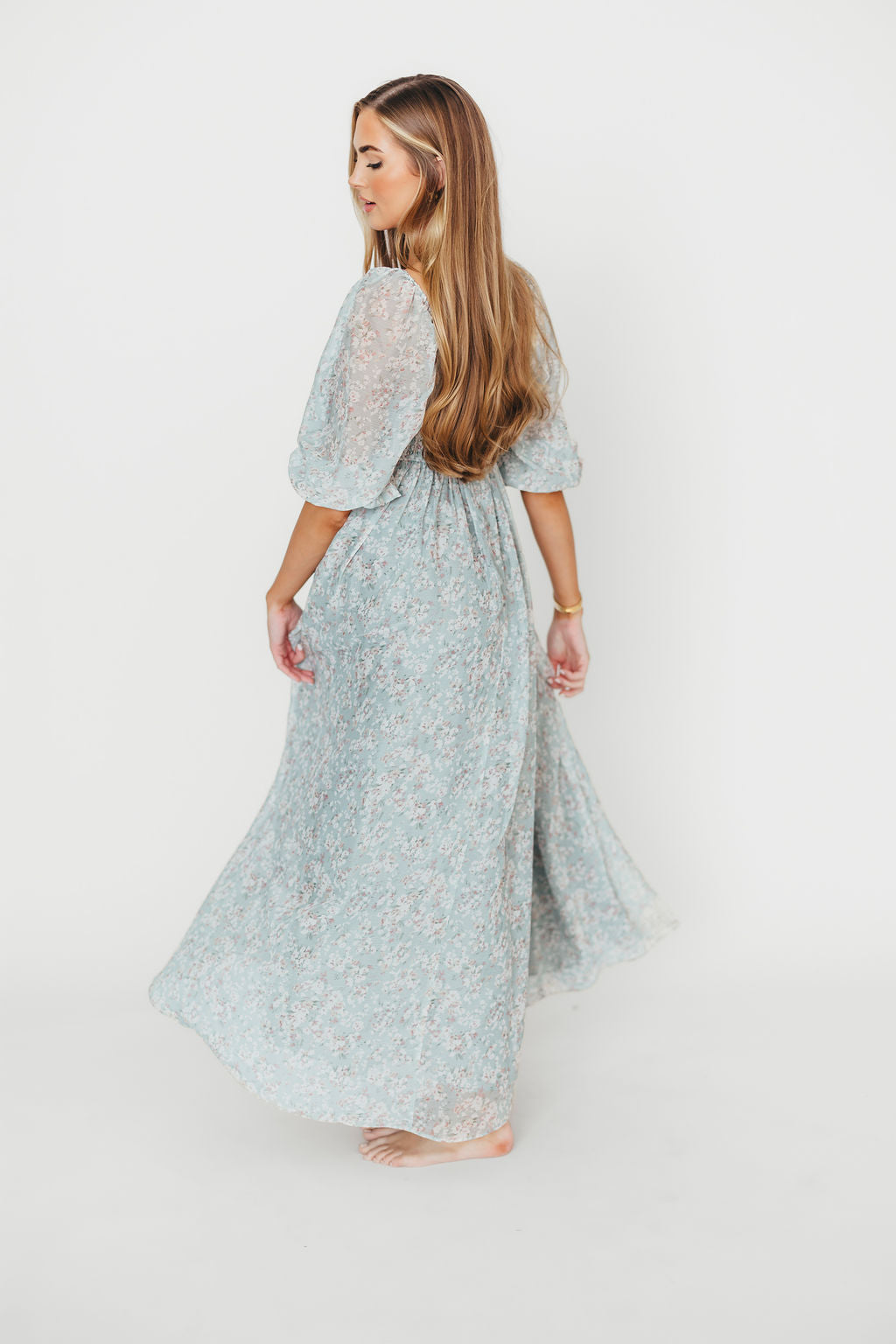 GARMENT DETAILS: Empire-waisted maxi dress in a pastel floral pattern. Features square neckline, sheer 3/4 length puffed sleeves, and bust darts, with a stretchy, smocked back panel. Lined.
