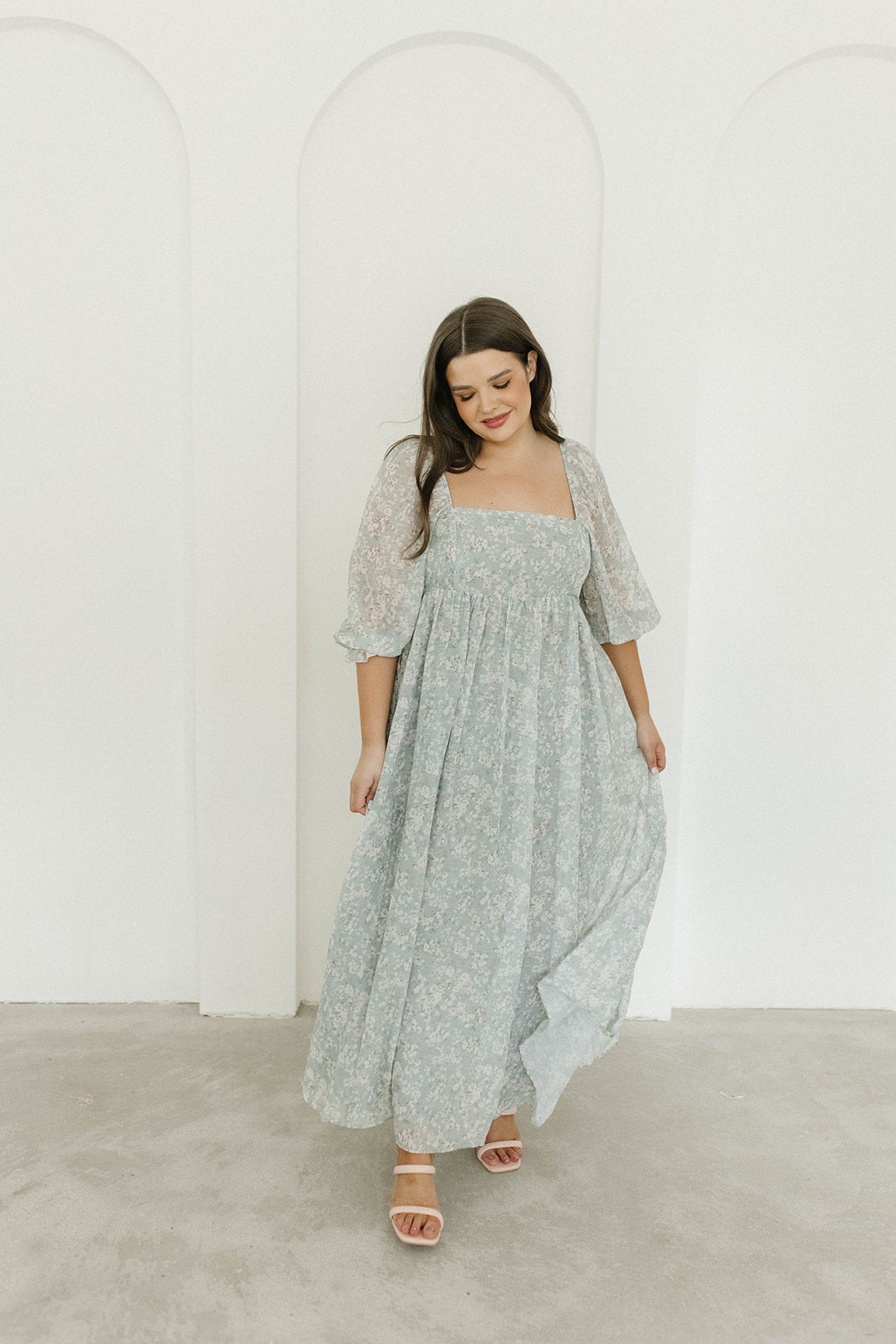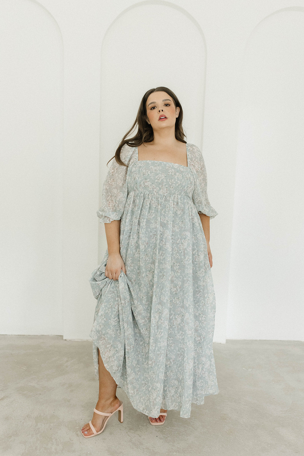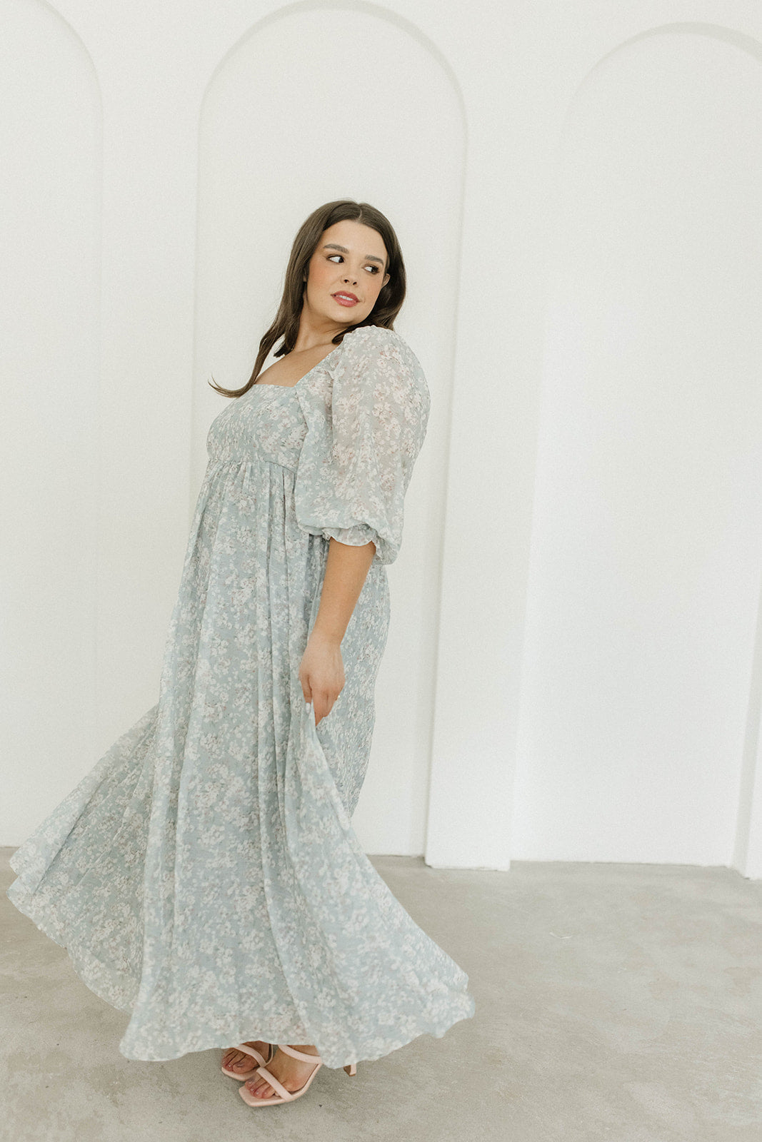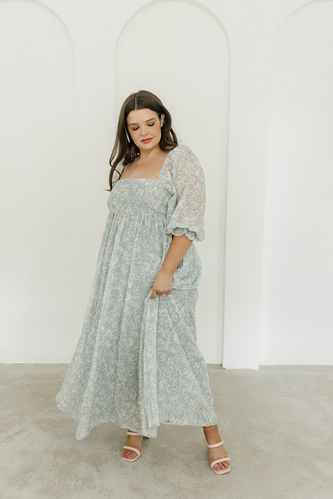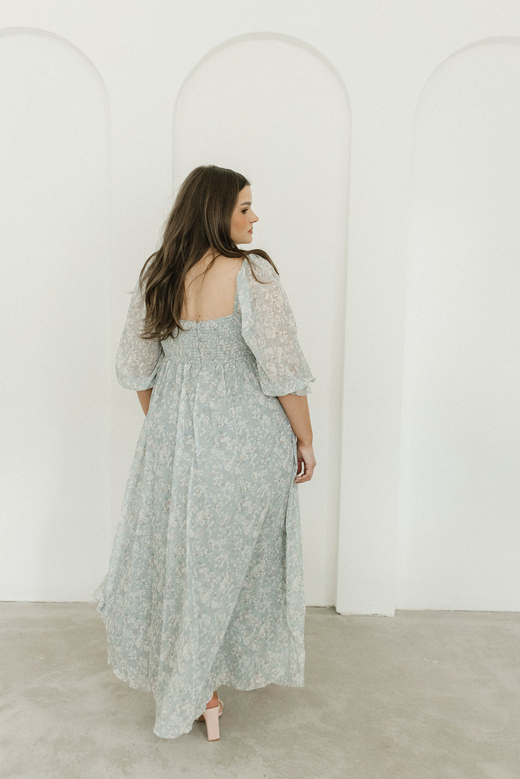 GARMENT DETAILS: Empire-waisted maxi dress in a pastel floral pattern. Features square neckline, sheer 3/4 length puffed sleeves, and bust darts, with a stretchy, smocked back panel. Lined.