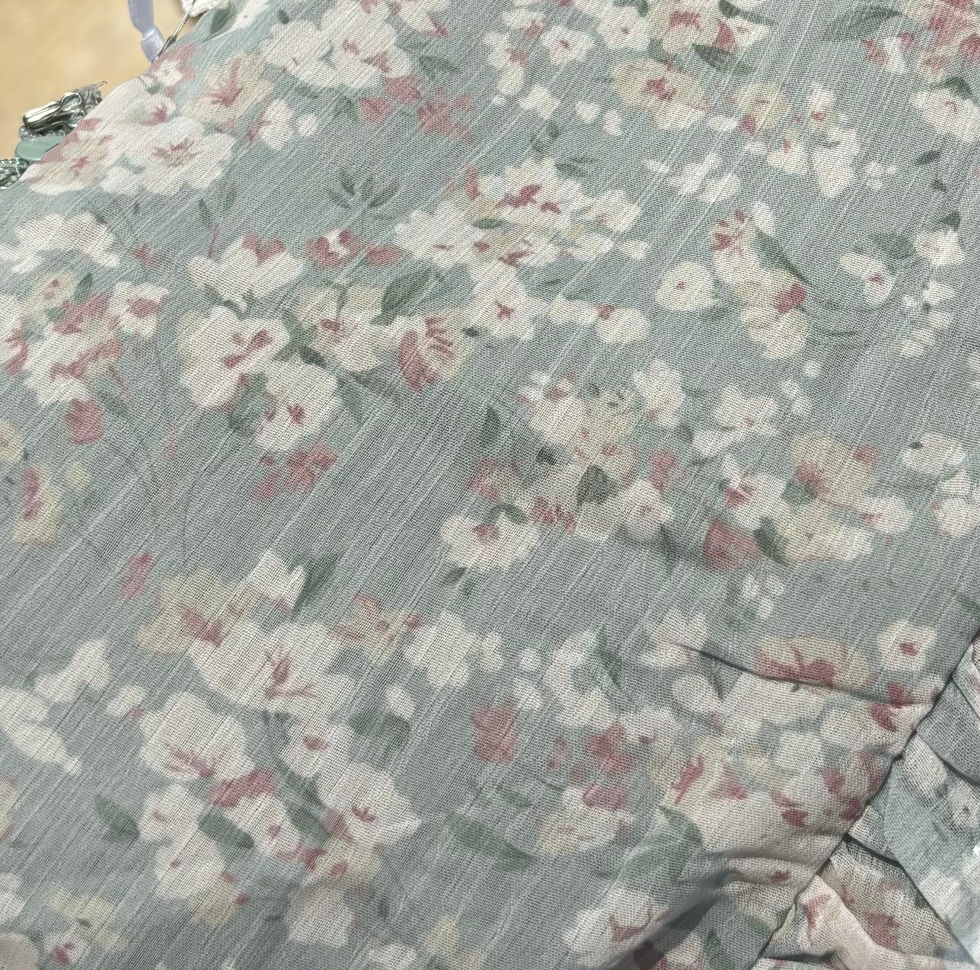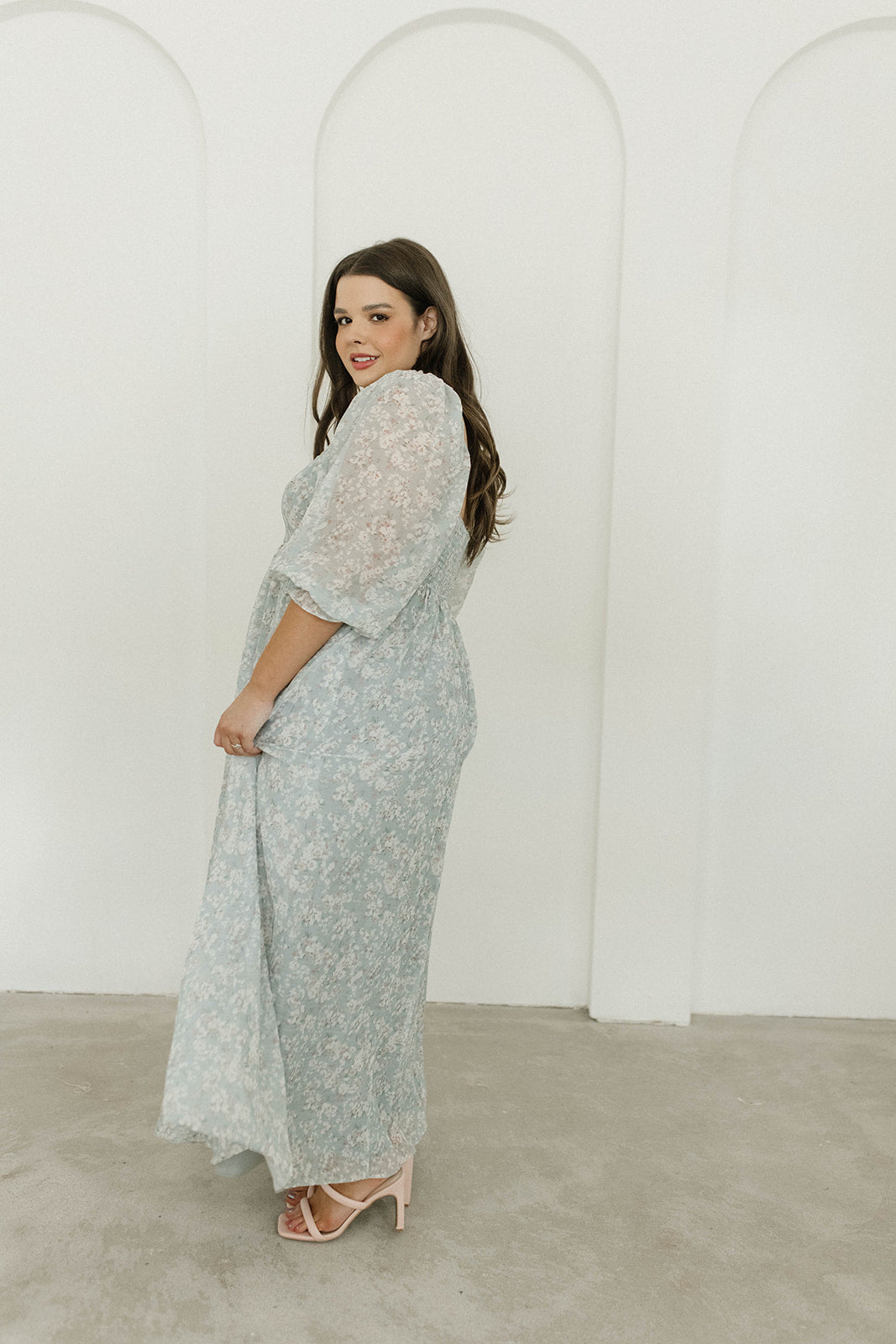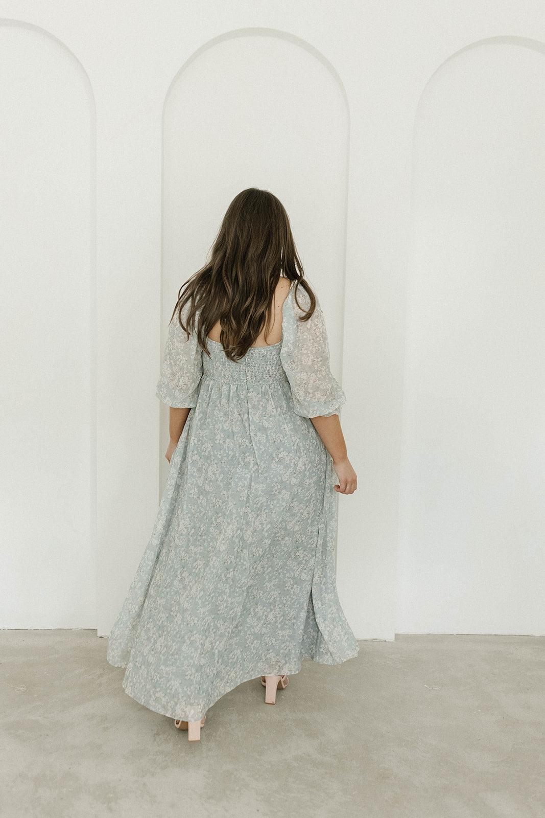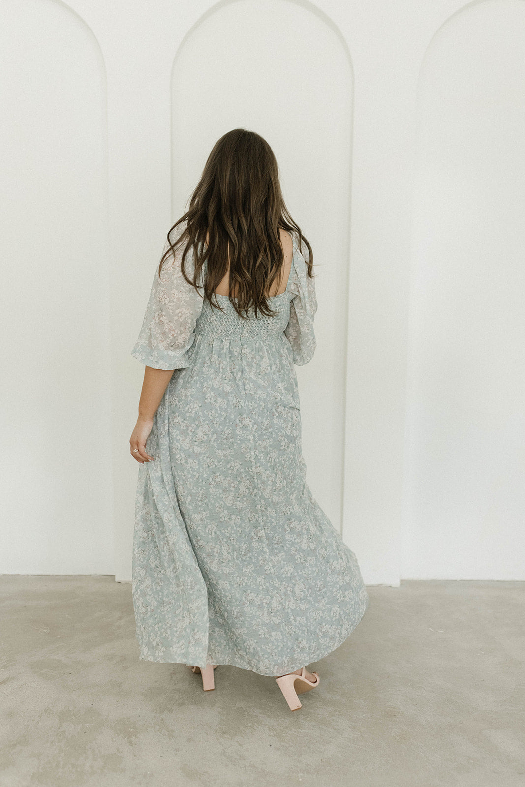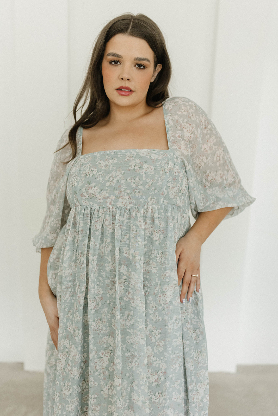 GARMENT DETAILS: Empire-waisted maxi dress in a pastel floral pattern. Features square neckline, sheer 3/4 length puffed sleeves, and bust darts, with a stretchy, smocked back panel. Lined.
