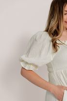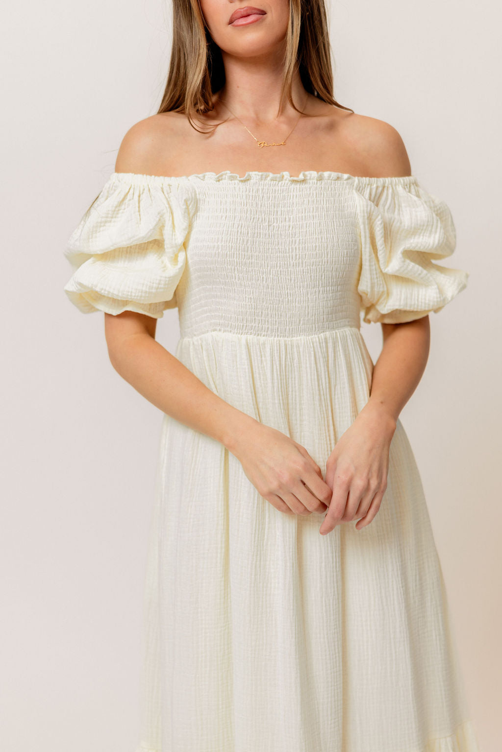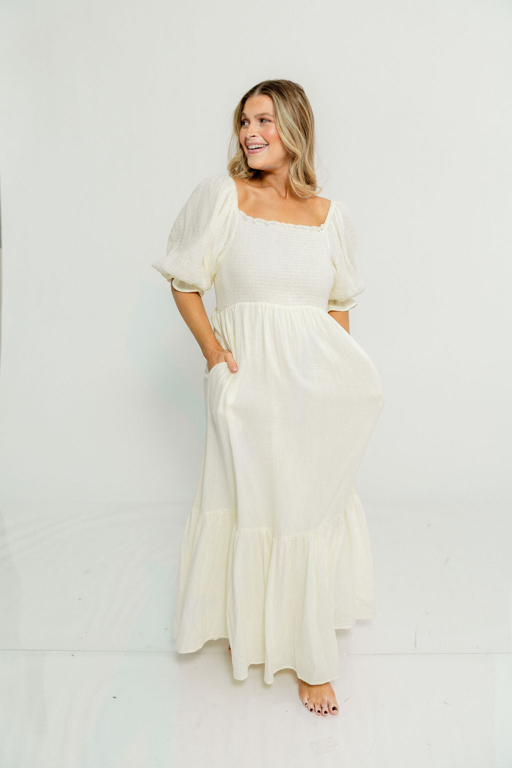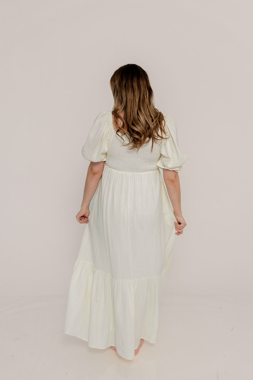 GARMENT DETAILS: Beautiful cotton gauze maxi dress with square neckline, smocked bodice, and puffed 1/2 length sleeves. Features a modest, stretchy neckline that can be worn on or off the shoulders, with a tiered maxi skirt. Fully lined.