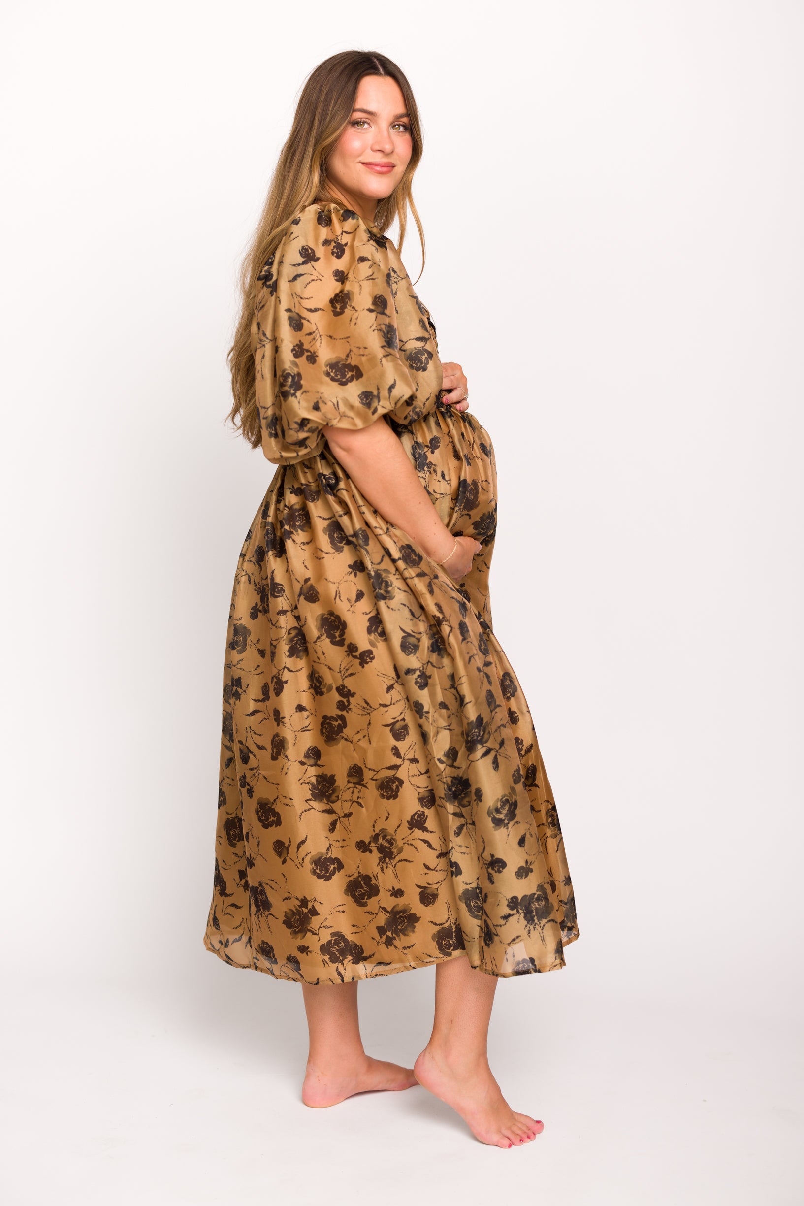 Harlow Camel & Black Floral Maxi Dress with Stretchy Neckline - Bump Friendly (Final Few) *Final Sale*