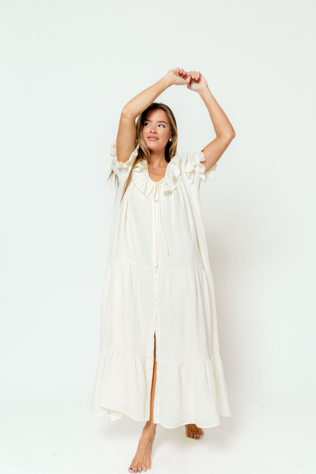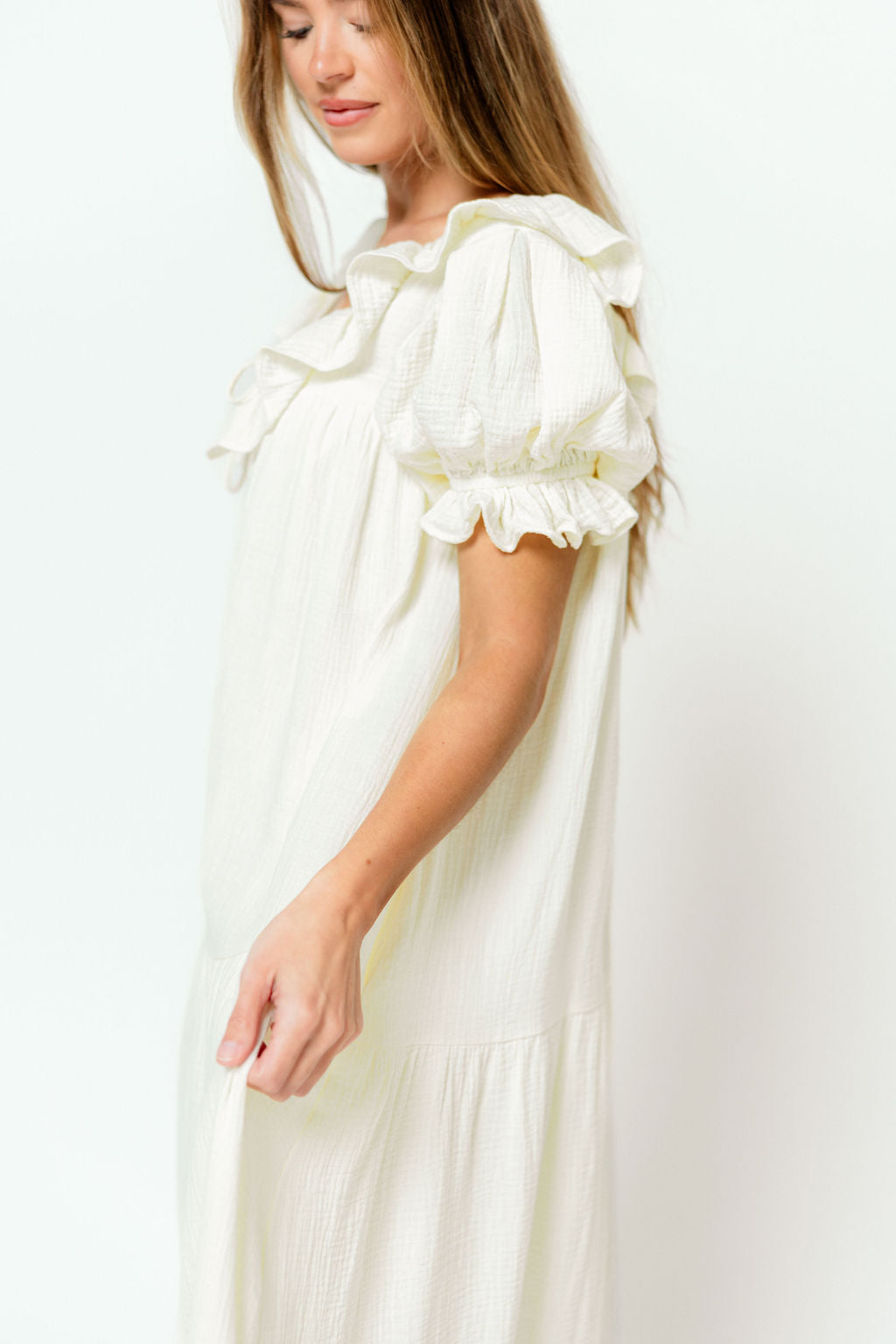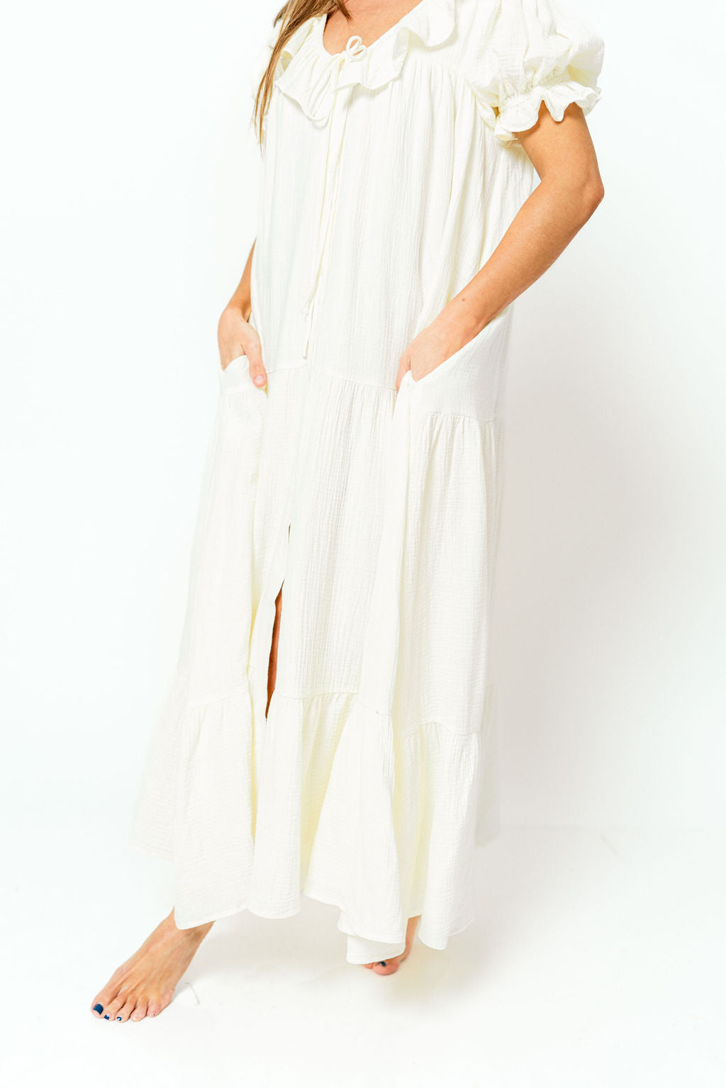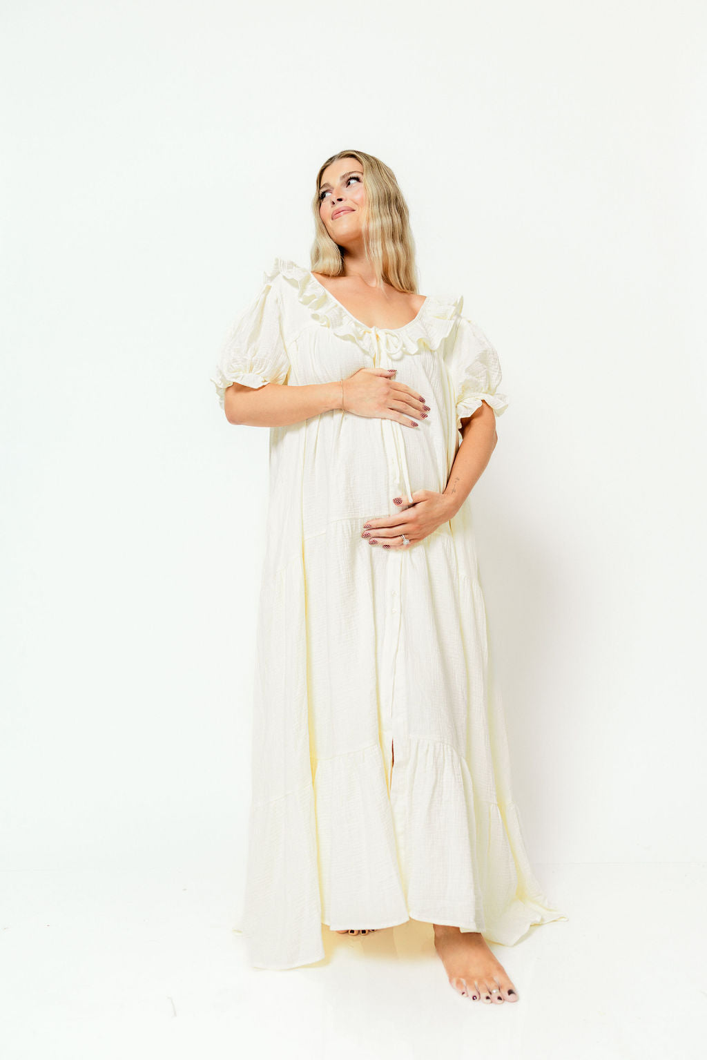 Shower your favorite mama or mama-to-be with comfort and gift them our new Sunday Maxi Dress in Cream! This stunning and ultra-versatile gown is lightweight, extra-flowy, and essentially feminine, with playful ruffled sleeves and a high front slit. It's an effortless choice for anyone and sure to be a spring and summer favorite. P.S. It makes a gorgeous going-home outfit after baby is born!