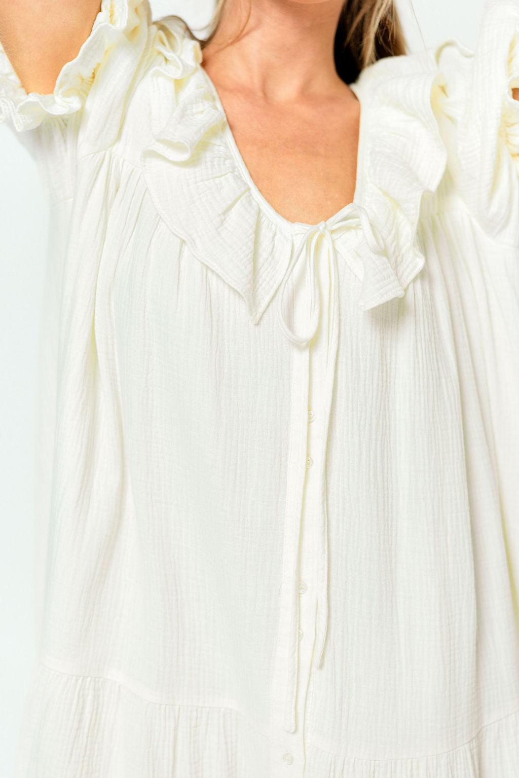 GARMENT DETAILS: Oversized maxi gown with front button closure, ruffled short sleeves, and V-neckline with bow accent. Features a tiered construction and high center front slit.