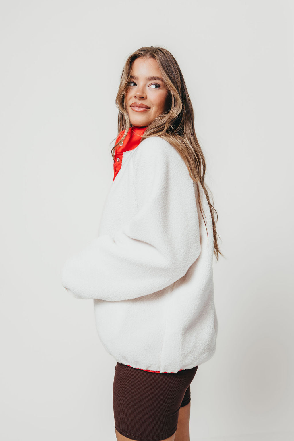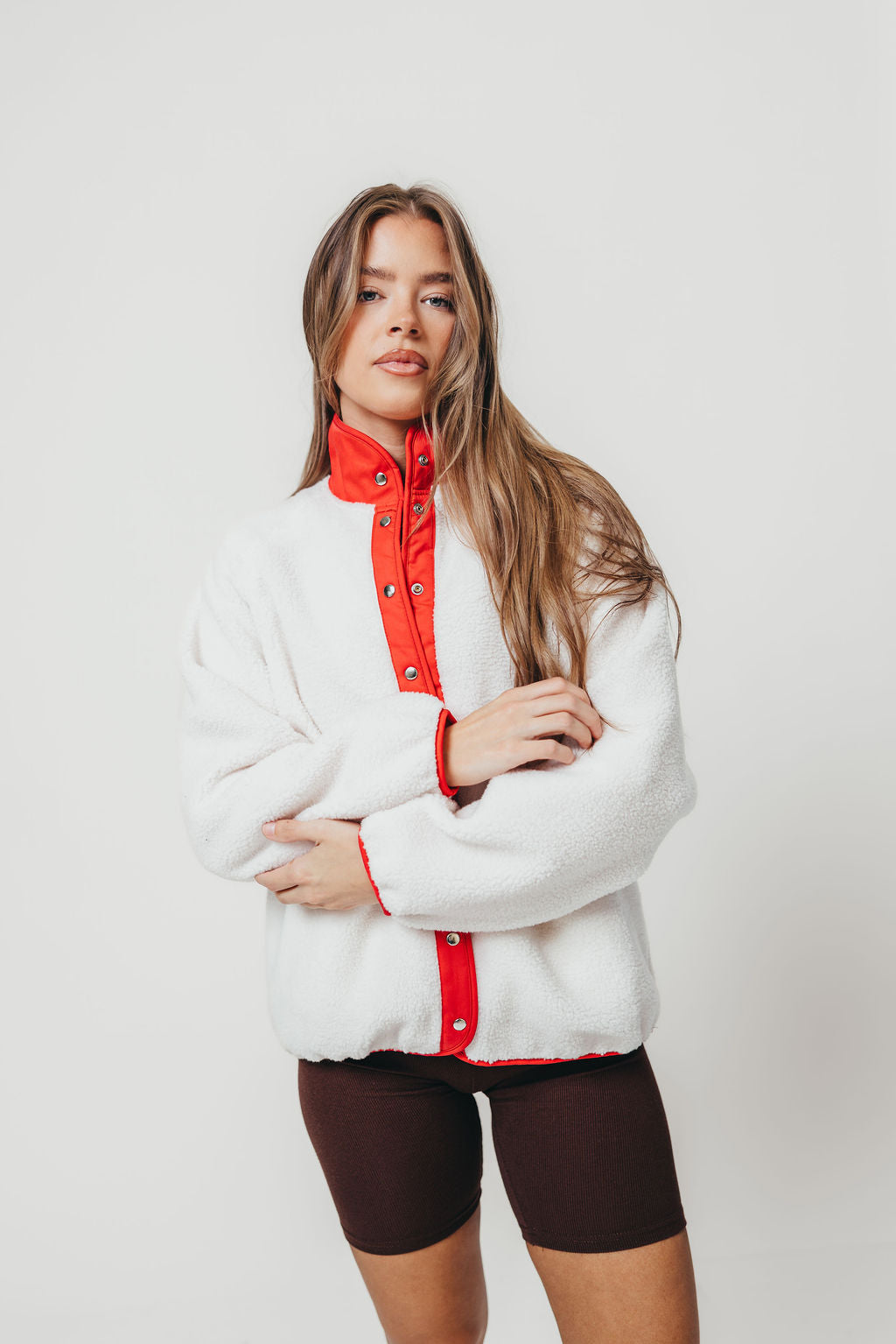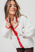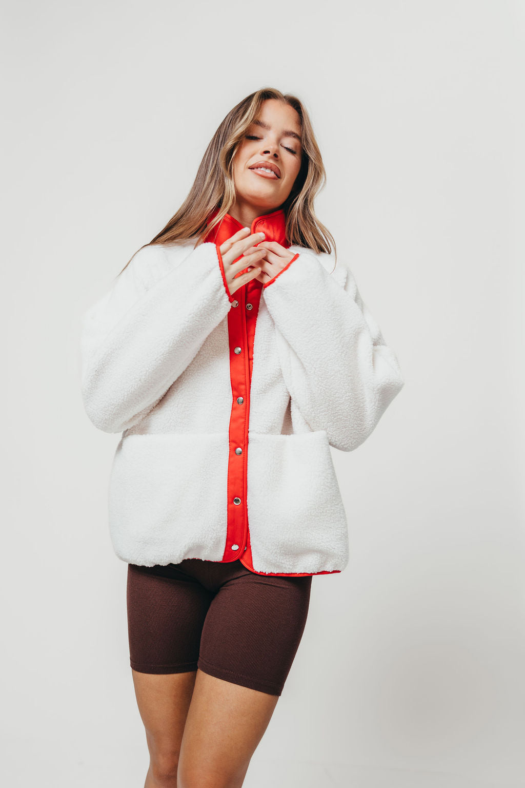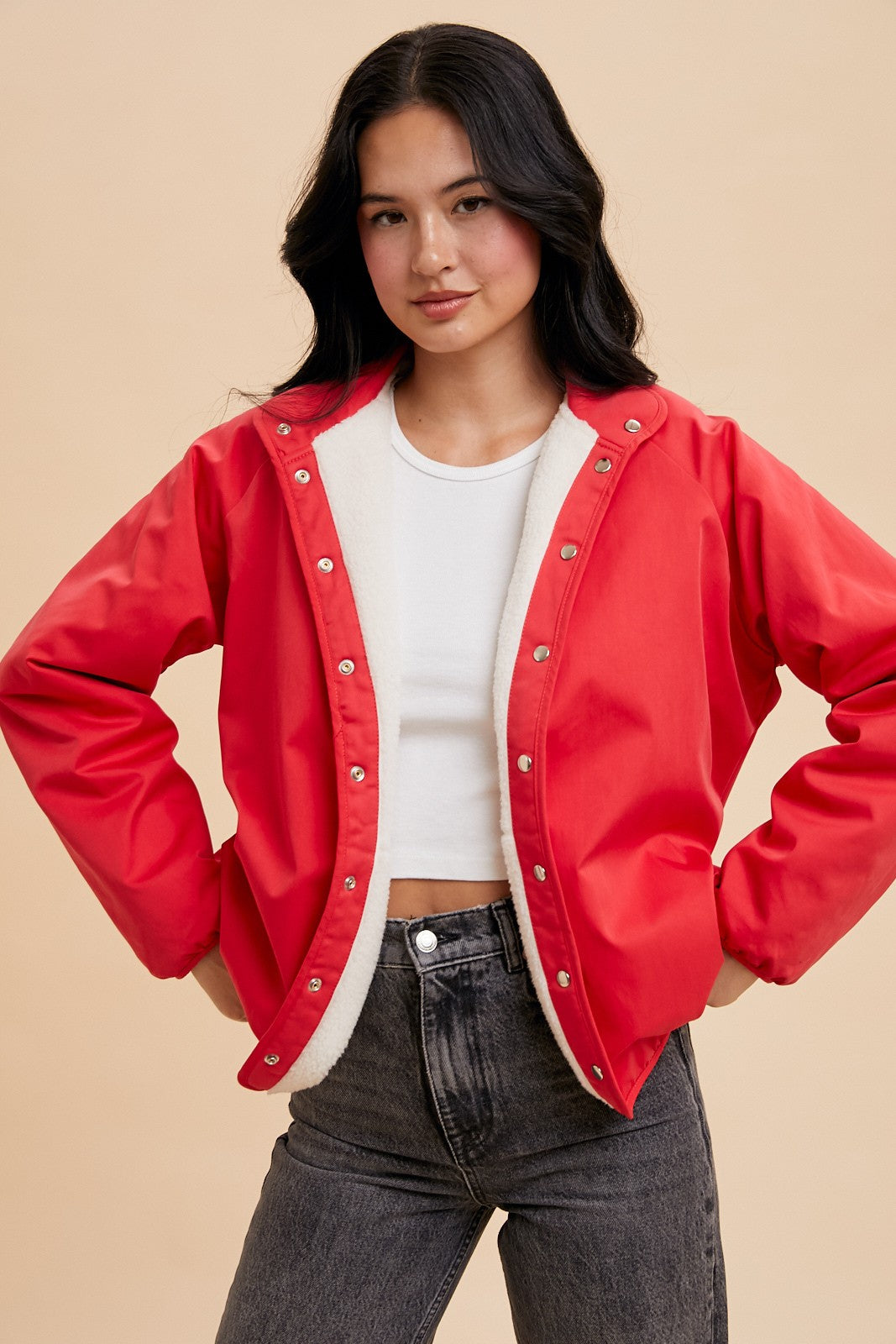 GARMENT DETAILS: Cozy plush sherpa jacket with cotton nylon lining. Features a collared neckline, side pockets, and piped binding accents. Finished with snap button front closure.