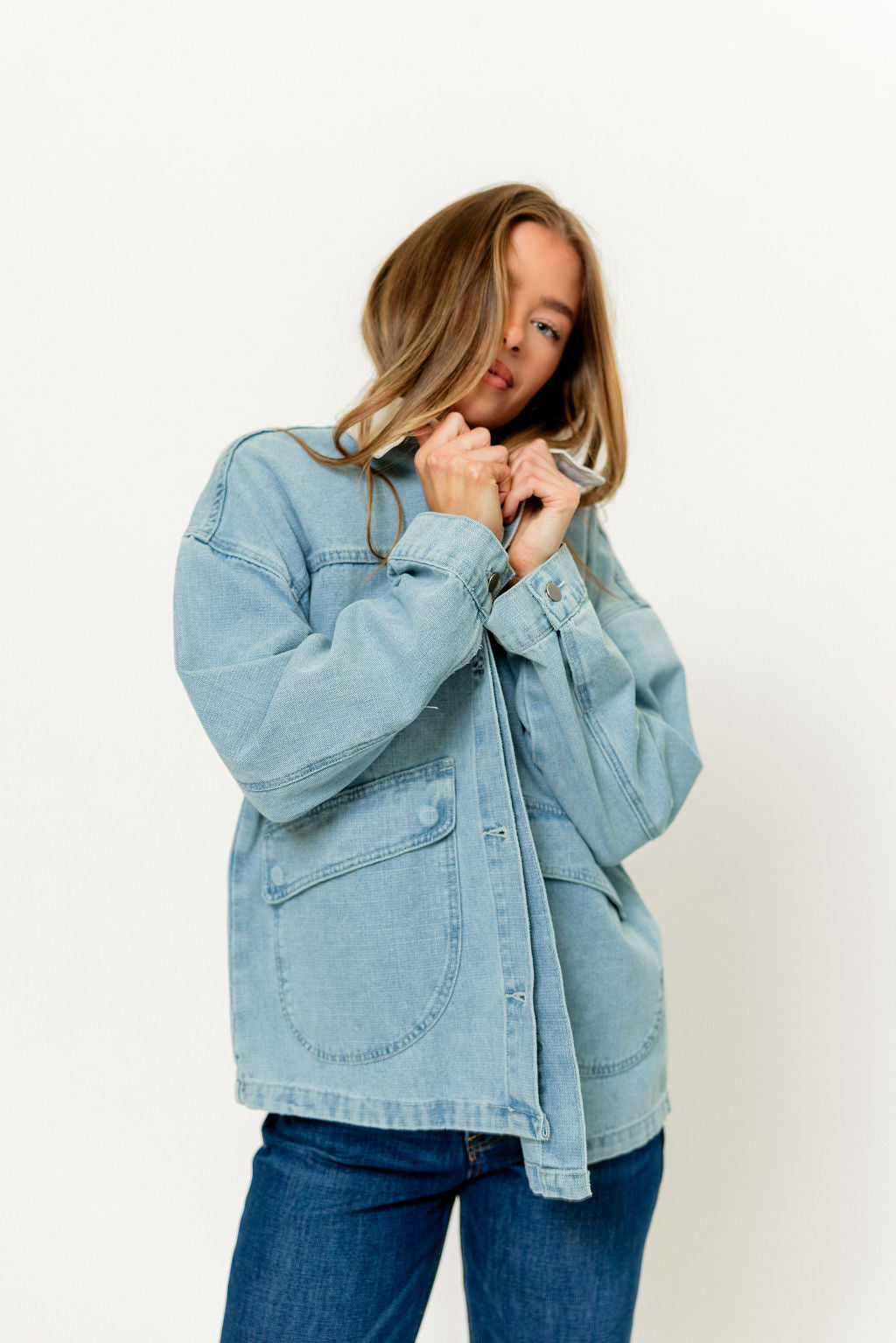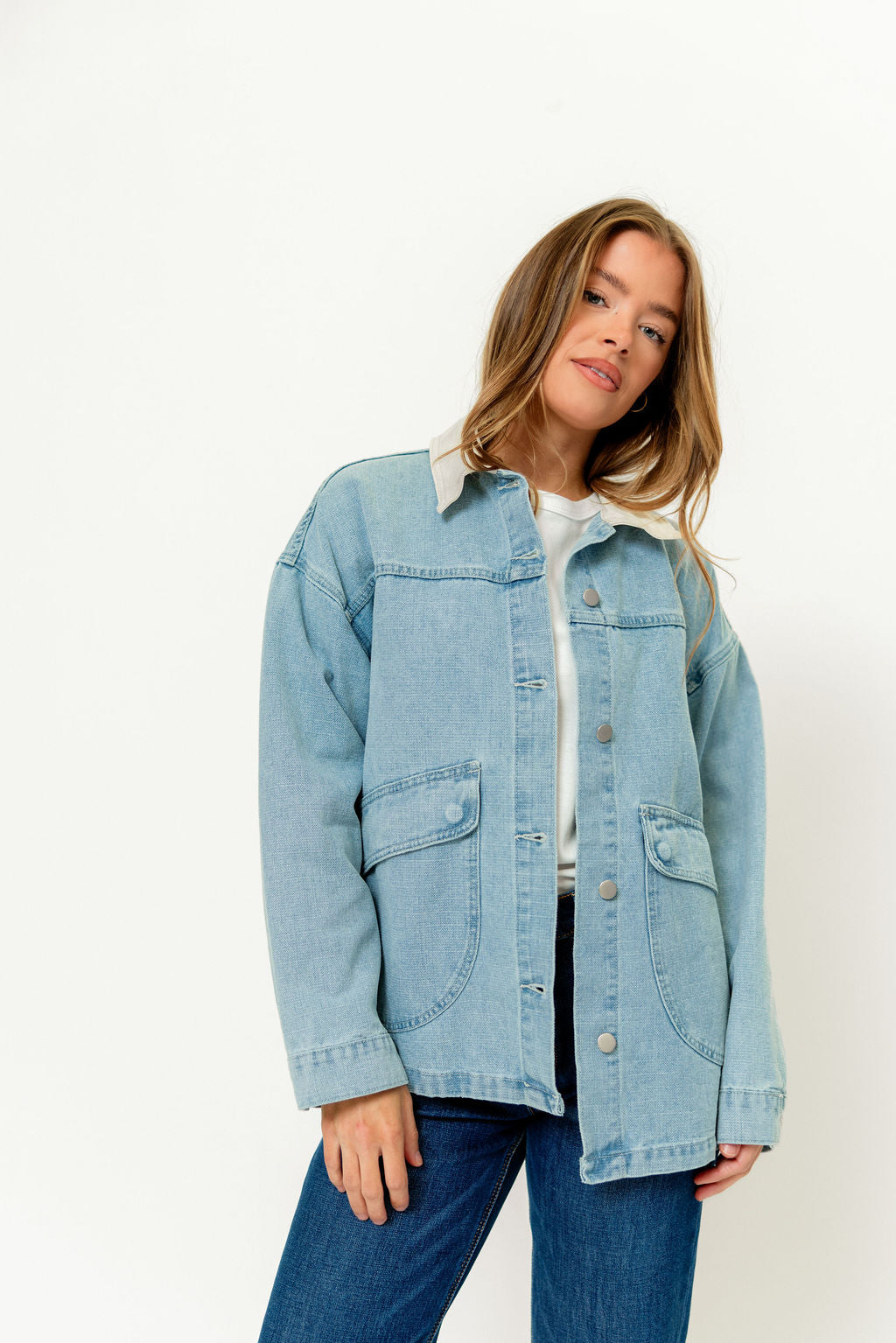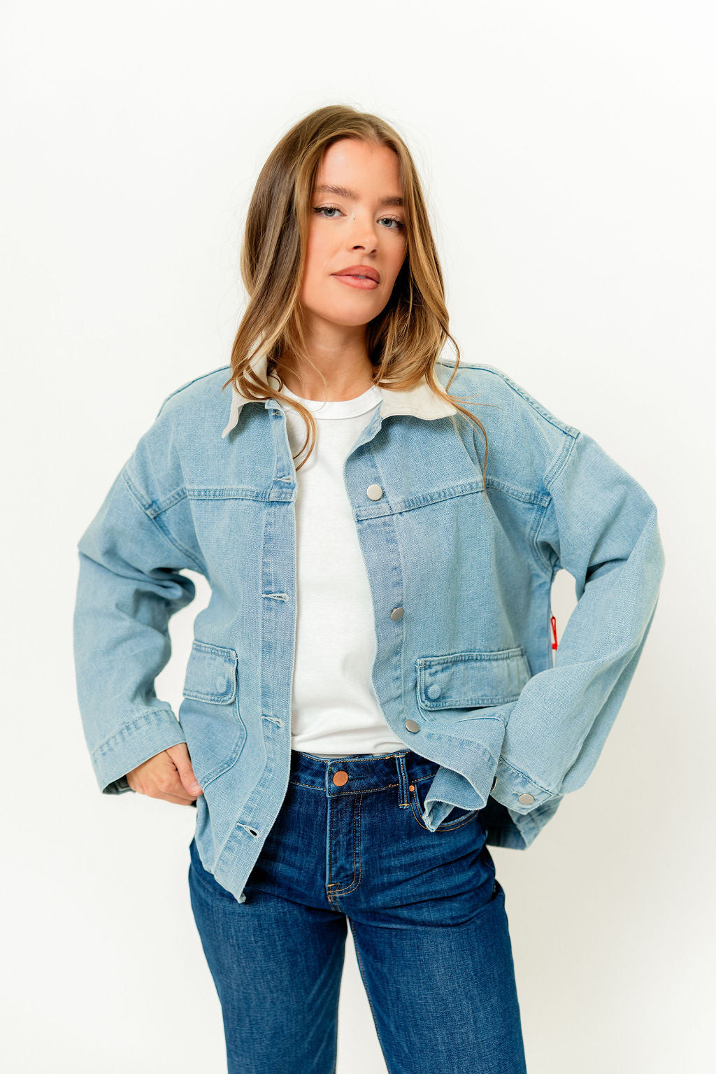 GARMENT DETAILS: Soft cotton denim barn jacket with contrast color collar, front button closure, and relaxed, boxy silhouette. Features oversized front patch pockets.