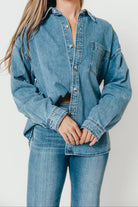 GARMENT DETAILS: Relaxed 100% cotton denim shirt with collared neckline, long sleeves, and front button placket with patch pocket.
