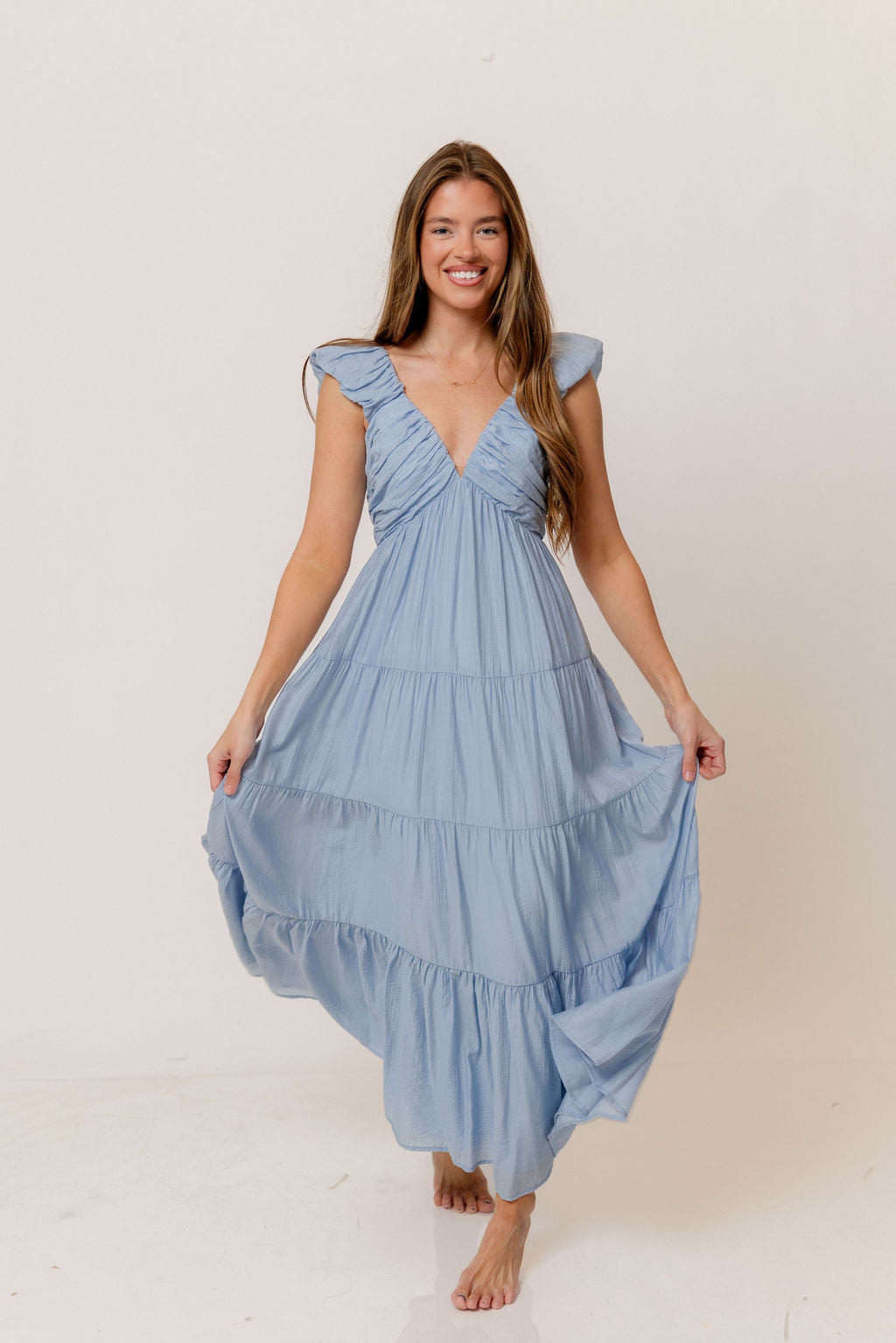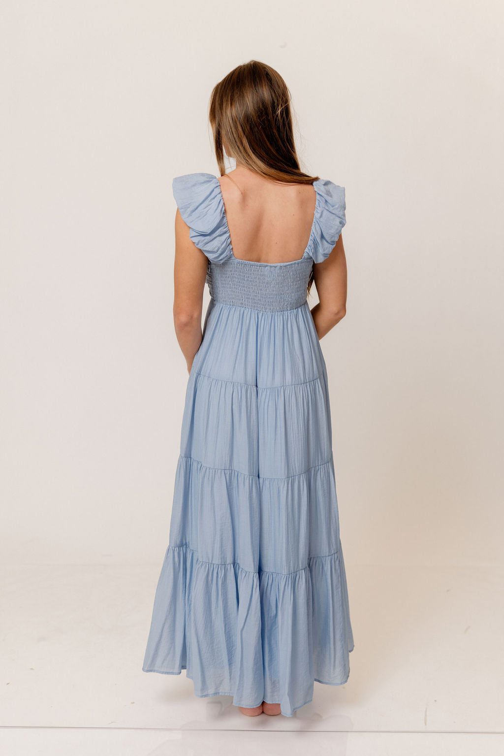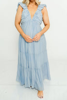 GARMENT DETAILS: Sleeveless, lightweight dress in a maxi length. Features a plunging V-neckline, with ruffled cap sleeves, pleated bodice, and stretchy, smocked back panel. Dress is constructed with an inverted empire waist, with a full, multi-tiered skirt. Partially lined.