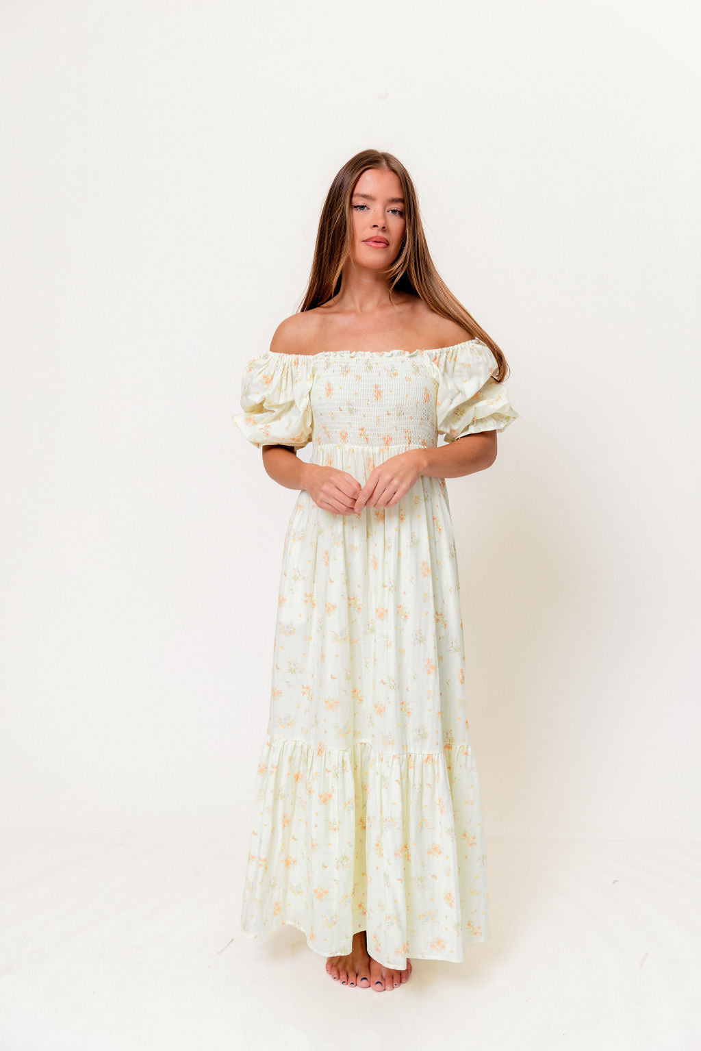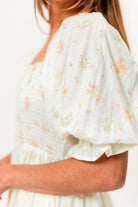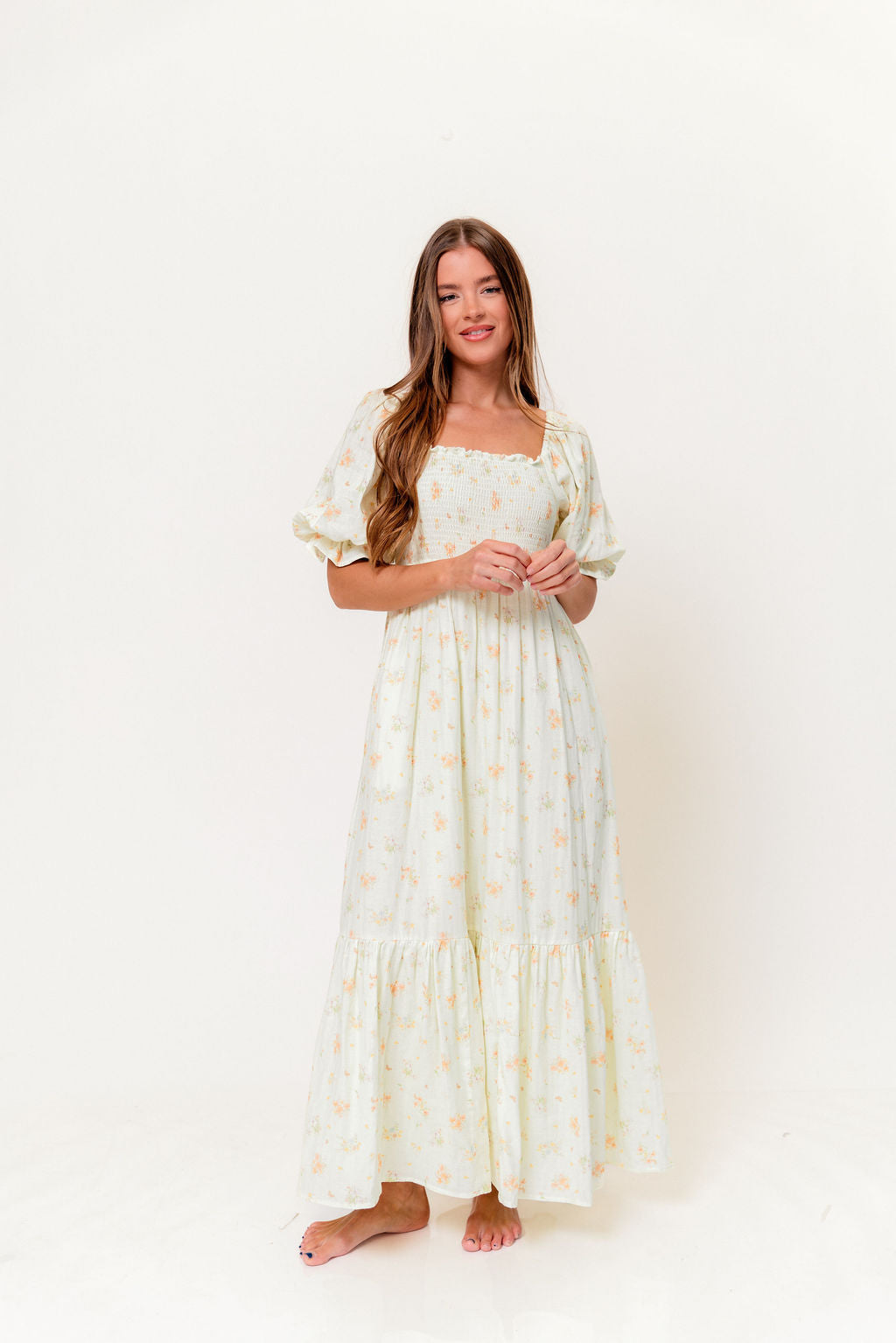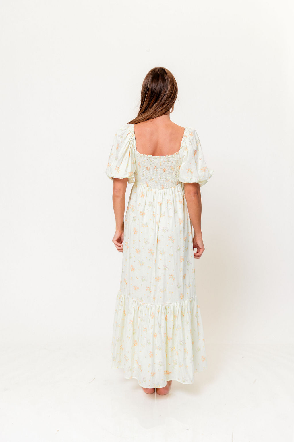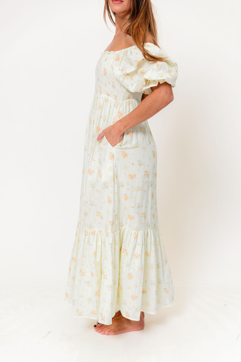 GARMENT DETAILS: Lightweight 100% cotton maxi dress with square neckline, short puff sleeves, and fully smocked, stretchy bodice. Features an elegant floral print and side pockets. Elasticated neckline can be worn on or off the shoulders. This colorway is fully lined.