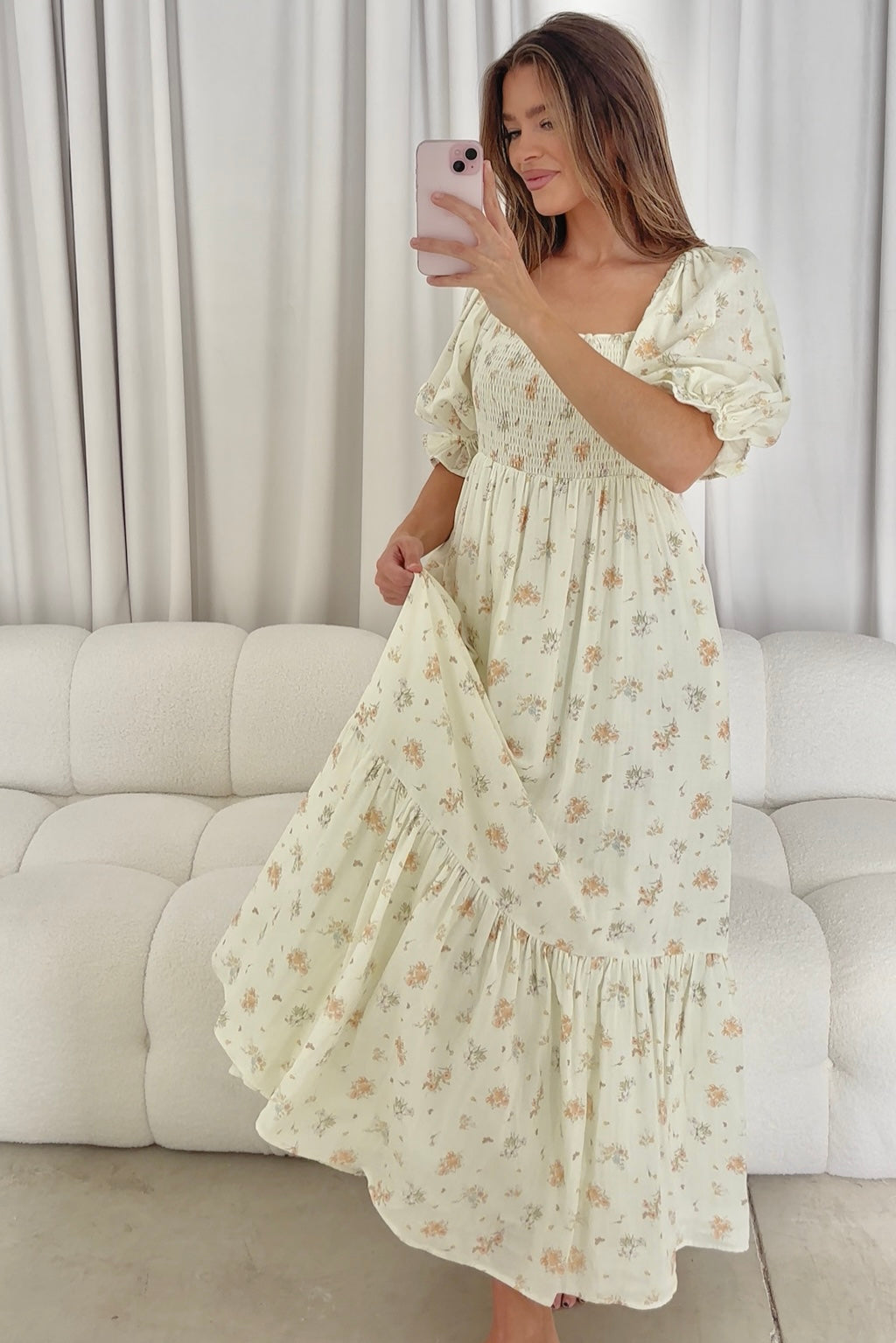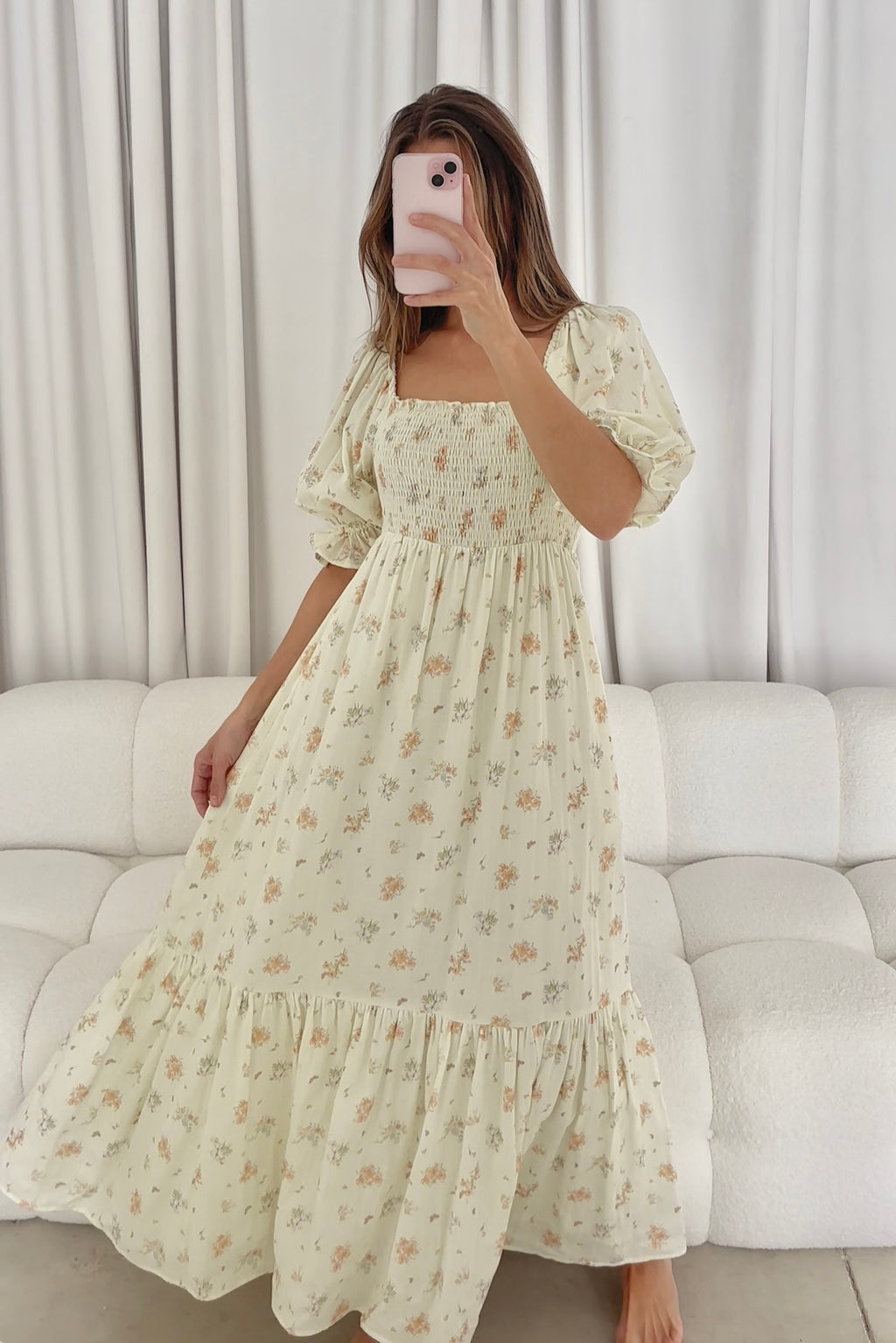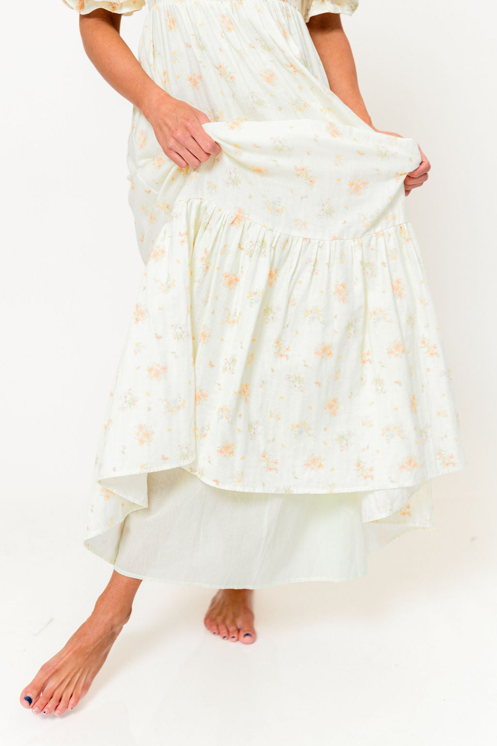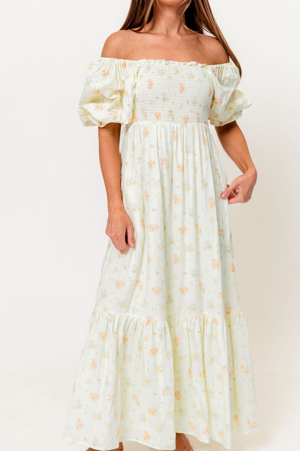GARMENT DETAILS: Lightweight 100% cotton maxi dress with square neckline, short puff sleeves, and fully smocked, stretchy bodice. Features an elegant floral print and side pockets. Elasticated neckline can be worn on or off the shoulders. This colorway is fully lined.