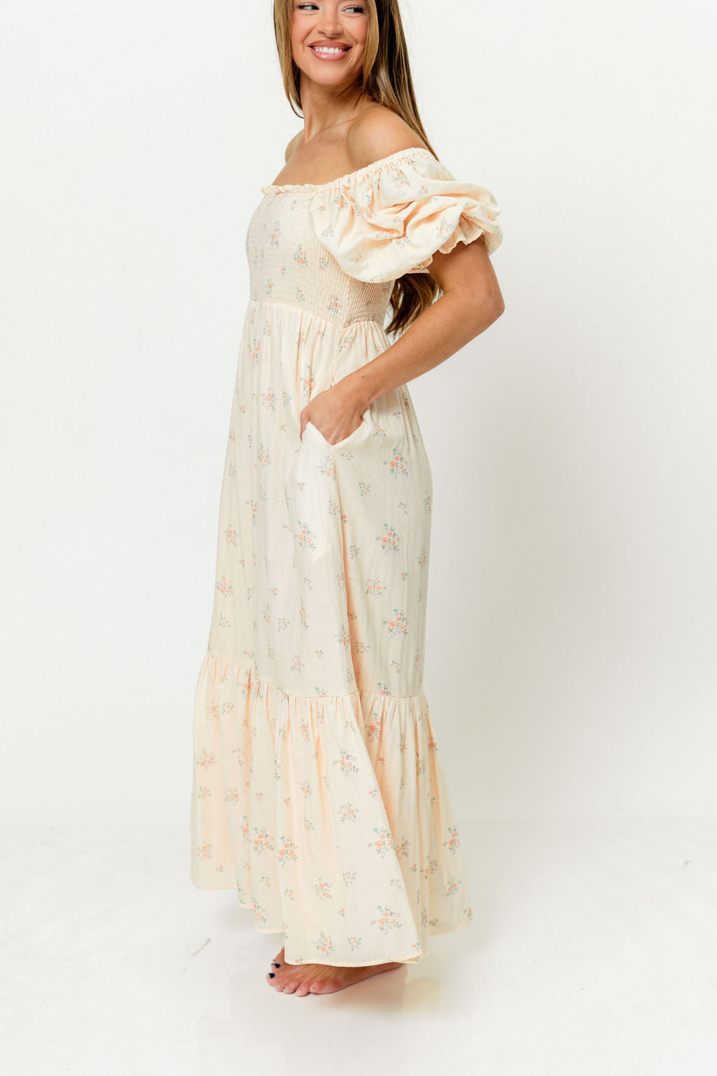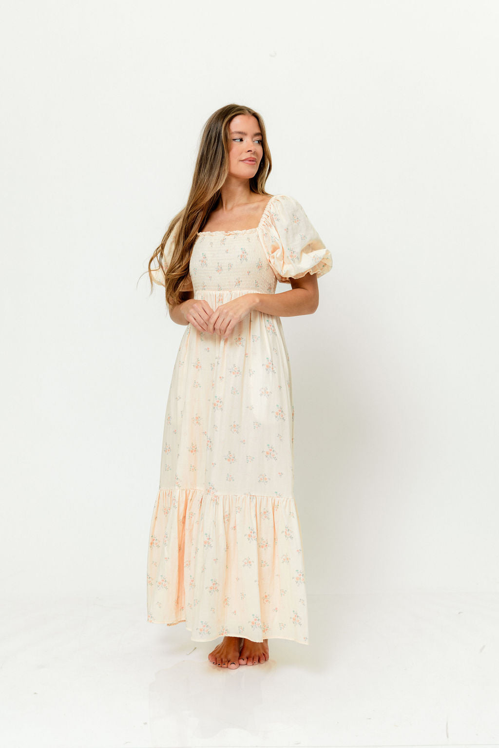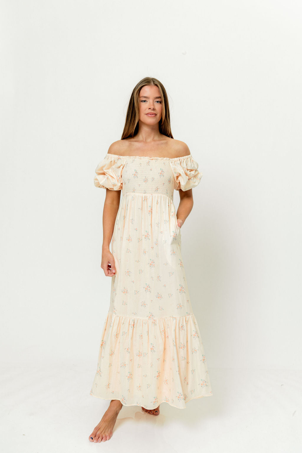 GARMENT DETAILS: Lightweight 100% cotton maxi dress with square neckline, short puff sleeves, and fully smocked, stretchy bodice. Features an elegant floral print and side pockets. Elasticated neckline can be worn on or off the shoulders. Lined.