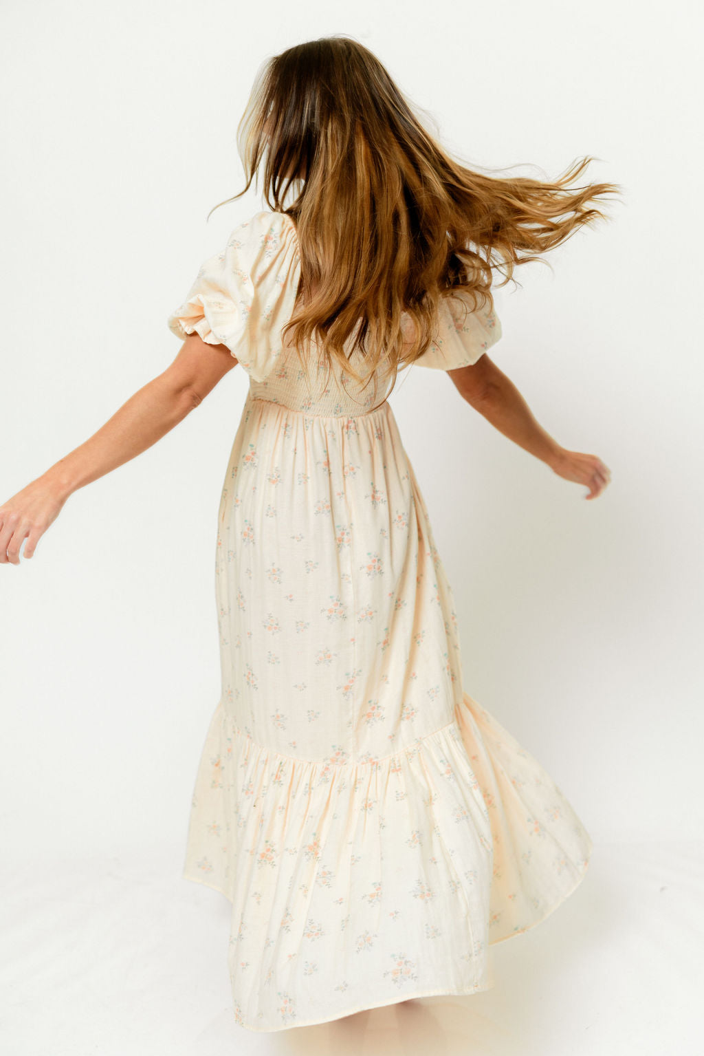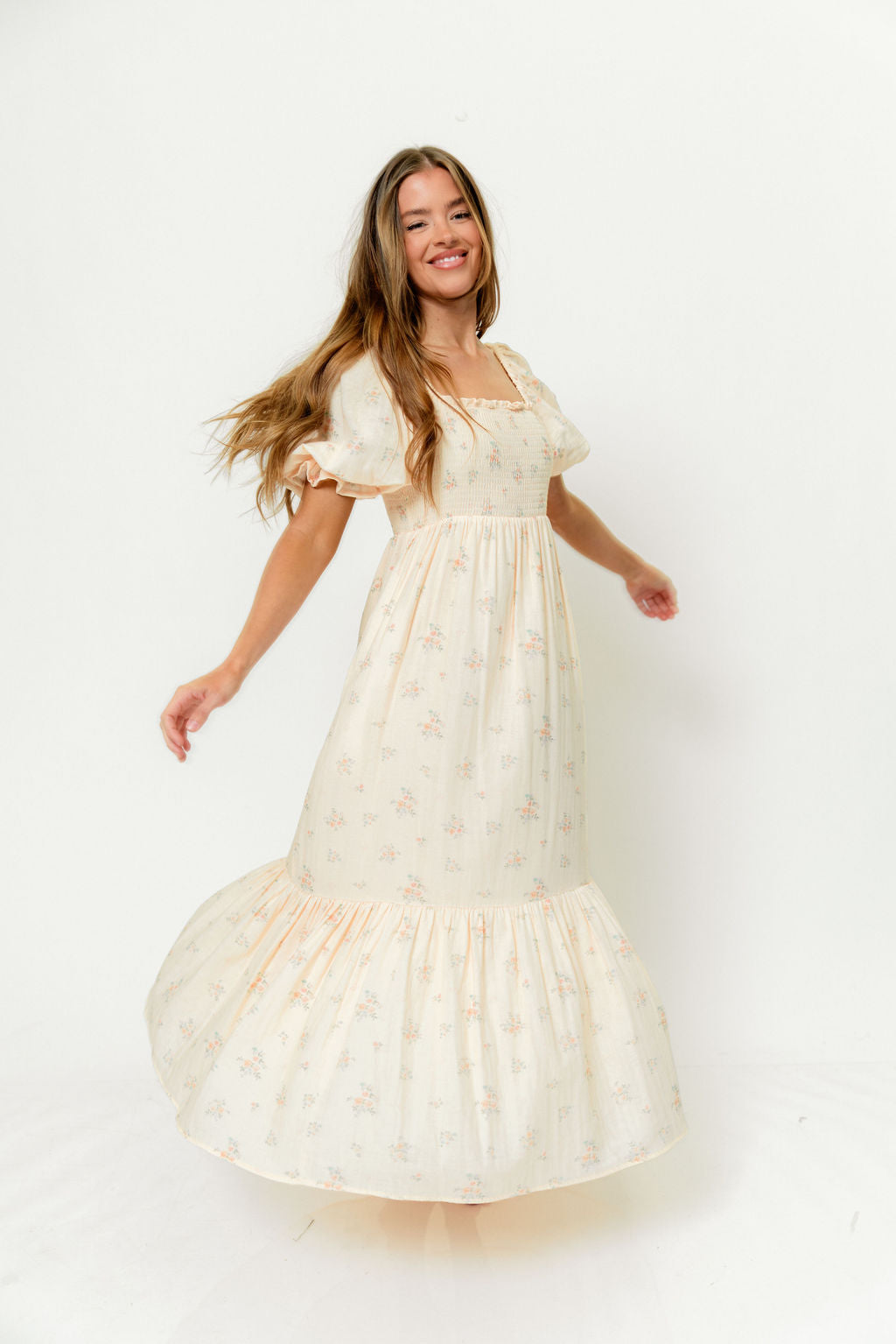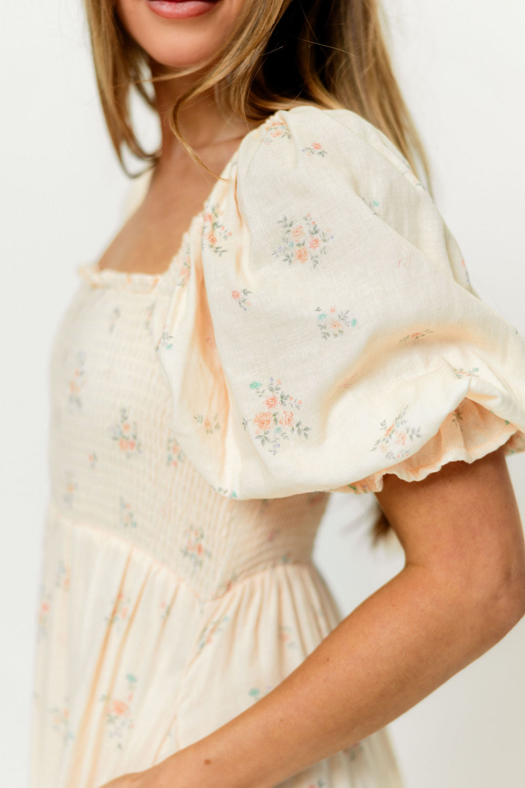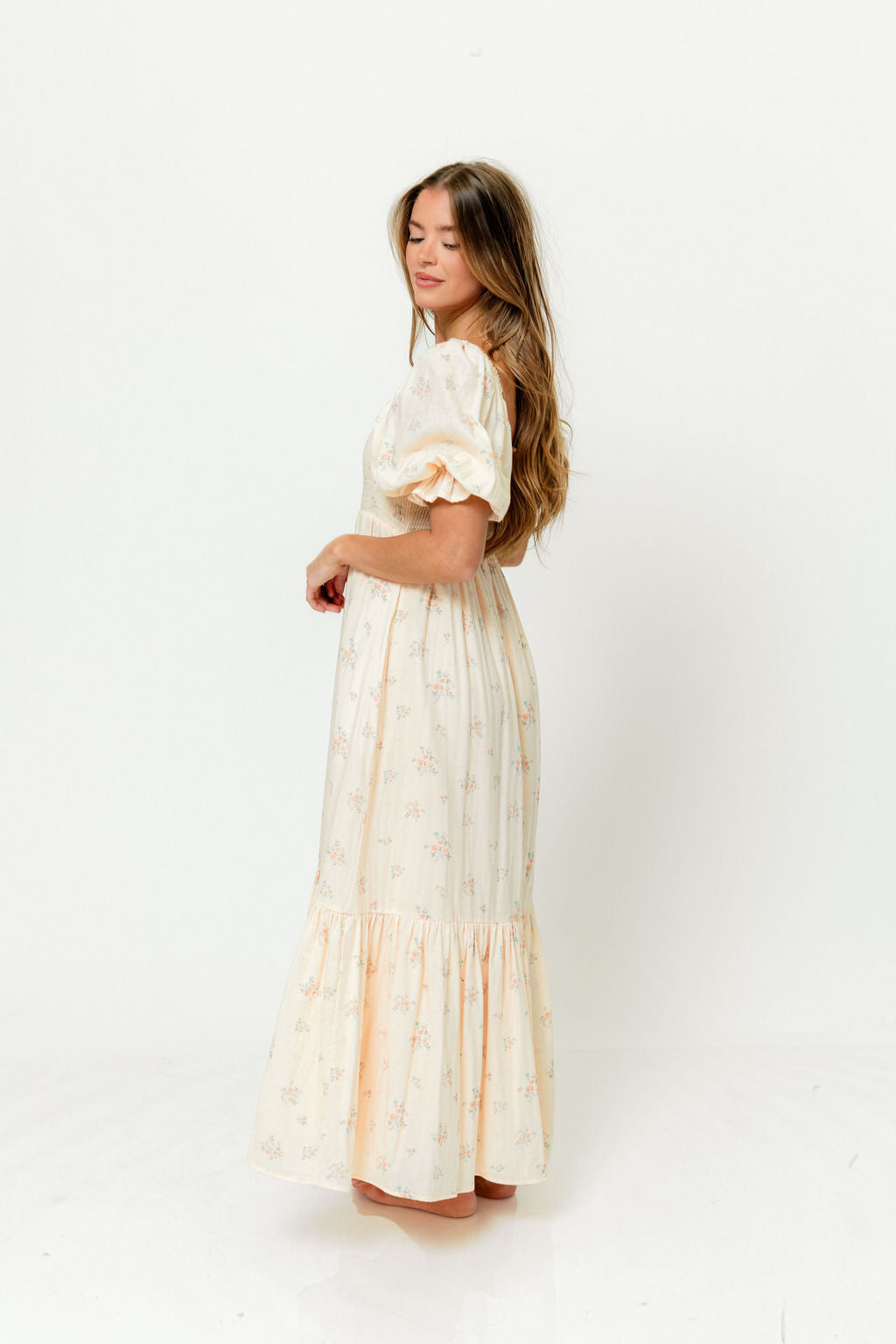 GARMENT DETAILS: Lightweight 100% cotton maxi dress with square neckline, short puff sleeves, and fully smocked, stretchy bodice. Features an elegant floral print and side pockets. Elasticated neckline can be worn on or off the shoulders. Lined.