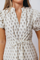 GARMENT DETAILS: Soft cotton midi dress with split neckline, adjustable cinched waist, and tiered, flowy skirt. Finished with puffed short sleeves and lining.