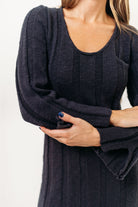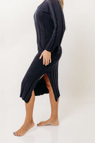 GARMENT DETAILS: Premium 100% cotton knit dress with scooped neckline, long sleeves with split cuffs, and a semi-fitted silhouette. Features a side slit in the skirt for comfort.