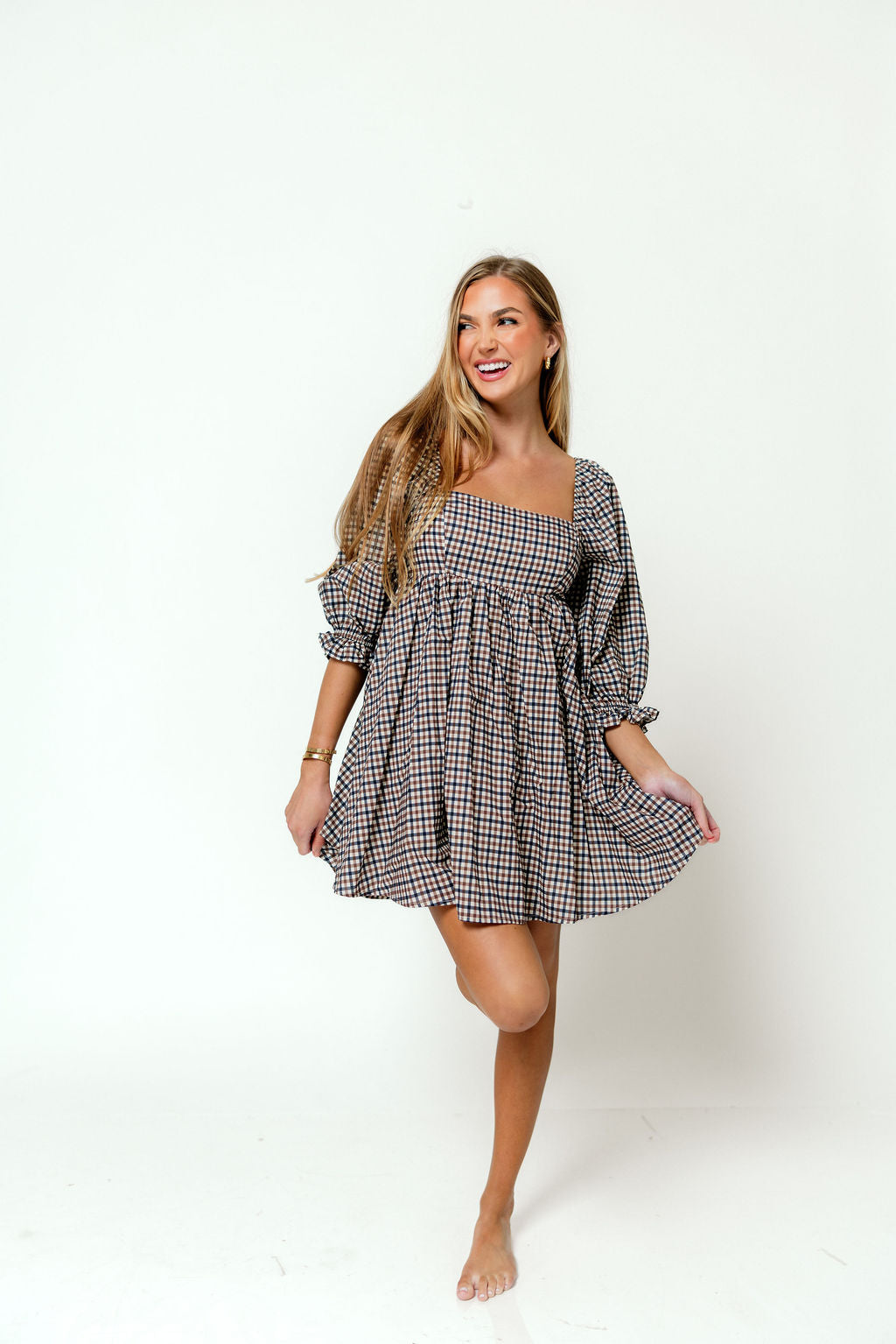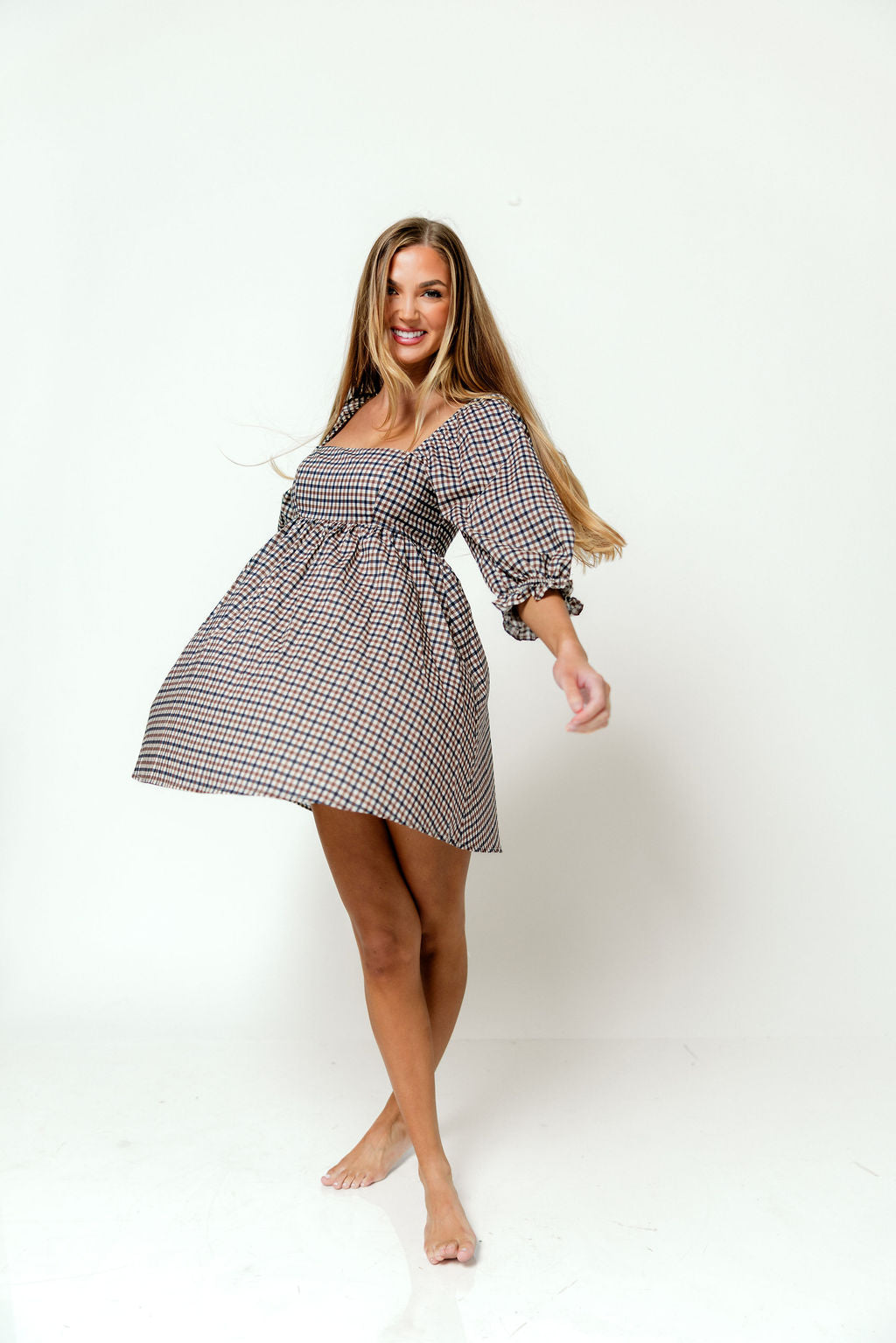 Turn heads when you're wearing the Bella Mini Dress this season! With its warm navy and brown gingham print and flirty empire waist, this darling little dress is lightweight and easy to style with boots, mules, sneakers, and more!
