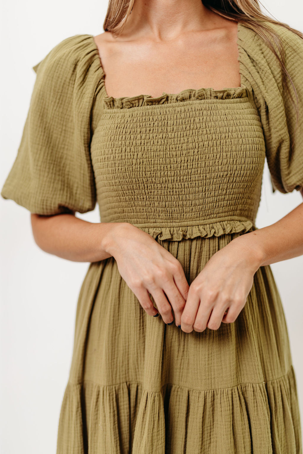 GARMENT DETAILS: Elegant midi dress with a square neckline, statement puffed sleeves, and bow accents on the shoulders. Features a fully smocked bodice, with a multi-tiered skirt.
