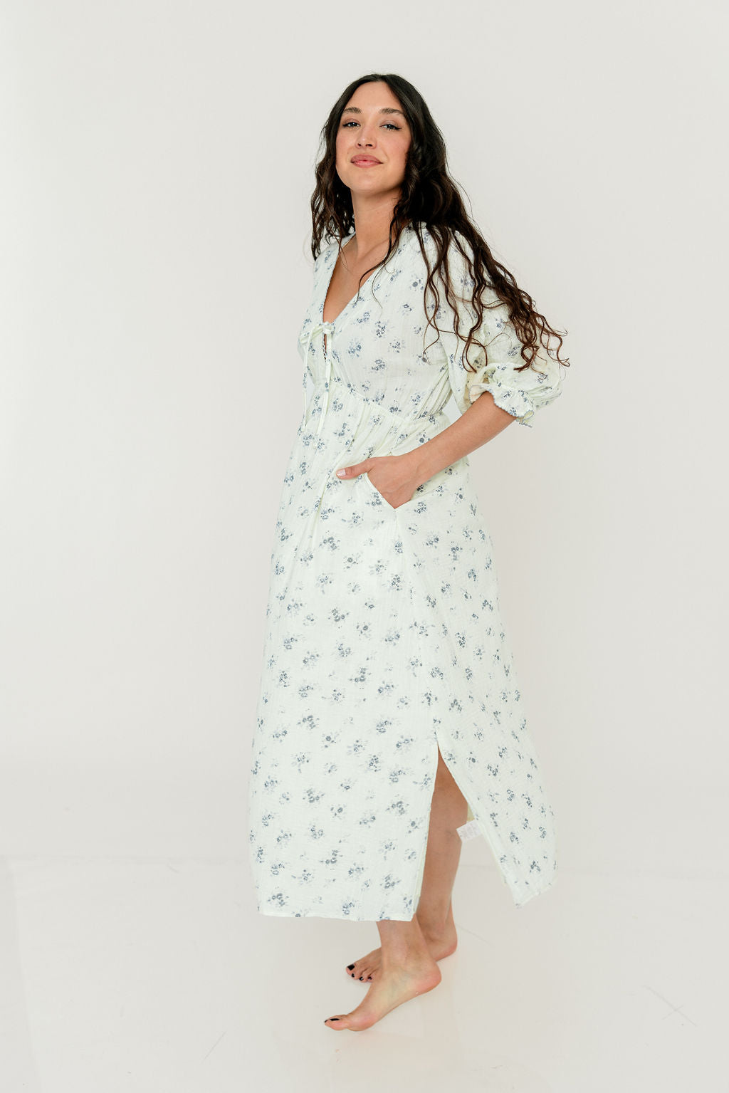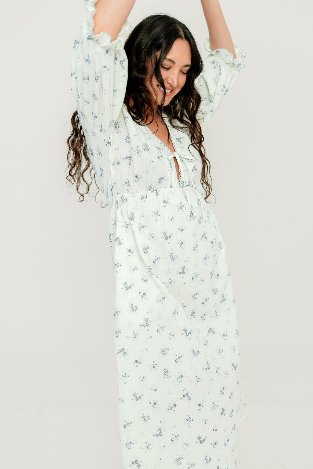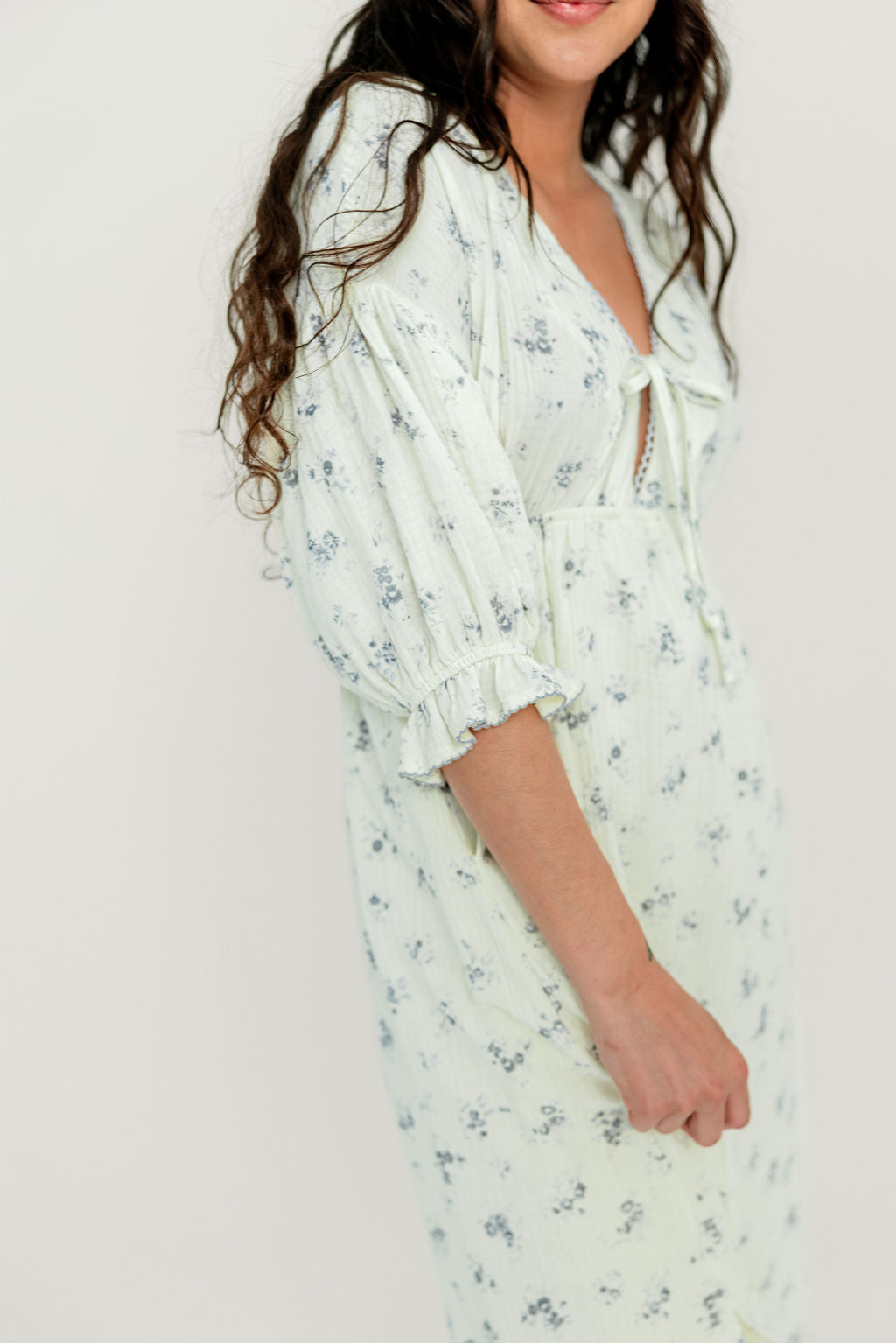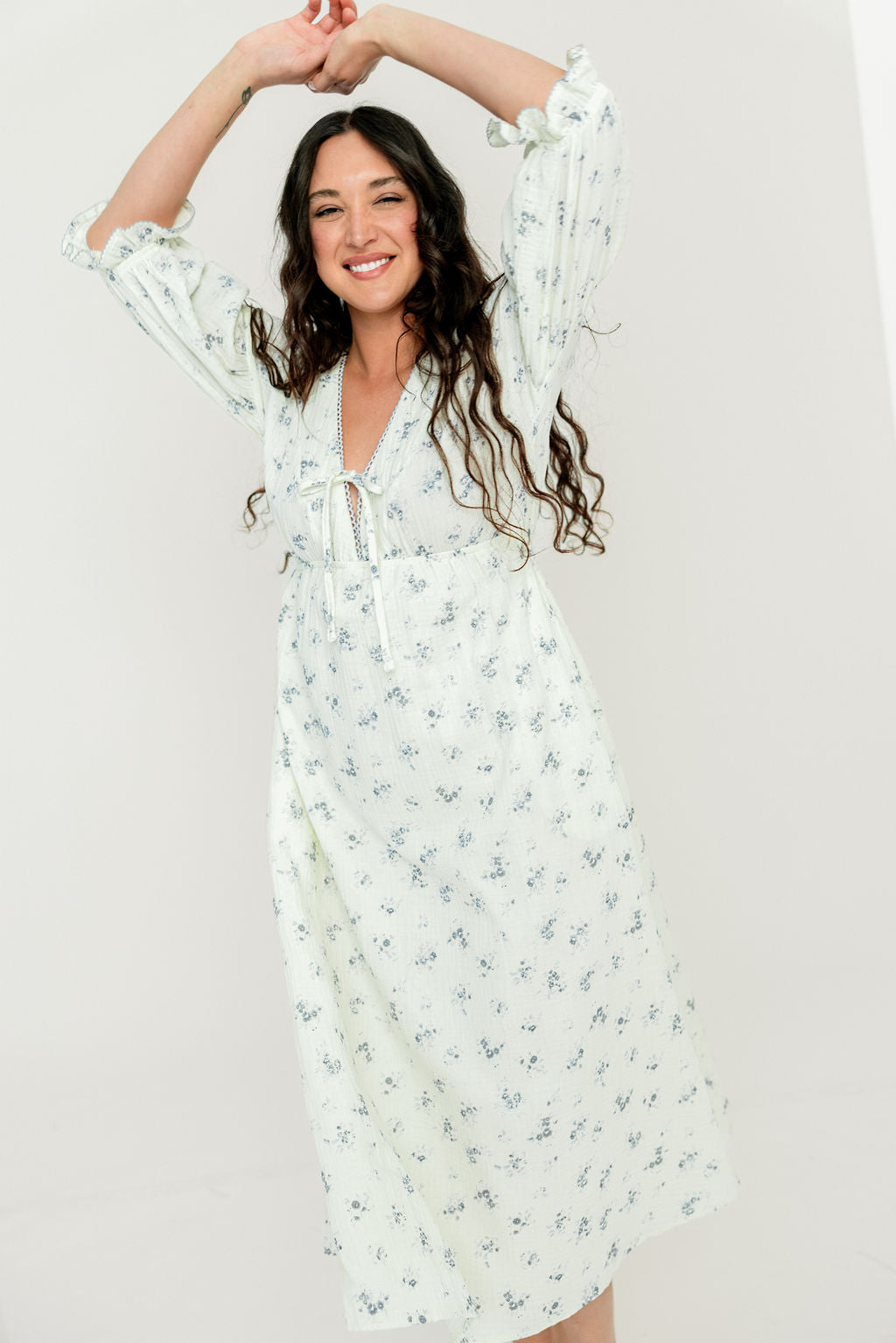 GARMENT DETAILS: Lightweight cotton gauze midi dress. Features V-neckline with self-tie detail, inverted empire waist, and full skirt with in-seam pockets. Finished with long balloon sleeves and contrast color eyelet trim.