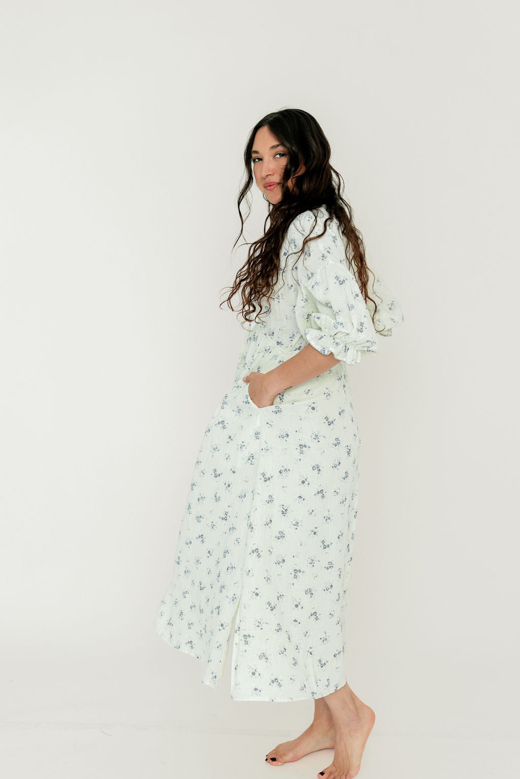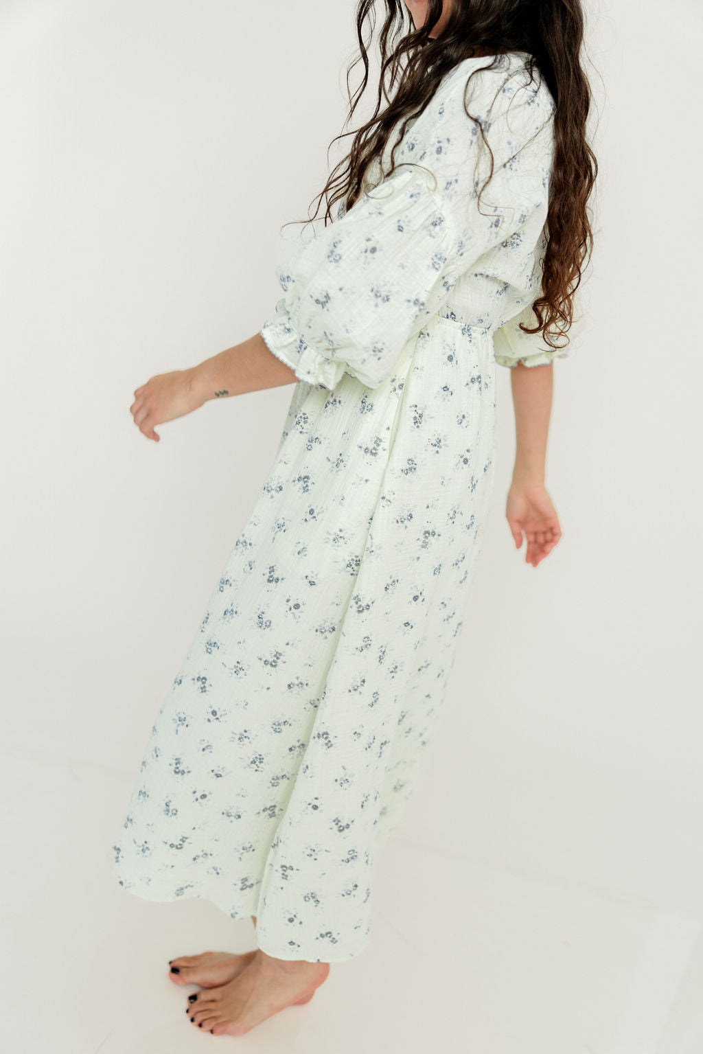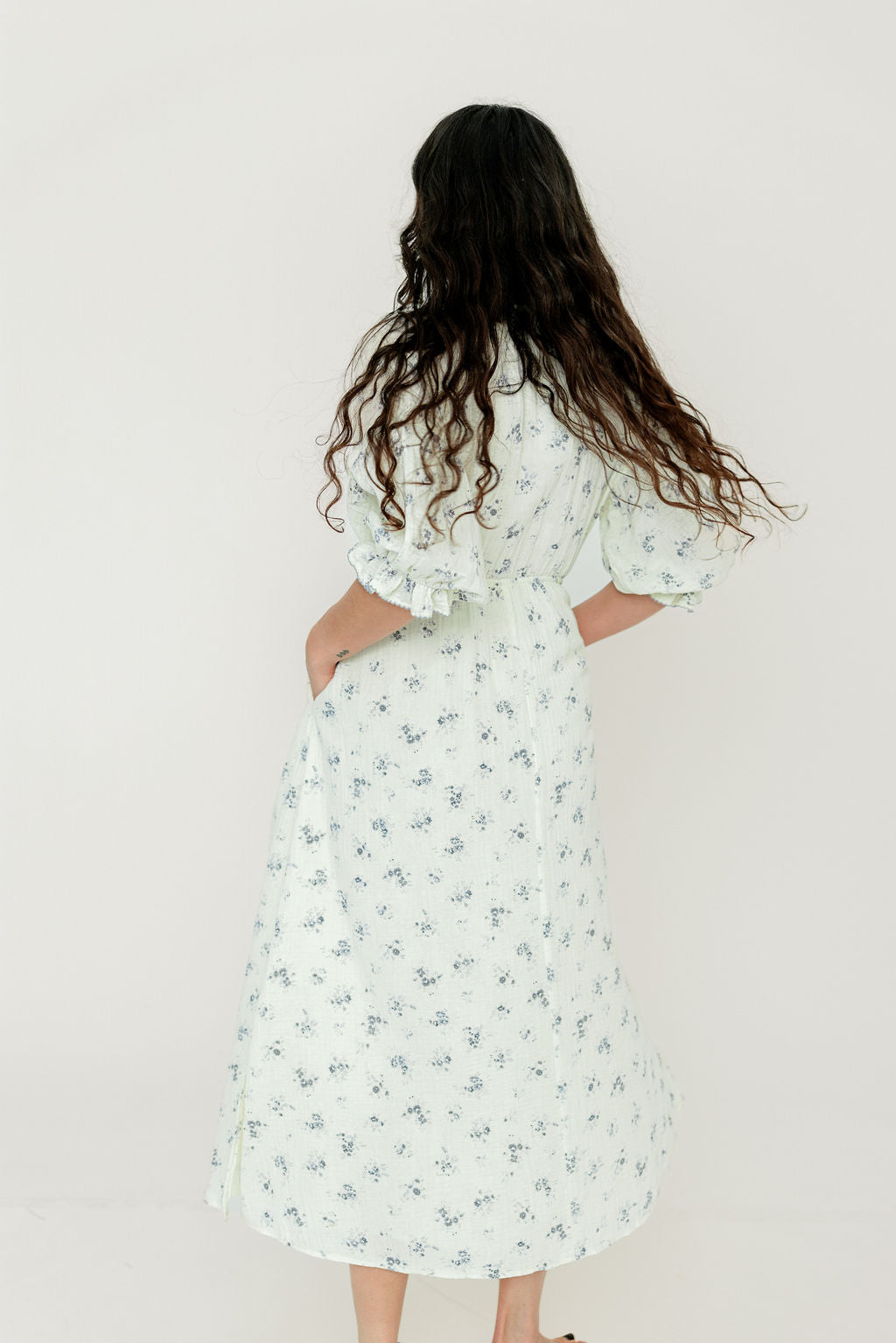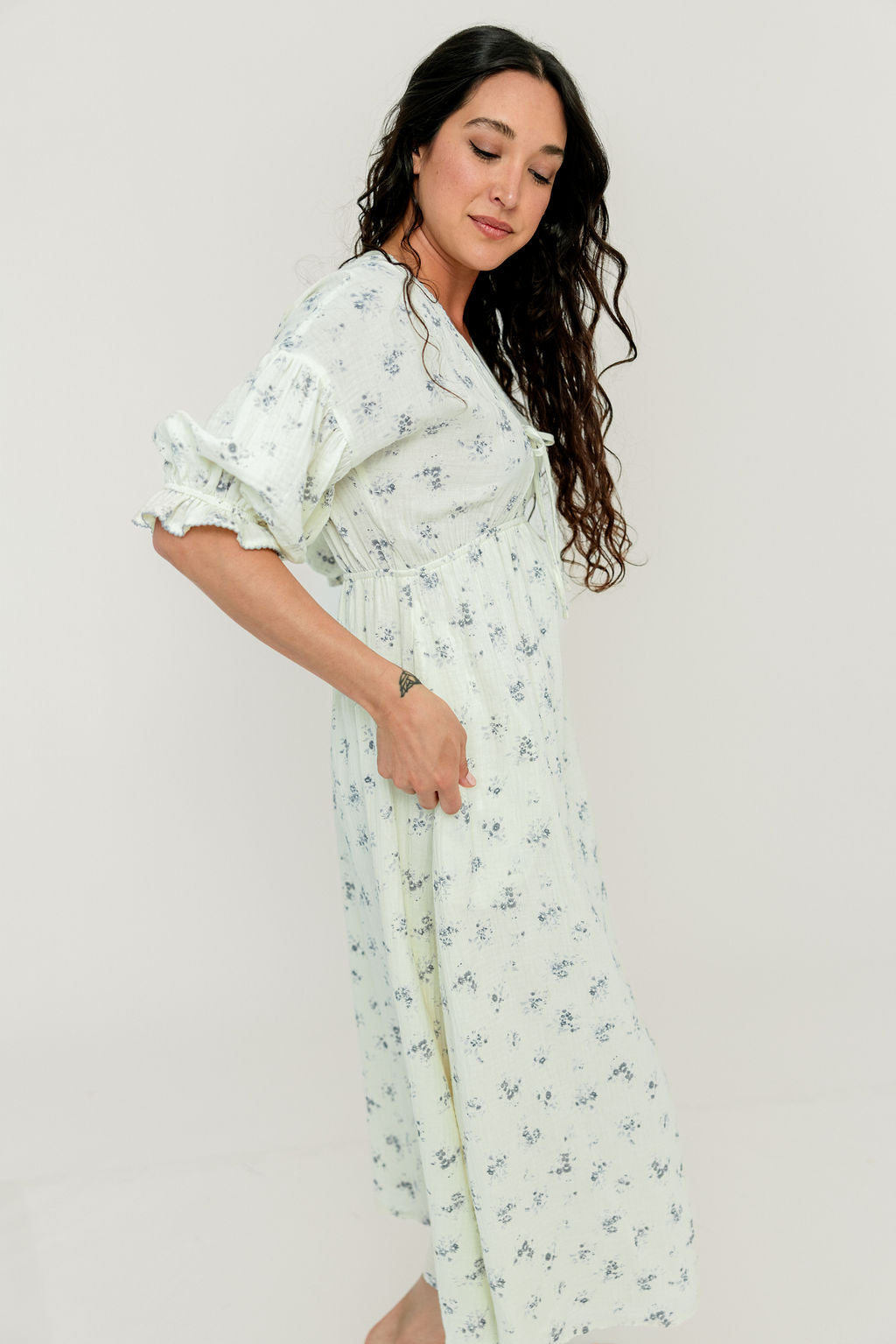 GARMENT DETAILS: Lightweight cotton gauze midi dress. Features V-neckline with self-tie detail, inverted empire waist, and full skirt with in-seam pockets. Finished with long balloon sleeves and contrast color eyelet trim.