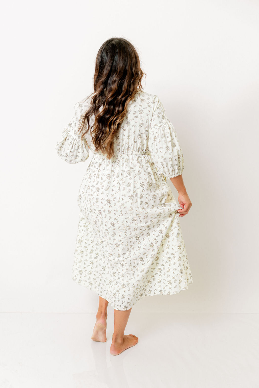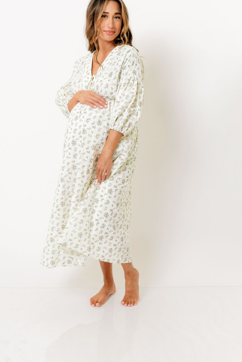 GARMENT DETAILS: Lightweight cotton maxi dress. Features V-neckline with self-tie detail, inverted empire waist, and full skirt with in-seam pockets. Finished with long balloon sleeves.