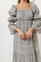 GARMENT DETAILS: Premium cotton midi dress in a vintage-inspired floral print. Features a square neckline with elasticized shirring around the bust, with voluminous gathered long sleeves and a tiered skirt.