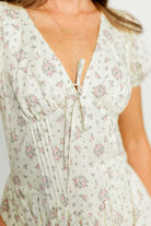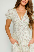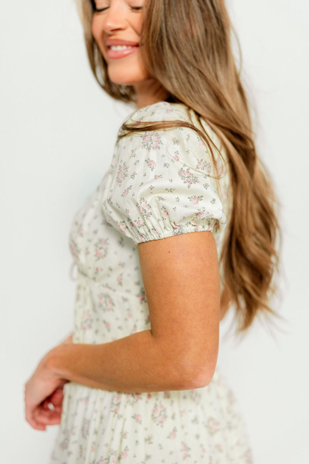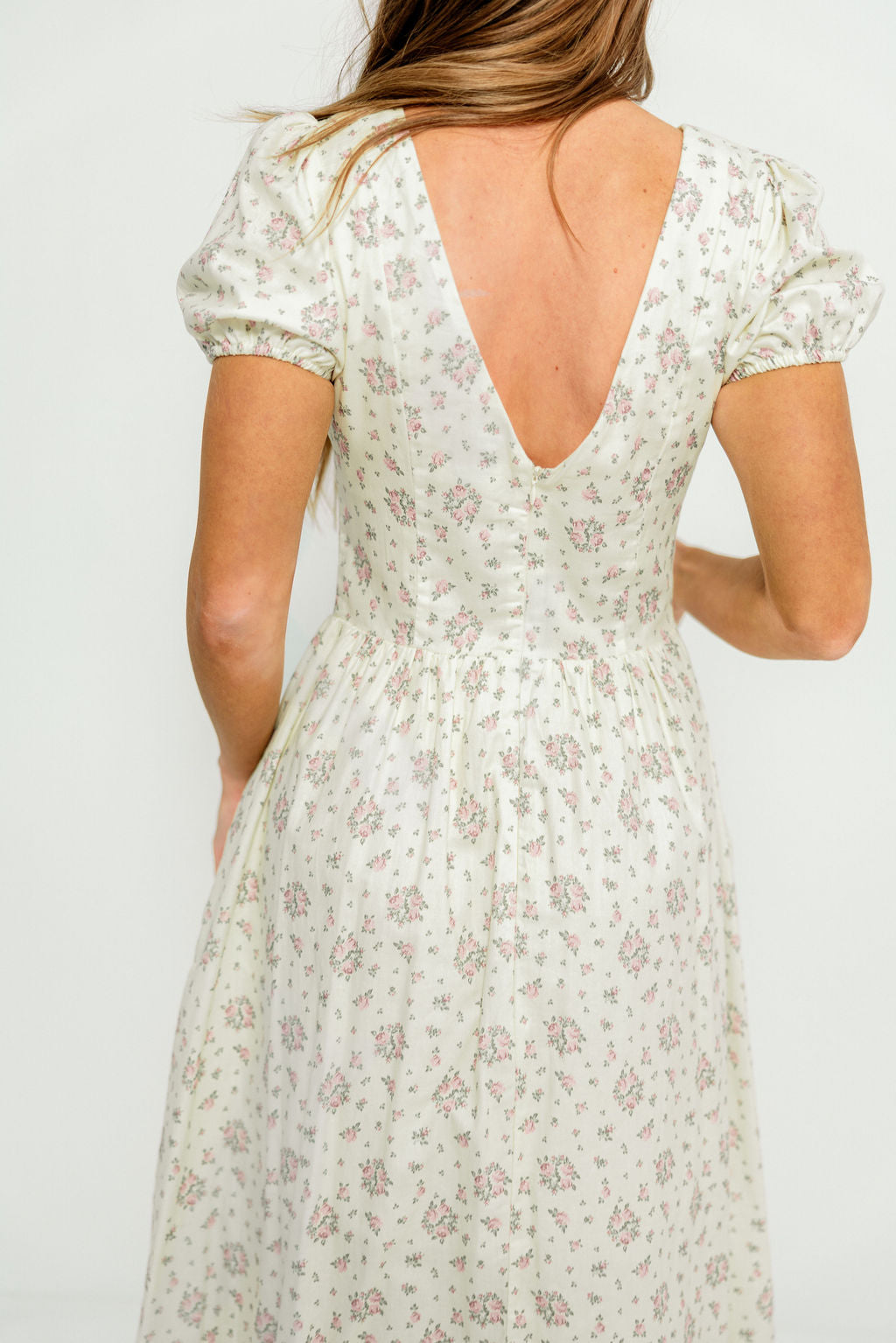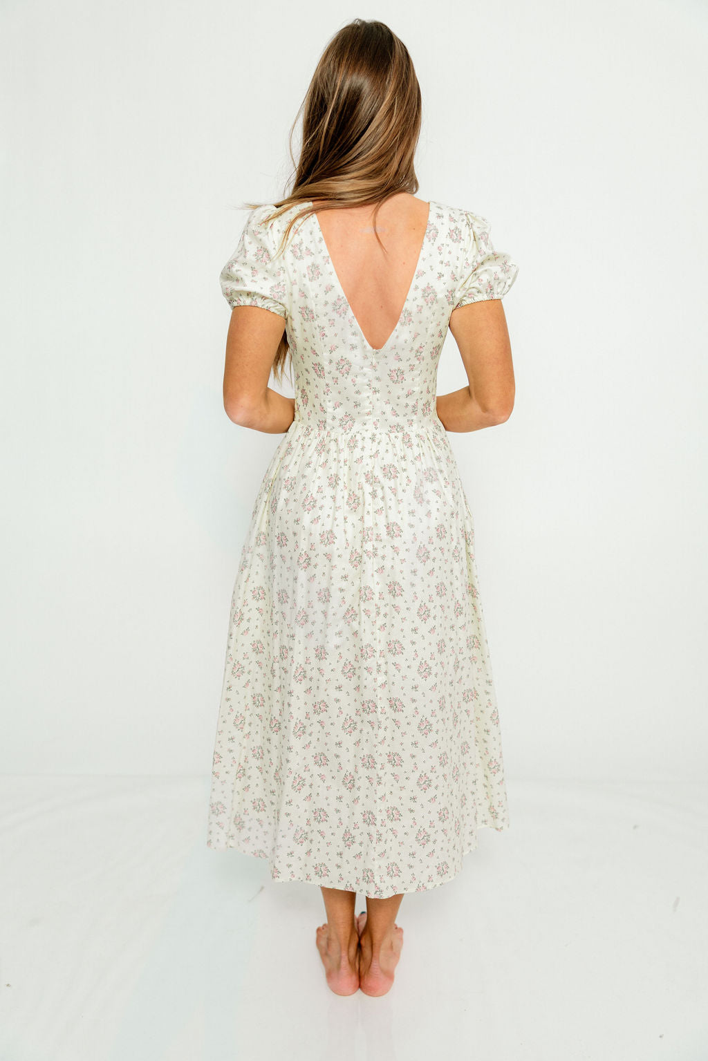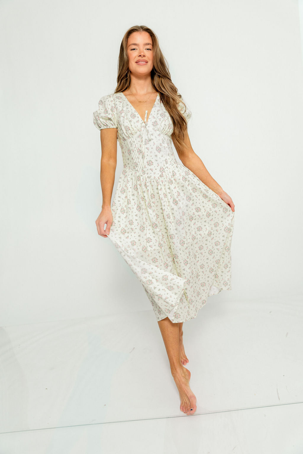 GARMENT DETAILS: Soft floral print midi dress with deep V-neckline, short puffed sleeves with elastic, and fitted bodice with vintage-style pintuck pleats. Features a flared midi skirt, with matching deep V-back. Finished with adjustable bow detail on the bodice, with invisible back zipper and full lining.