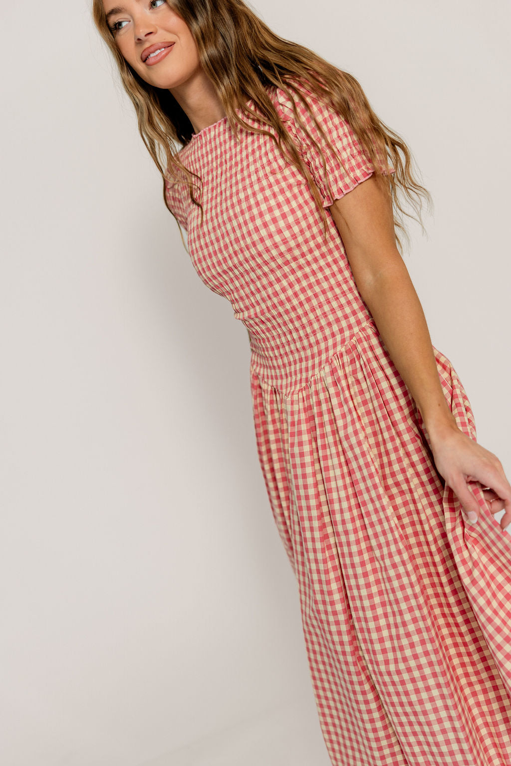 Soft, romantic, and timeless, the Bianca Gingham Midi Dress is an elegant nod to vintage femininity! This gorgeous gown features a smocked bodice and gingham print, with a softly pleated midi skirt and scalloped lace hem for a sweet finishing touch. Add this to cart just in time for your spring events!