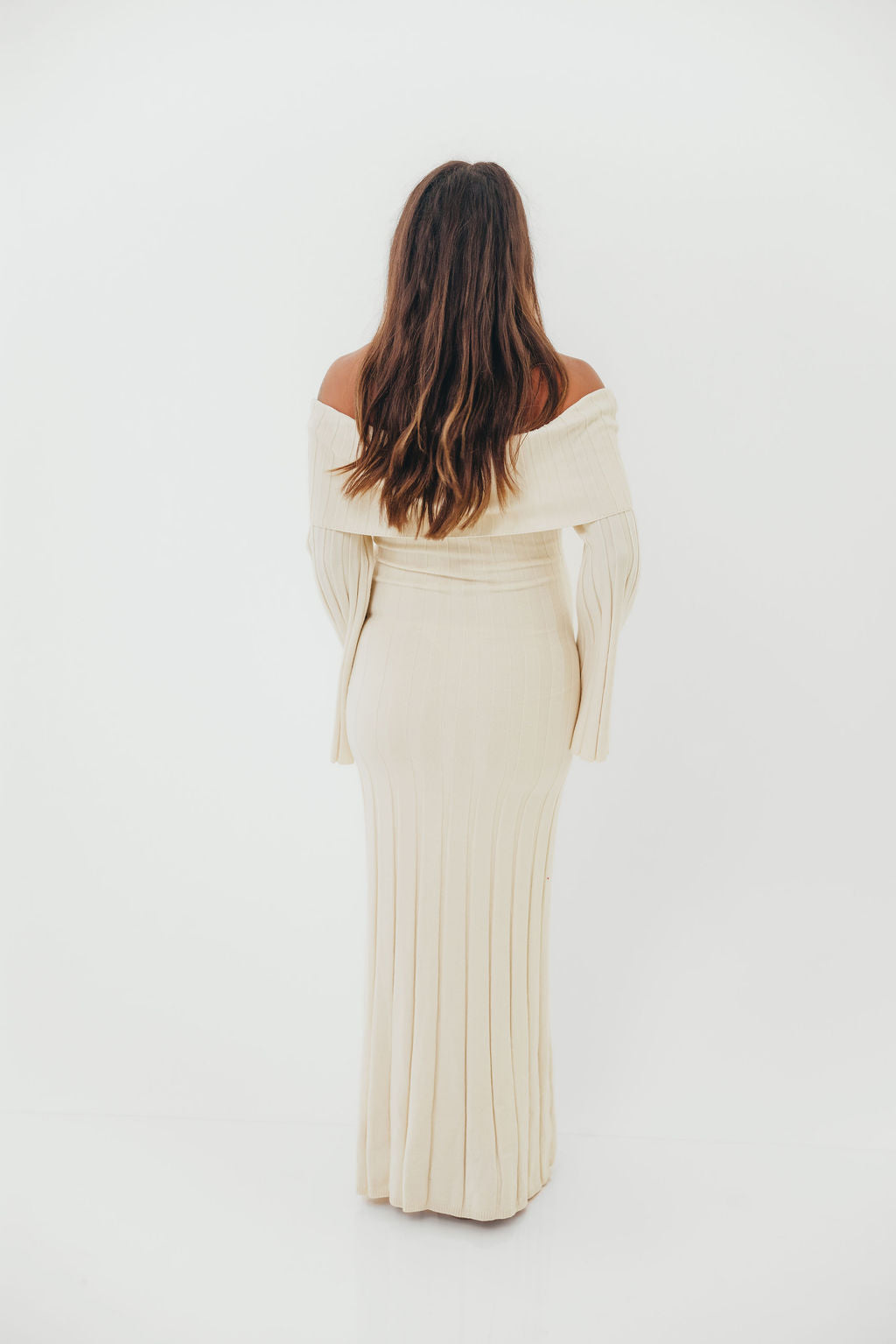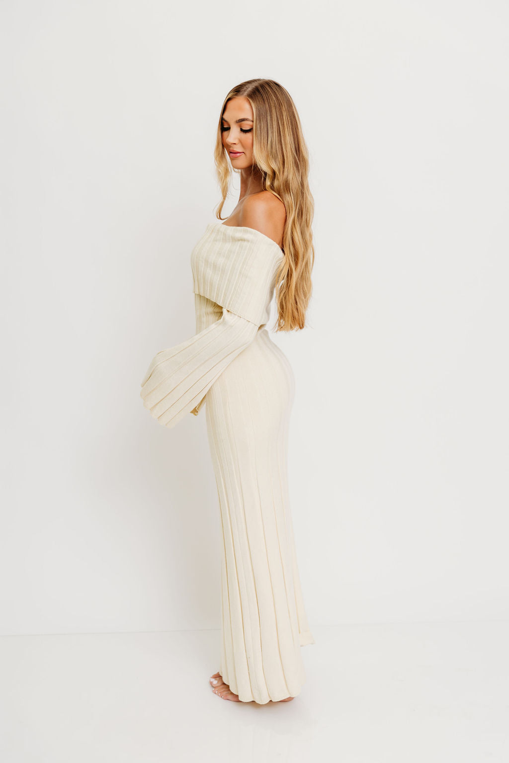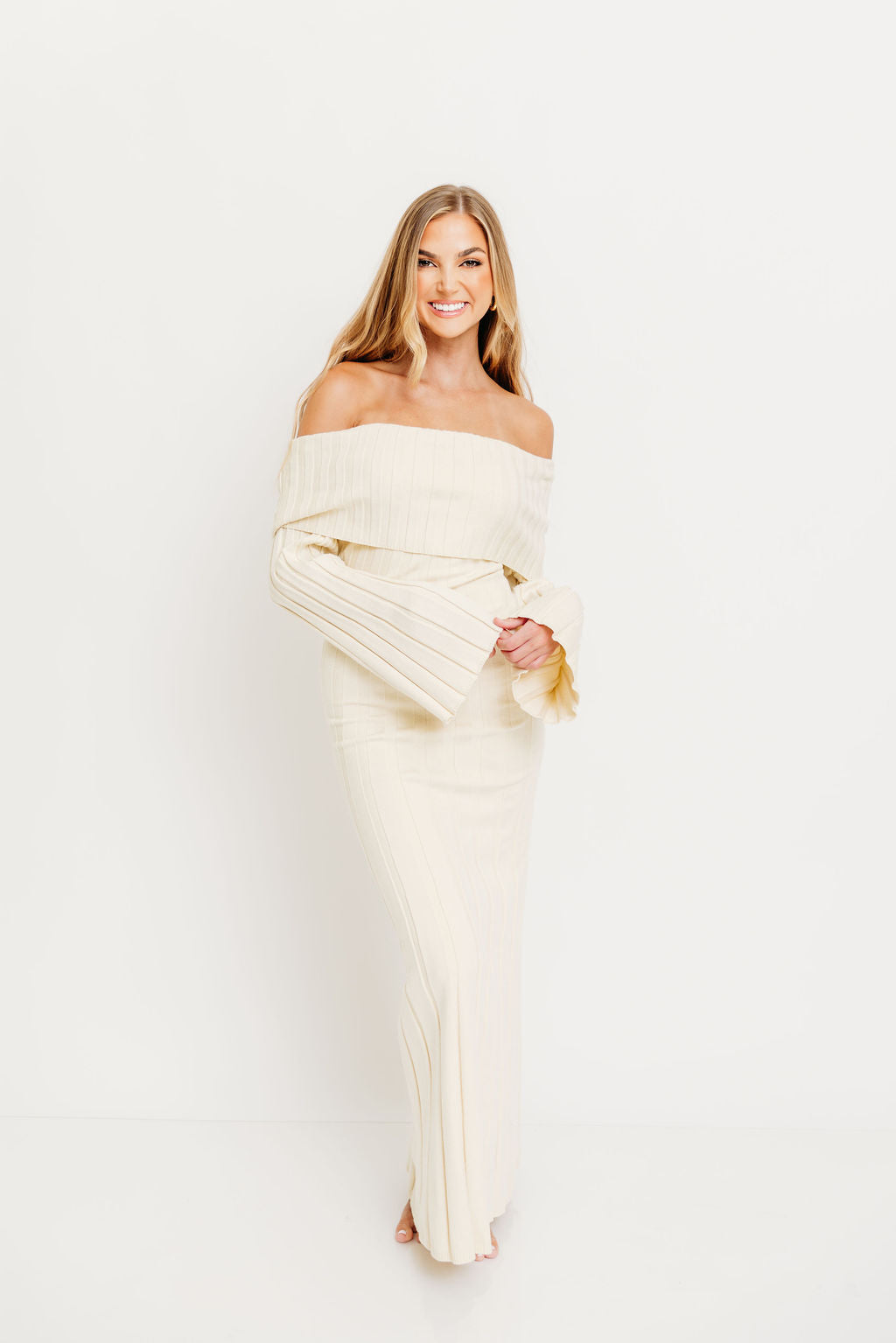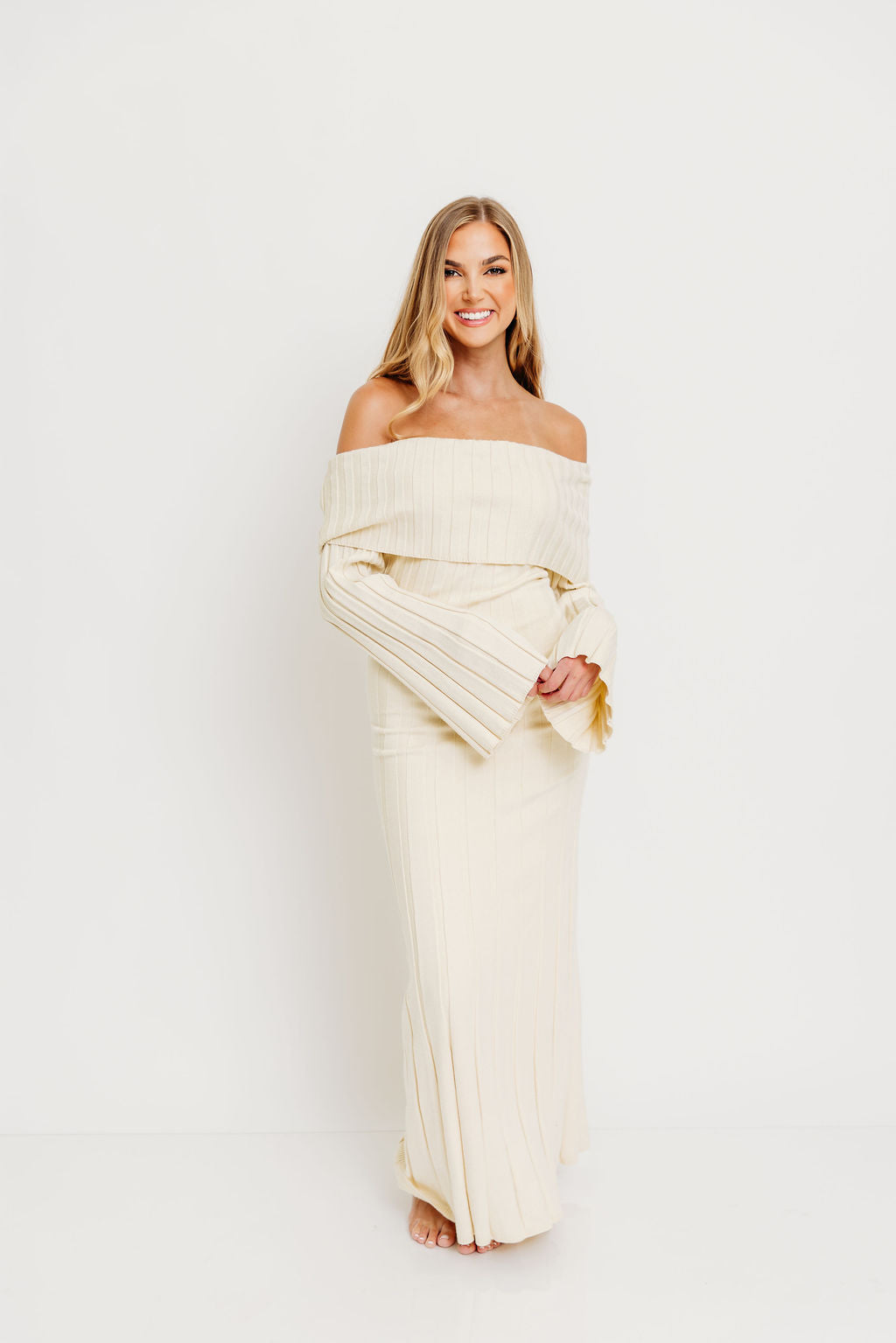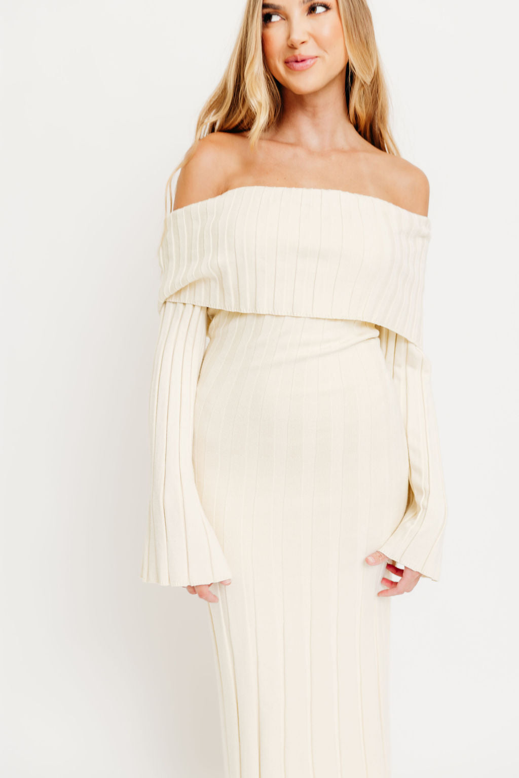 GARMENT DETAILS: Feminine, ribbed knit maxi dress with folded off-the-shoulder neckline, long bell sleeves, and elegant flared skirt. Features a flattering fit, with a very stretchy, fitted silhouette.