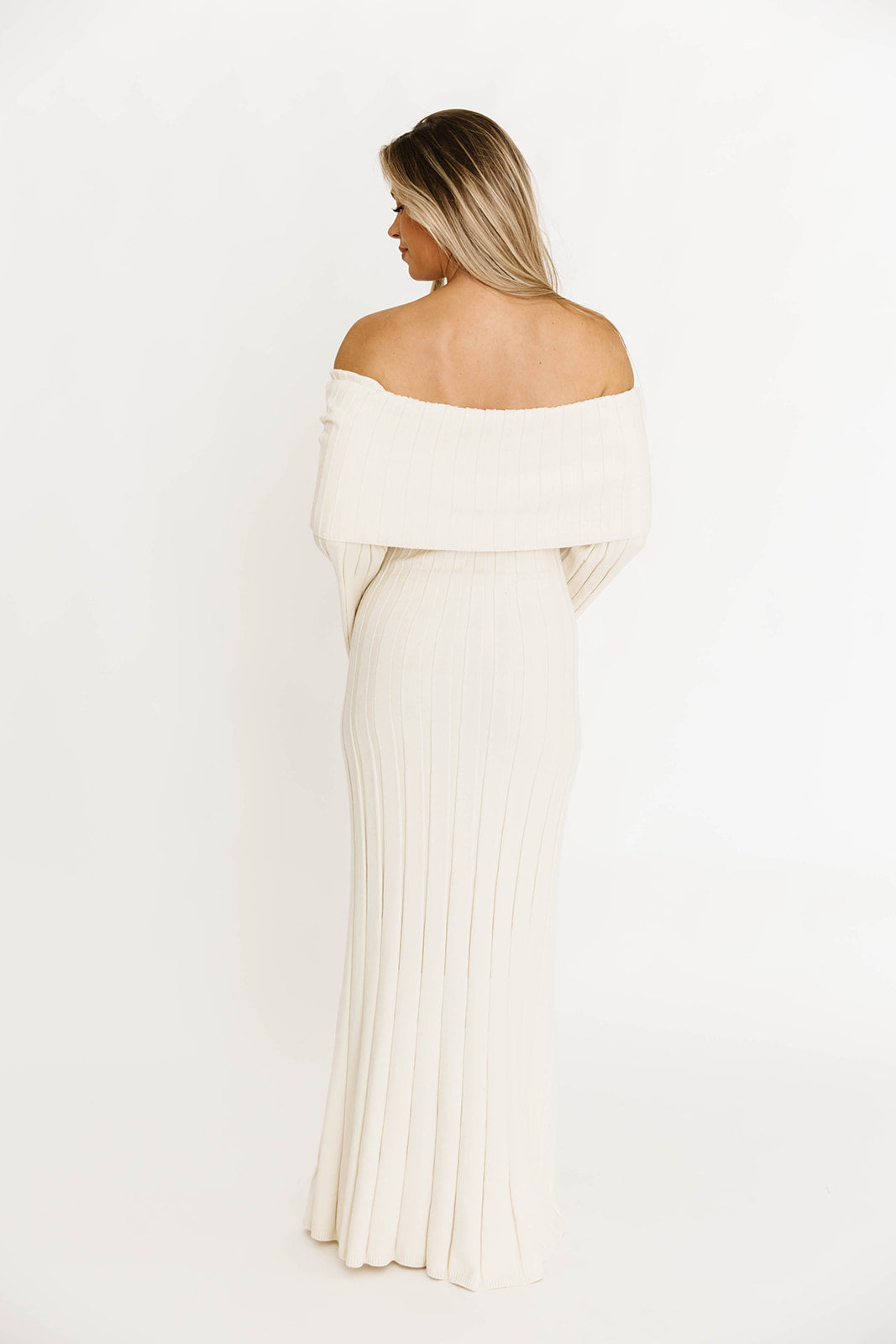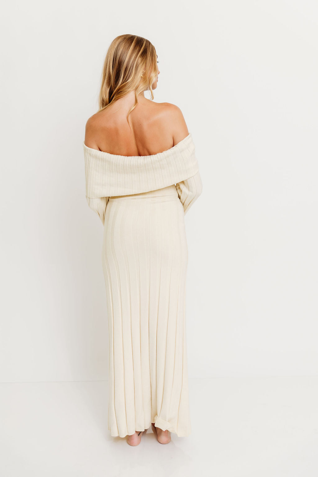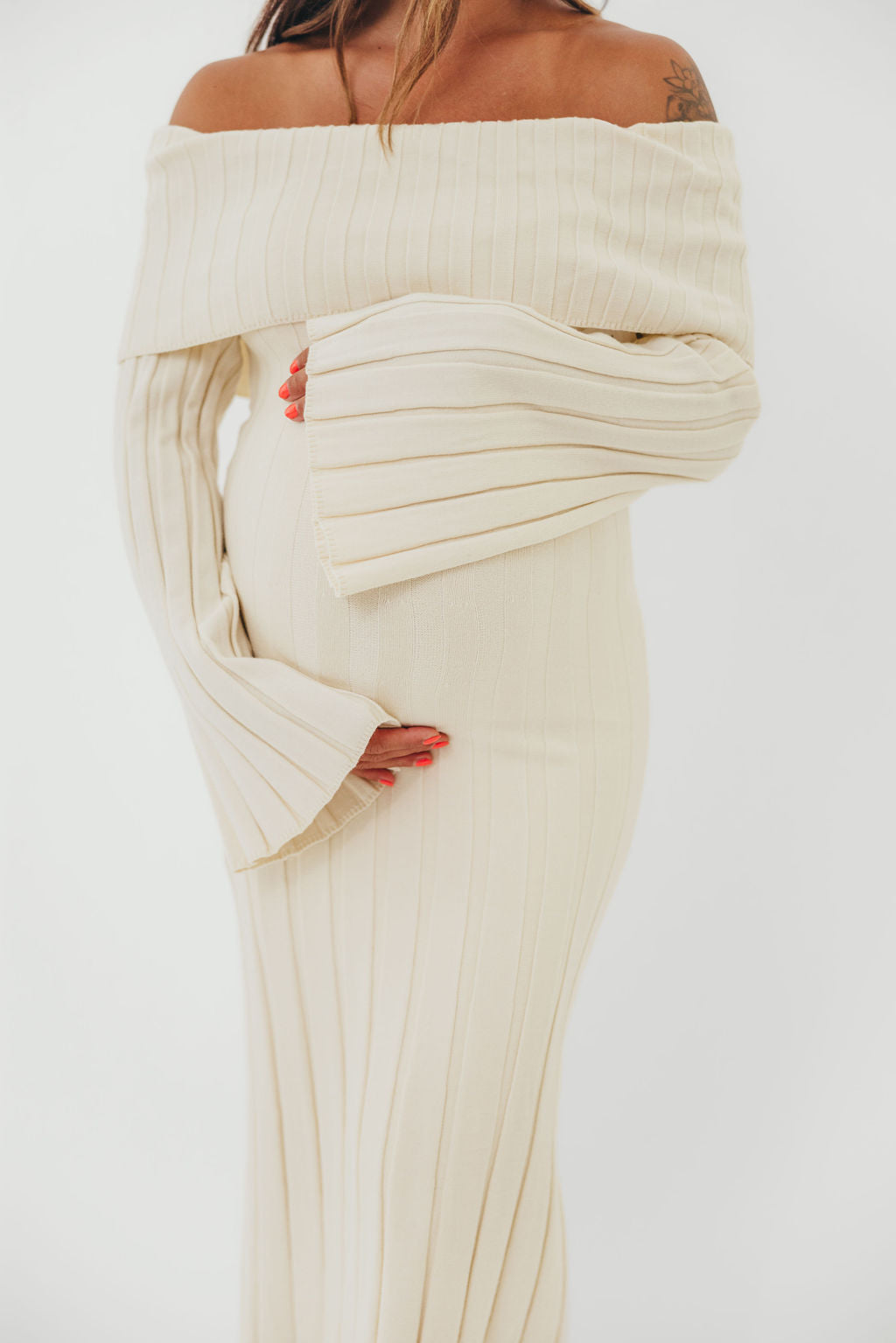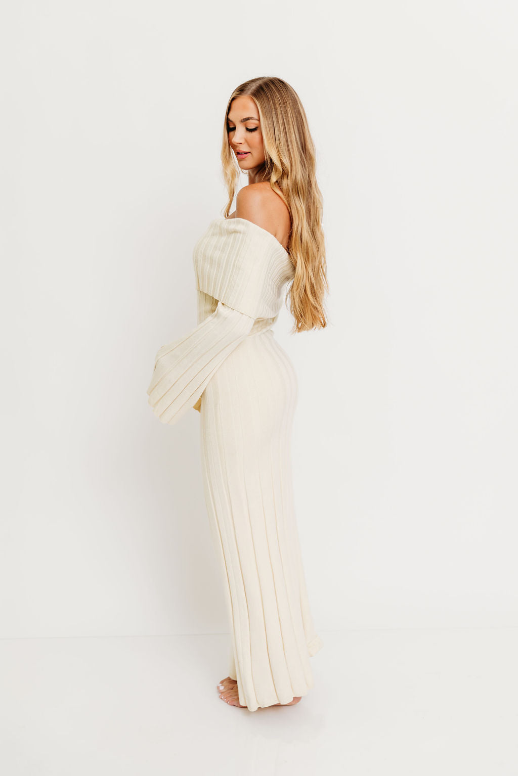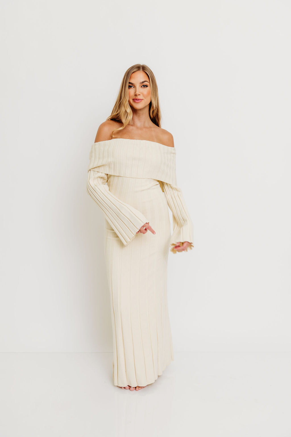 GARMENT DETAILS: Feminine, ribbed knit maxi dress with folded off-the-shoulder neckline, long bell sleeves, and elegant flared skirt. Features a flattering fit, with a very stretchy, fitted silhouette.