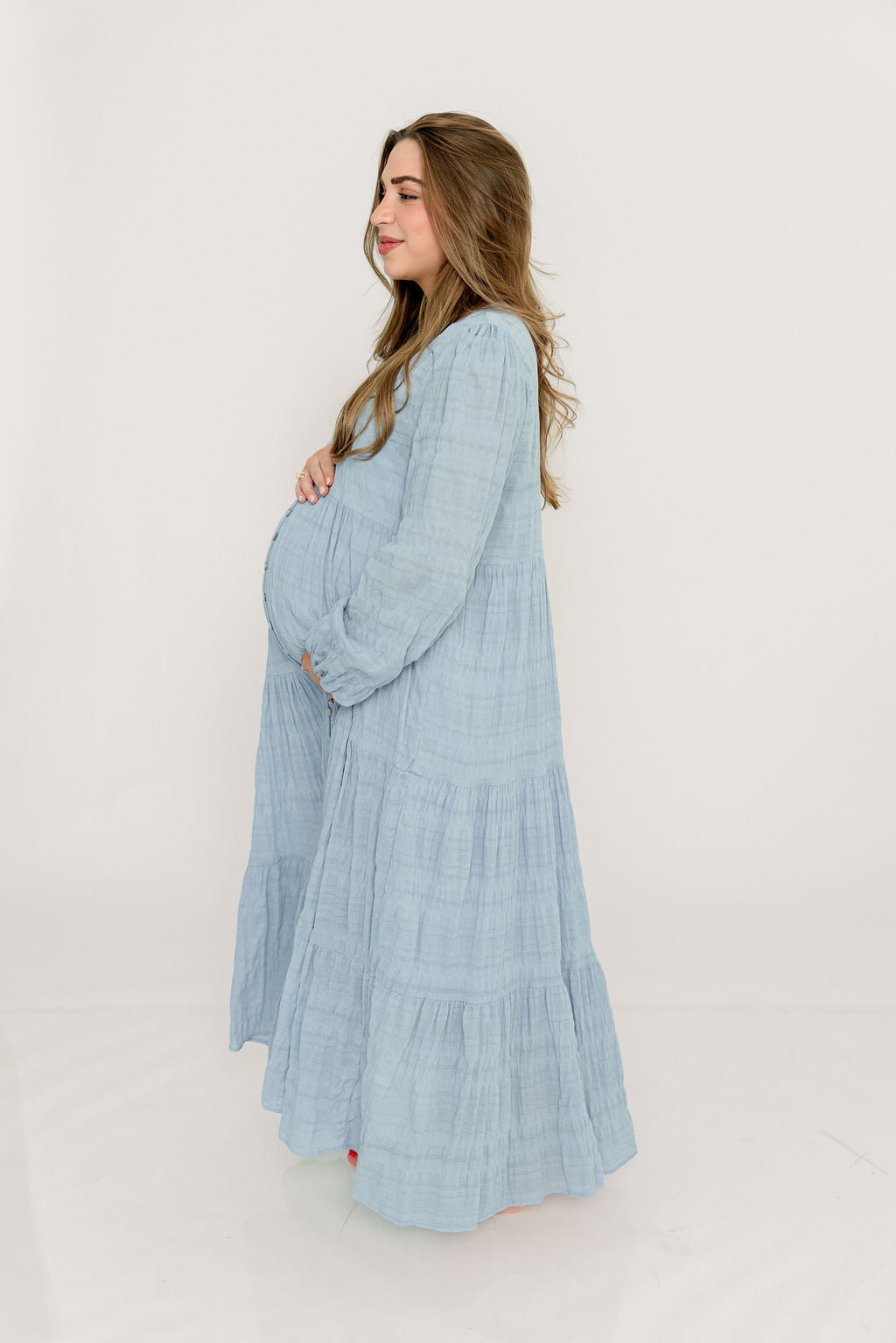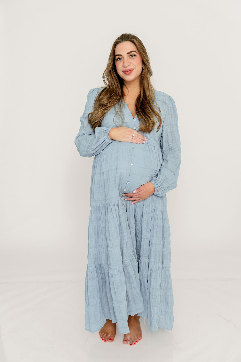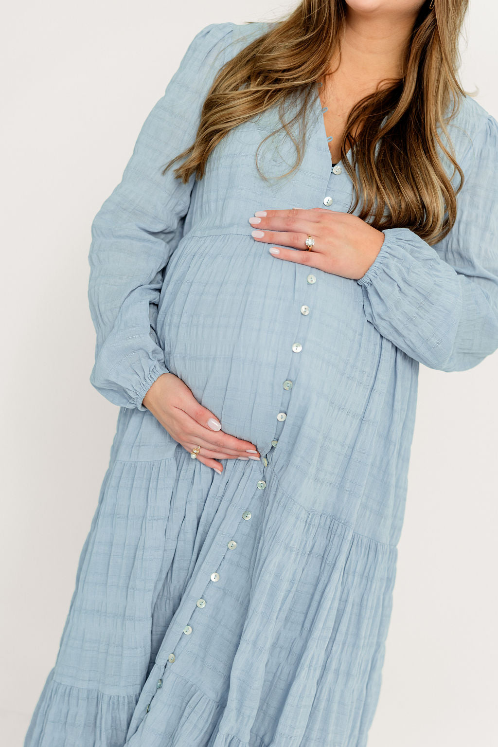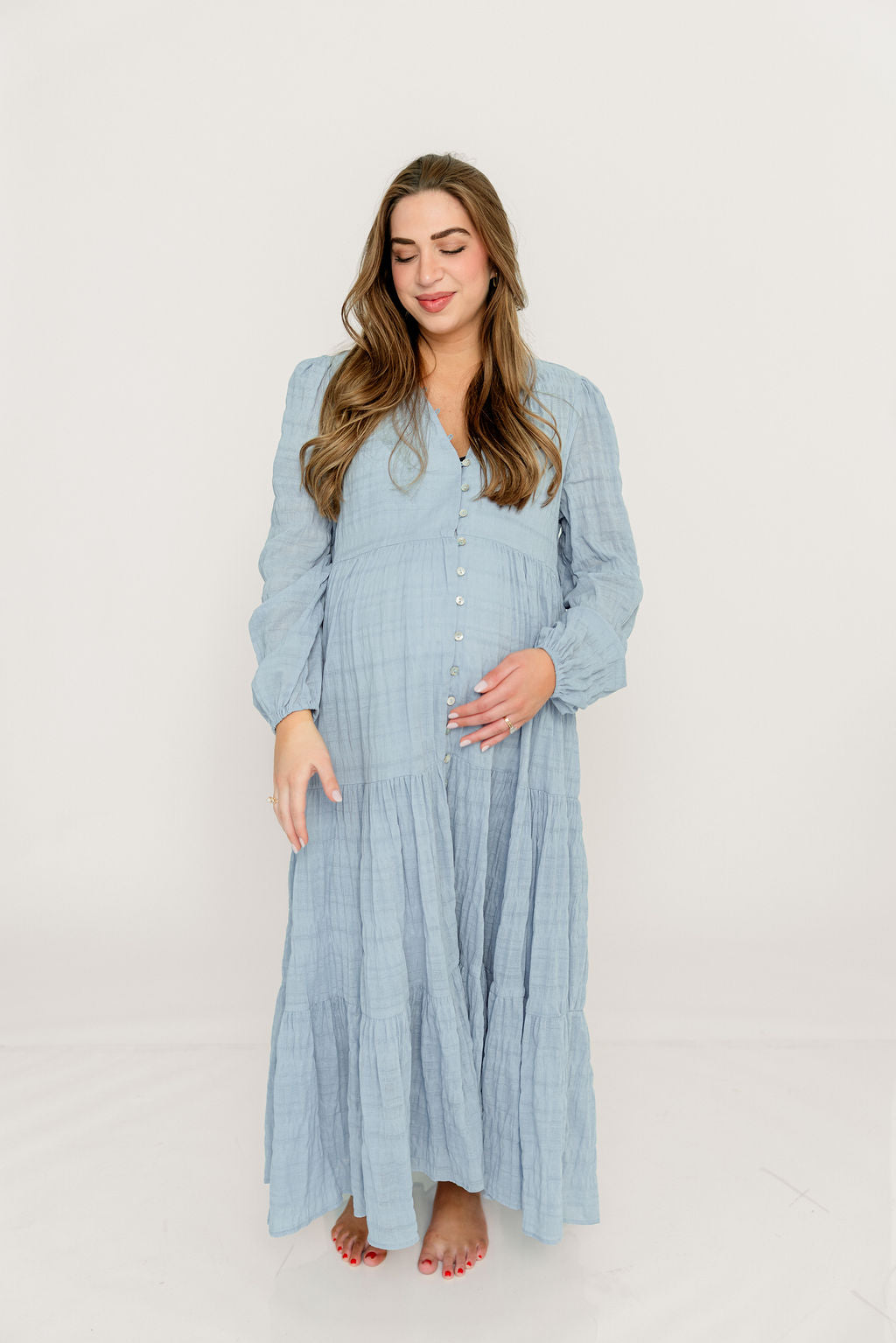 The Anna Maxi Dress is effortlessly elegant, designed to keep you easy breezy from pre-pregnancy to postpartum. With its soft cotton-blend fabric and thoughtful button front design, this breathable dress offers flexibility and comfort; it's a perfect choice for those seeking timeless style without compromise or fuss!