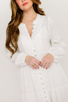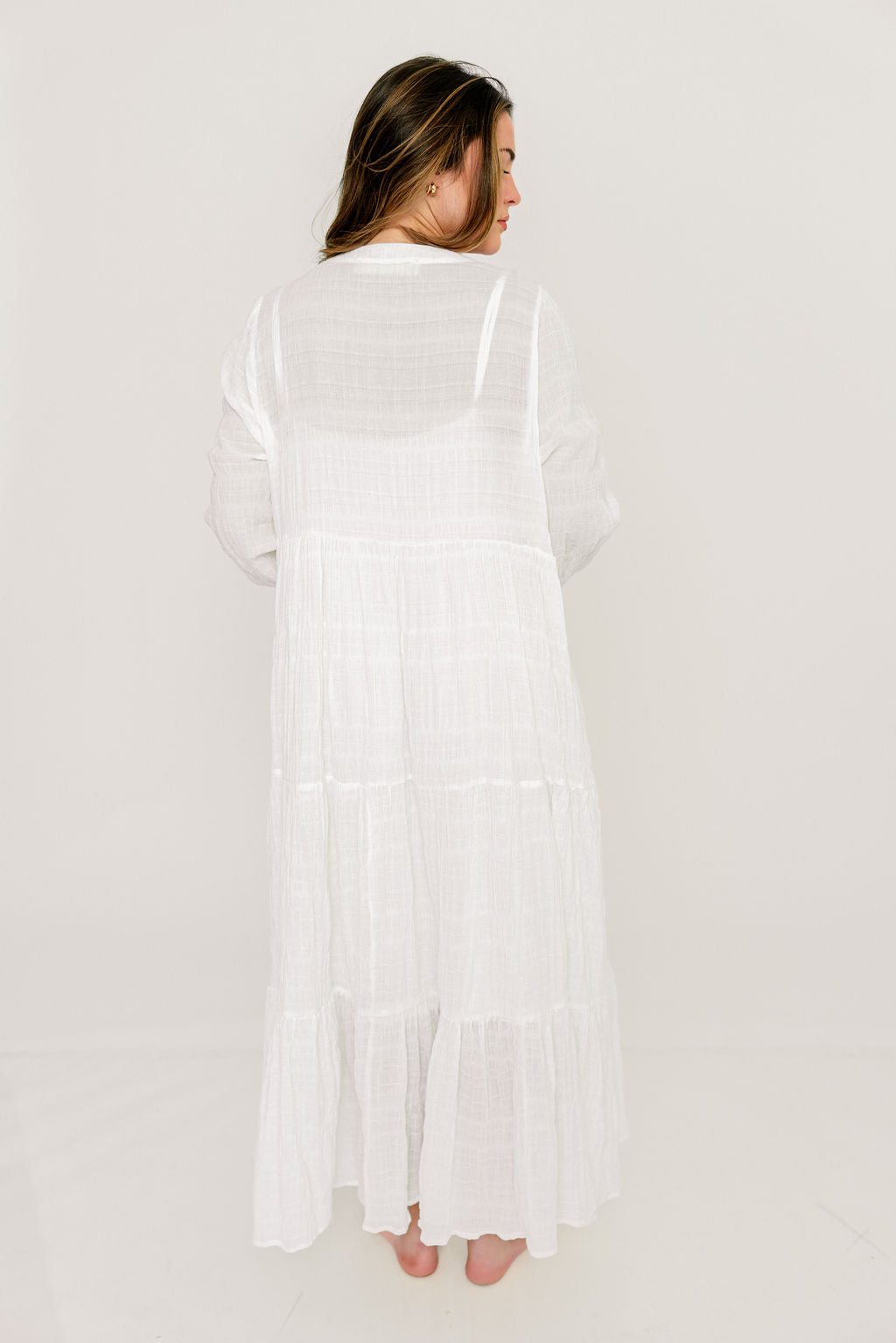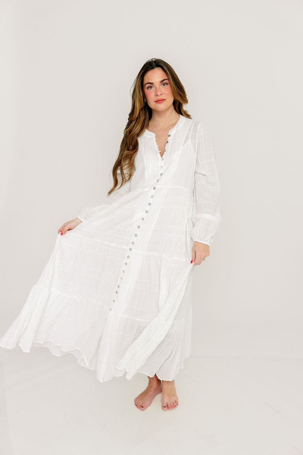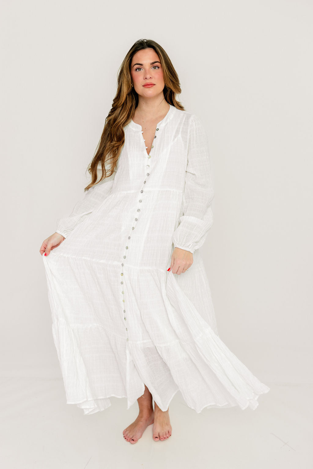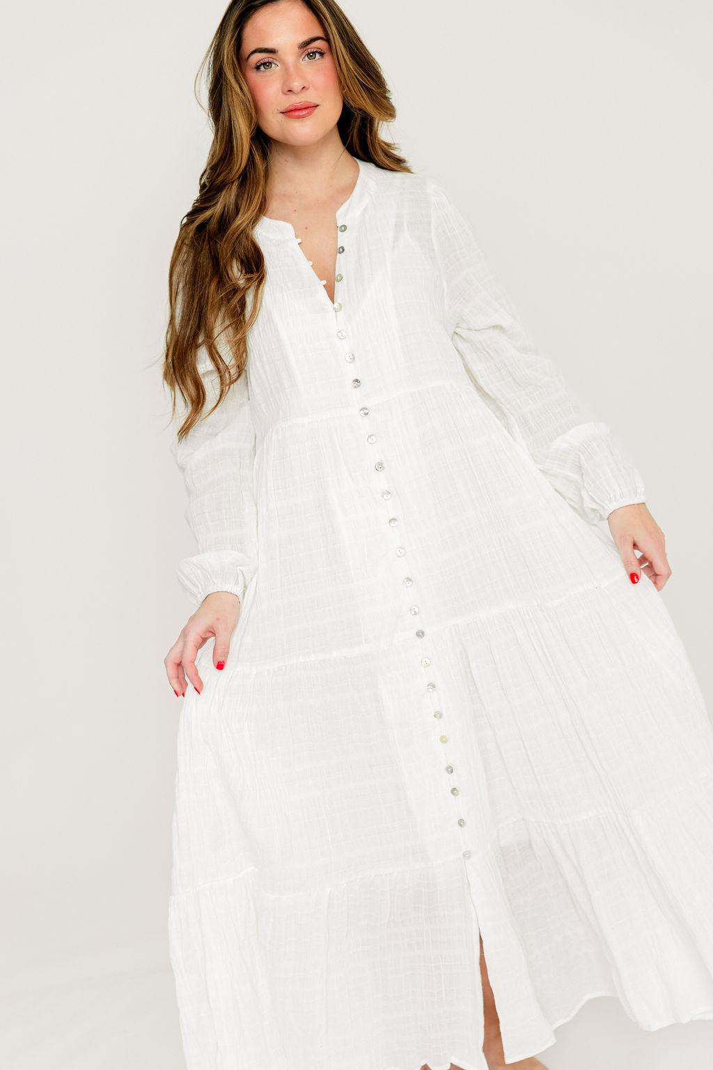 GARMENT DETAILS: Elegant cotton-blend maxi dress with full front button placket, long sleeves with elasticated cuffs, and gently tiered skirt. Lined.