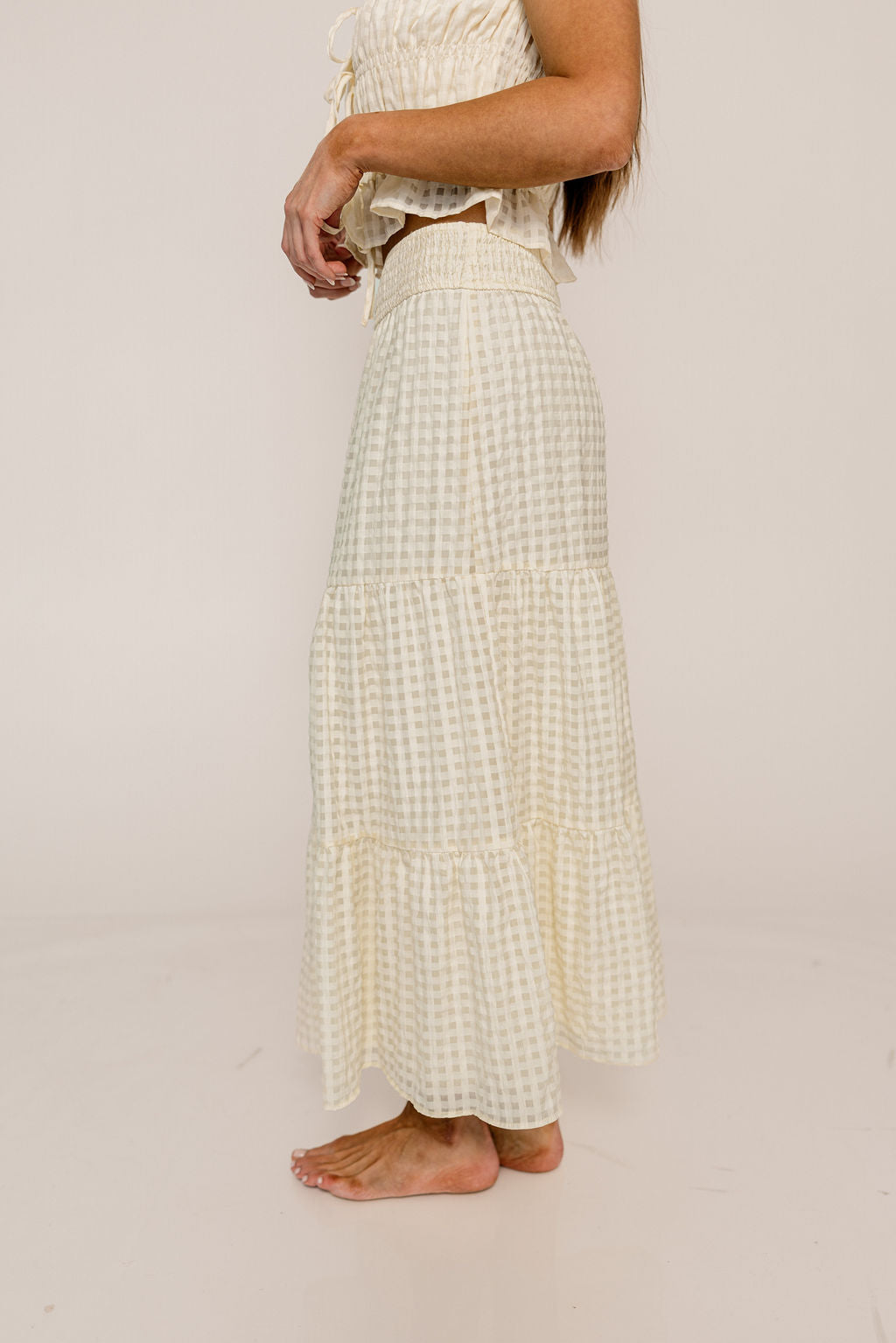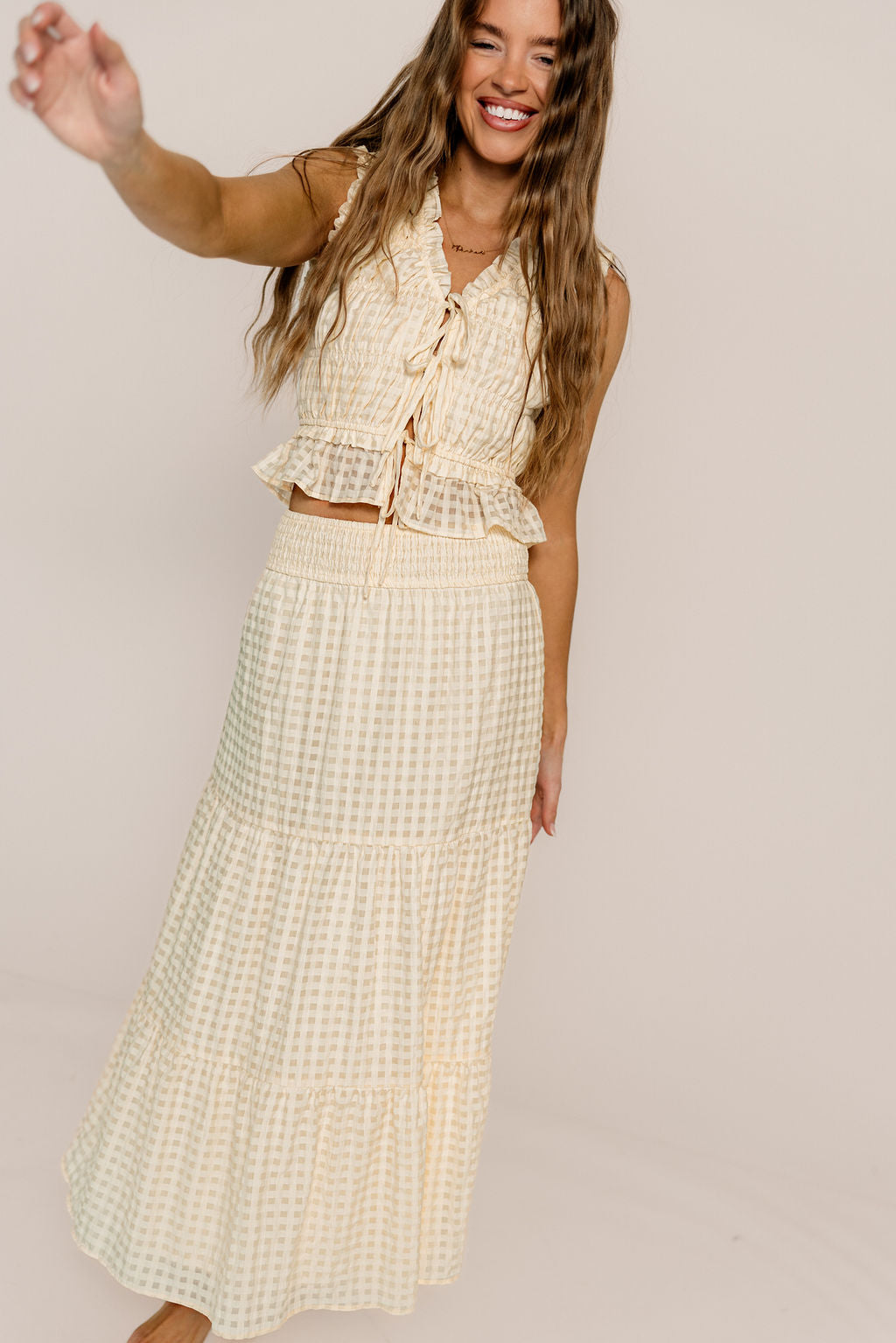 GARMENT DETAILS: Lightweight top and skirt set in a breathable, textured fabric. Top features a front tie closure, tiered peplum hem, and ruching, with ruffled edges. Skirt offers a tiered design and elasticated waistband.