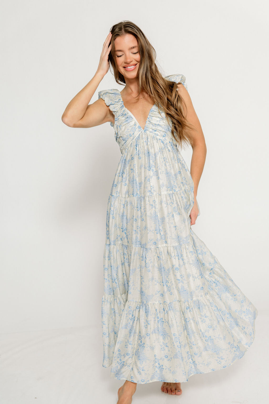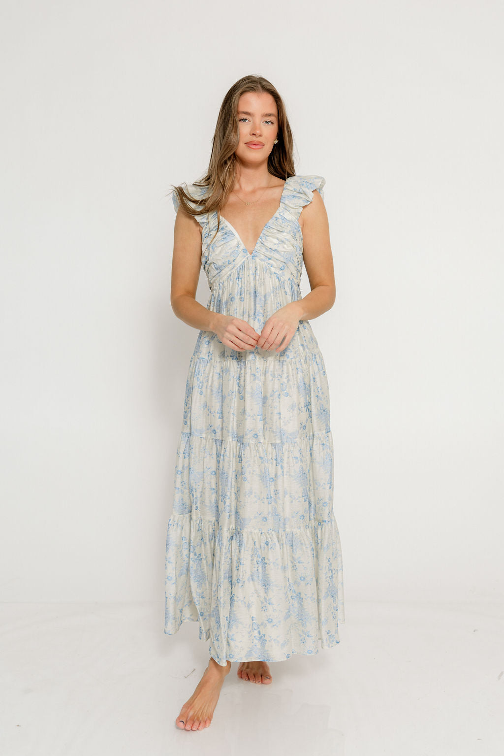 GARMENT DETAILS: Sleeveless, lightweight dress in a maxi length. Features a plunging V-neckline, with ruffled cap sleeves, pleated bodice, and stretchy, smocked back panel. Dress is constructed with an inverted empire waist, with a full, multi-tiered skirt. Partially lined.