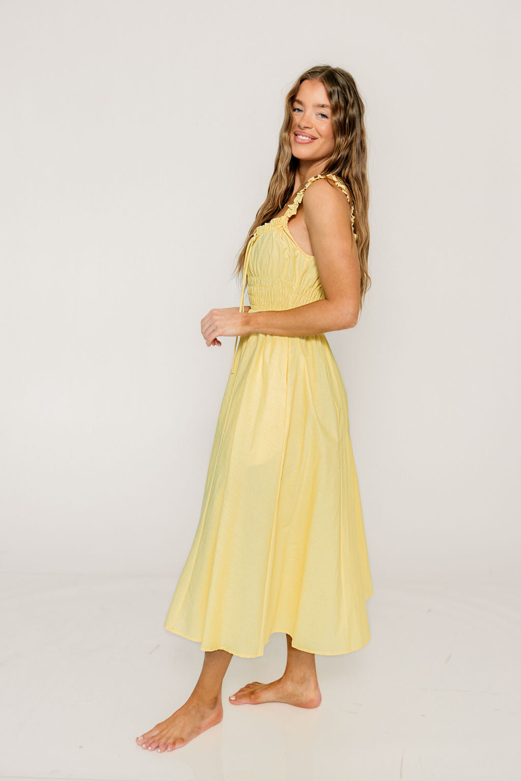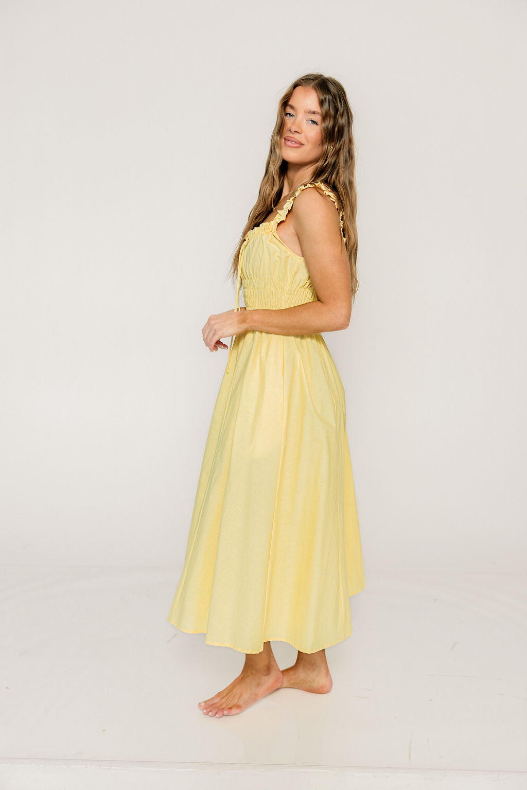 GARMENT DETAILS: Soft and feminine cotton-blend maxi dress with square neckline, sleeveless bodice, and gathered waist. Features a tie detail at neckline, with side pockets and ruffled edges.