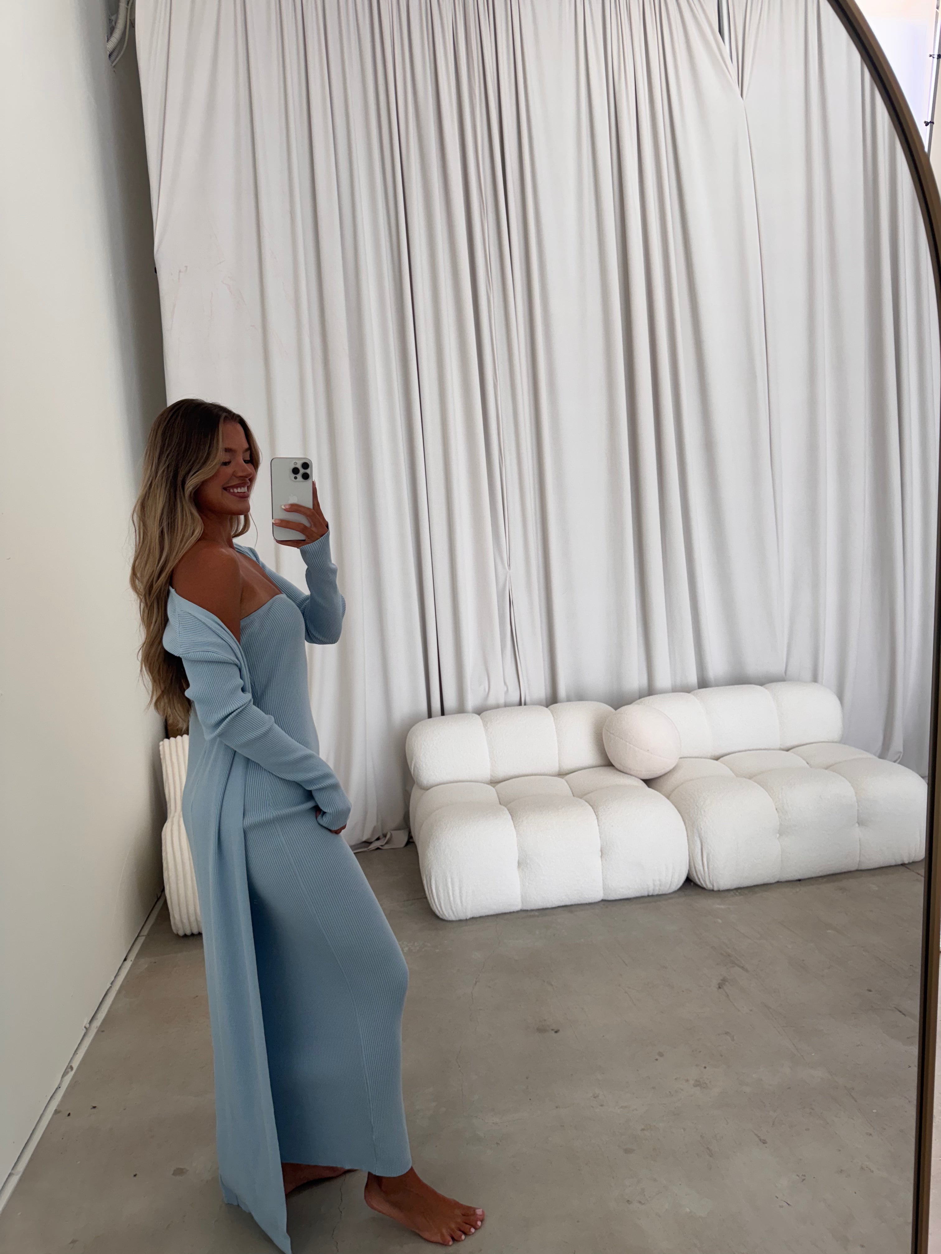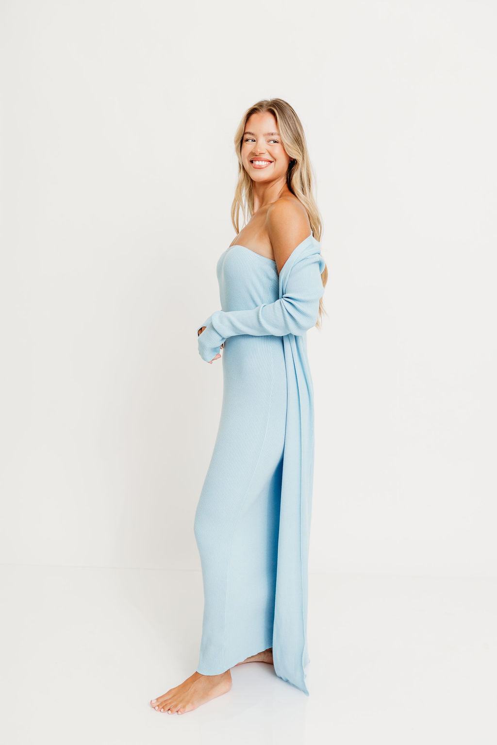 GARMENT DETAILS: Sleek and fitted maxi dress with strapless tube top design (includes gripping tape in the top), paired with a matching full-length open front cardigan with front sleeves. Both pieces are crafted from a luxuriously soft knit fabric.
