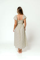 GARMENT DETAILS: Elegant cotton midi dress with square neckline, puffed short sleeves, and fully smocked bodice with drawstring detail. Features a flowy midi-length A-line skirt and delicate ruffle trim.