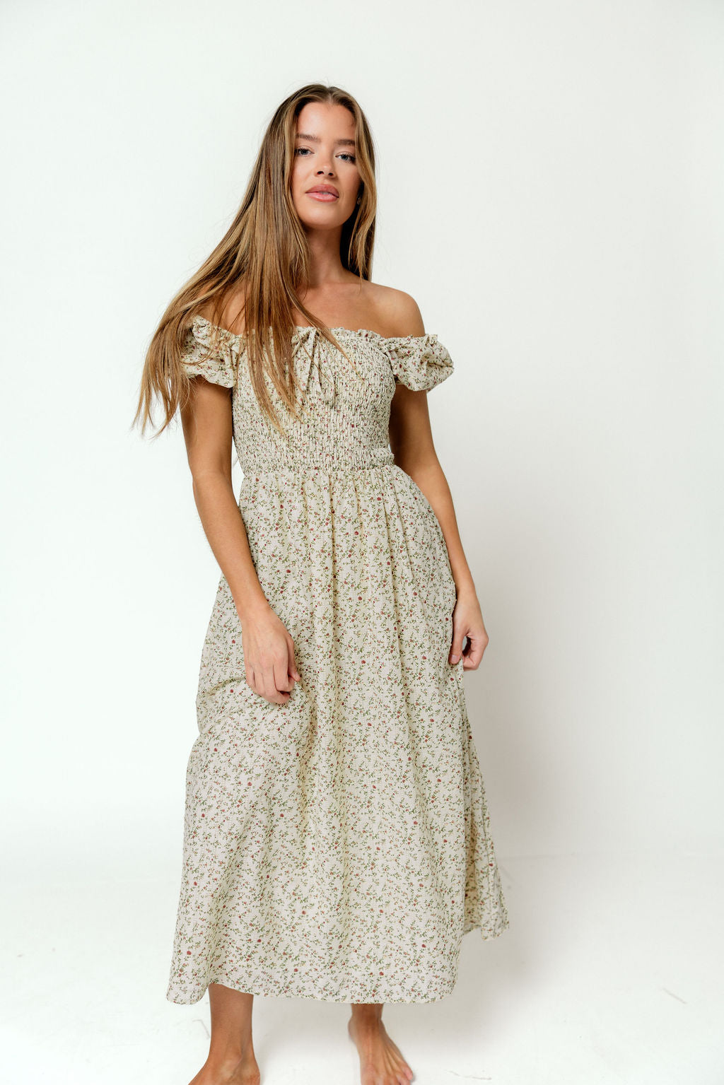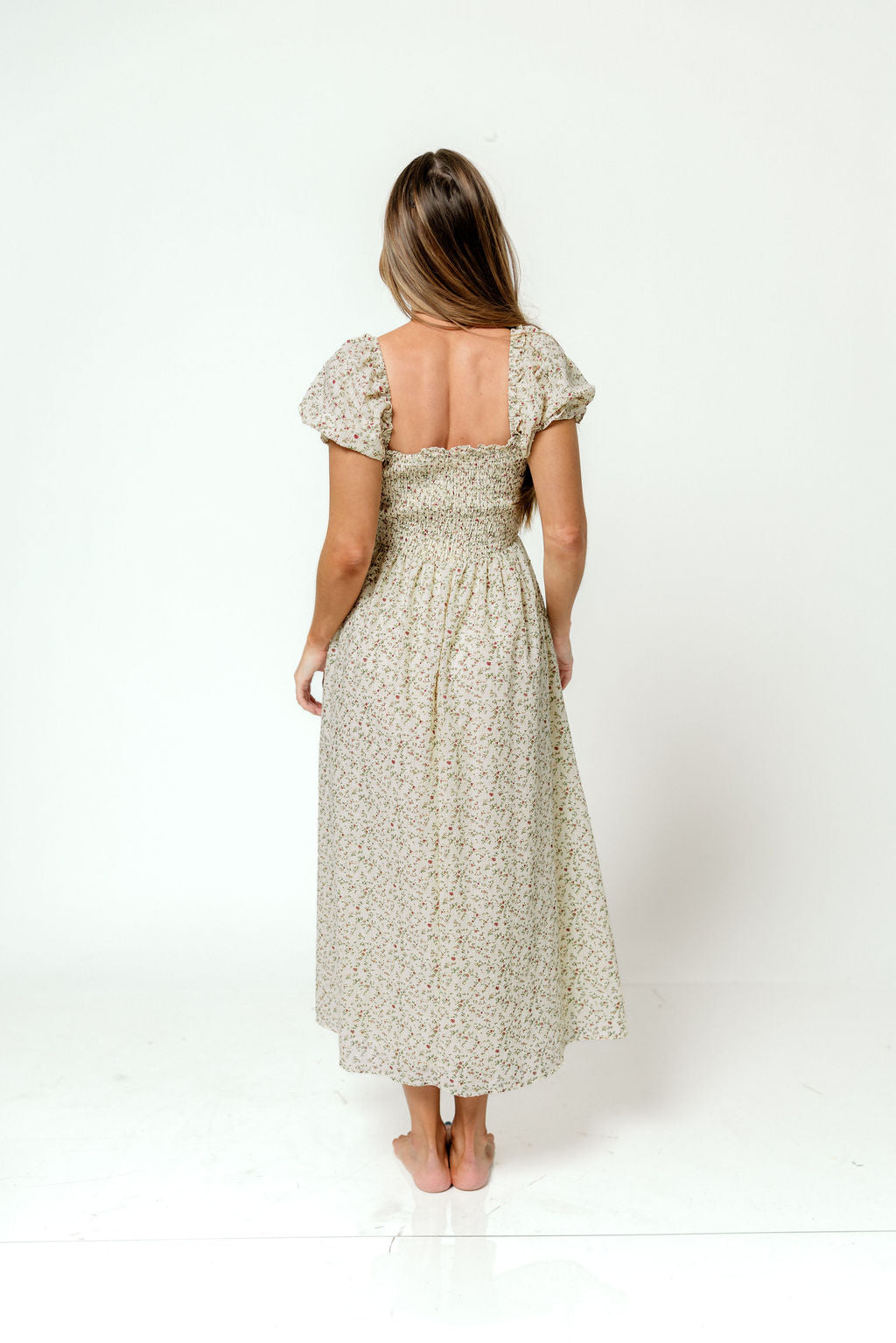 Nya 100% Cotton Smocked Midi Dress in Beige/Red Floral