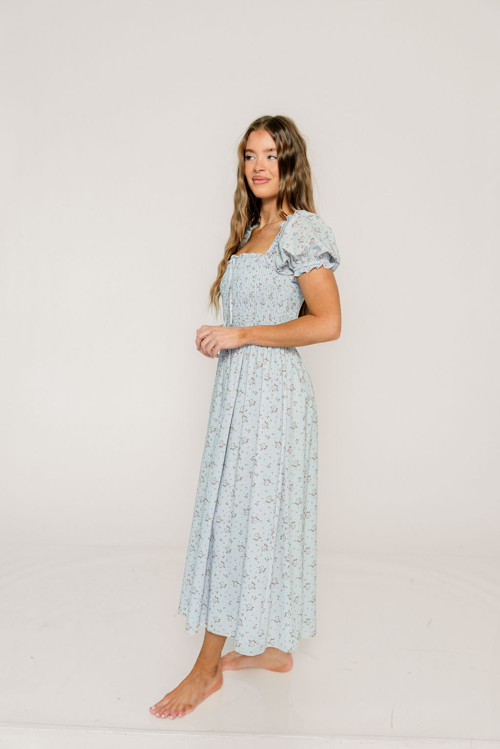 Nya 100% Cotton Smocked Midi Dress in Blue Multi Floral