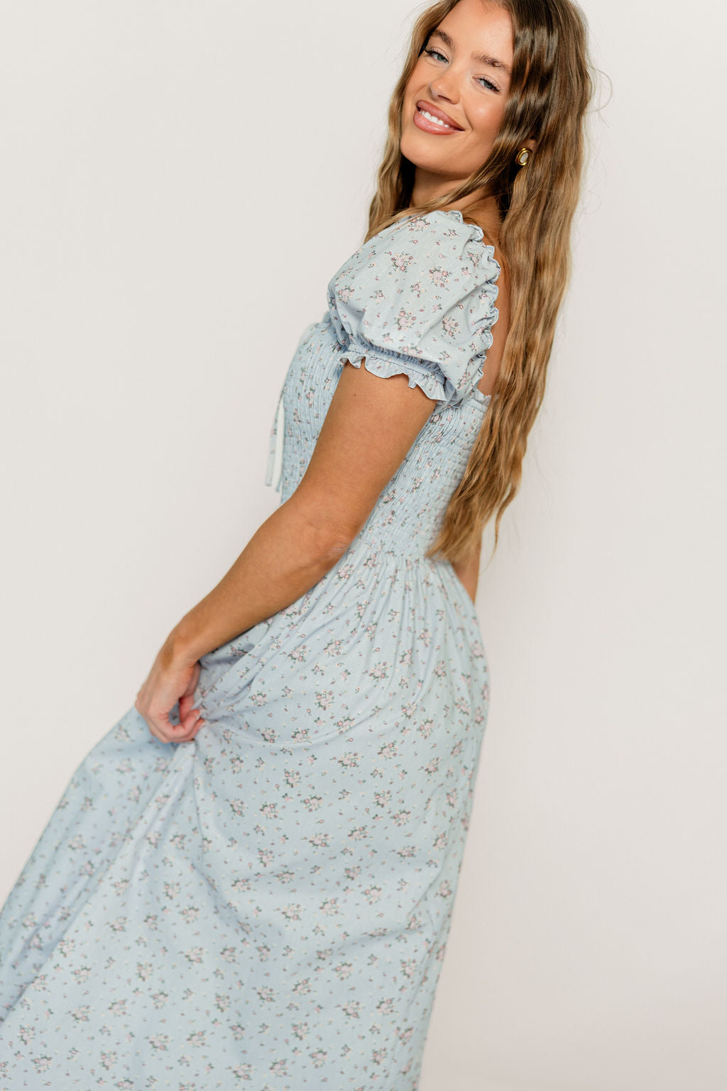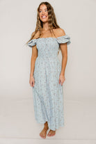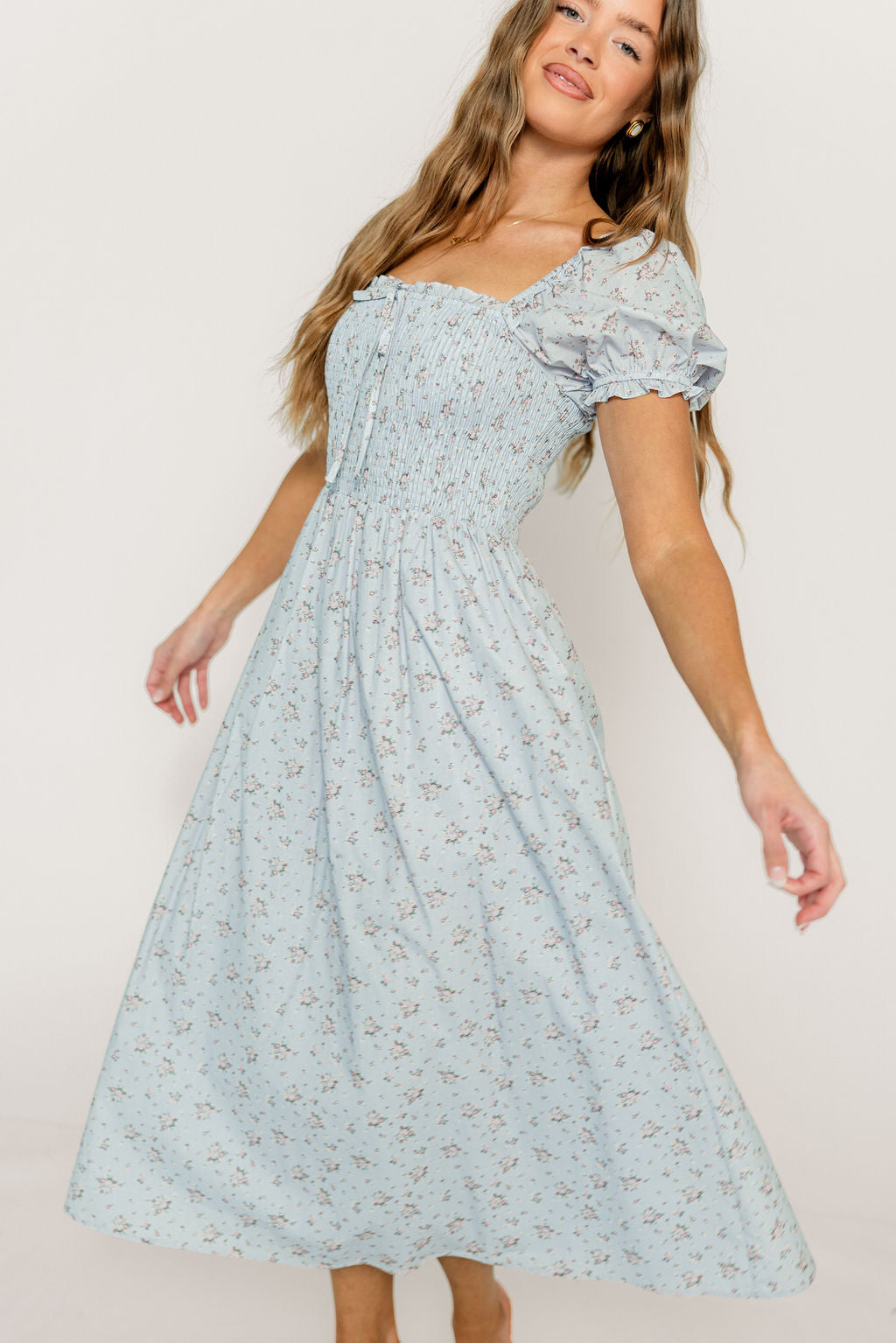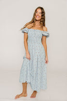 This effortless cotton midi charmingly feminine, with a dainty floral print and comfortable smocked design that shows off your curves and makes a subtle statement.